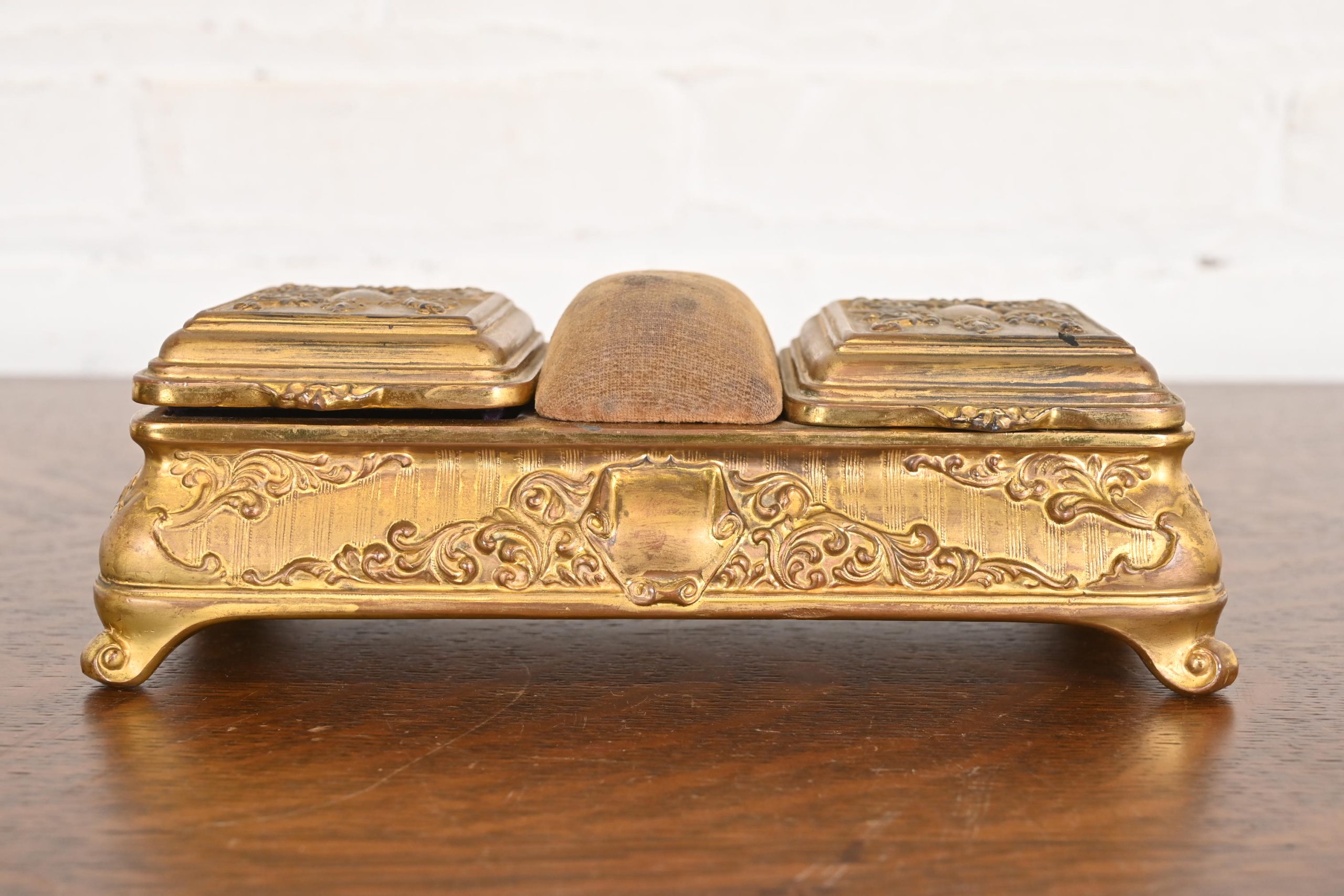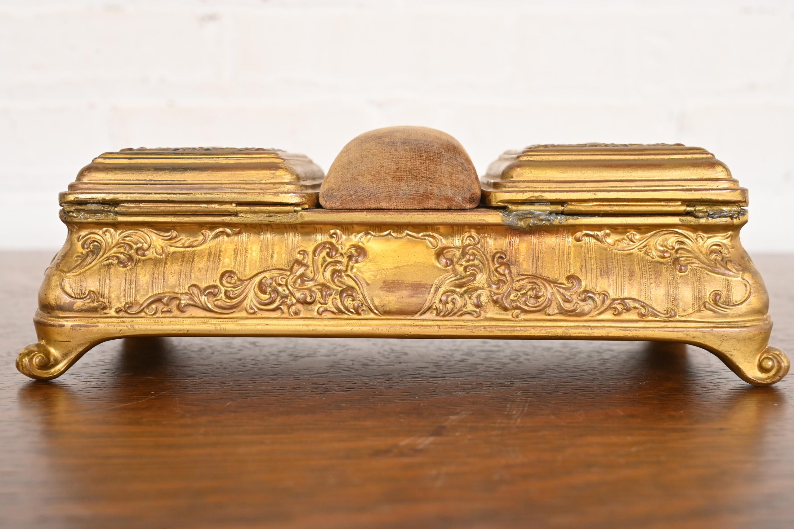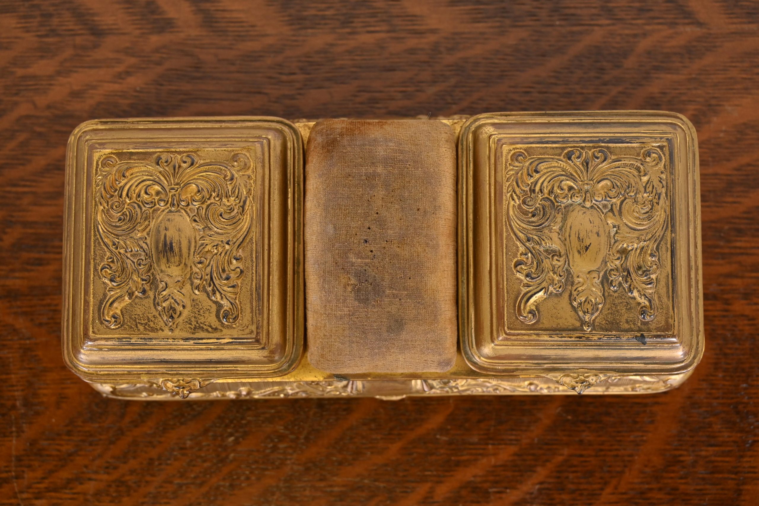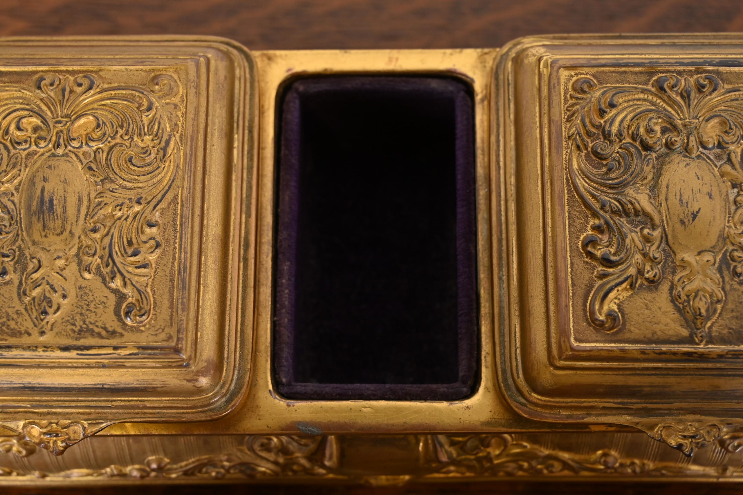 A gorgeous antique French Repousse gilt bronze three-compartment dresser box, jewelry box, or decorative box