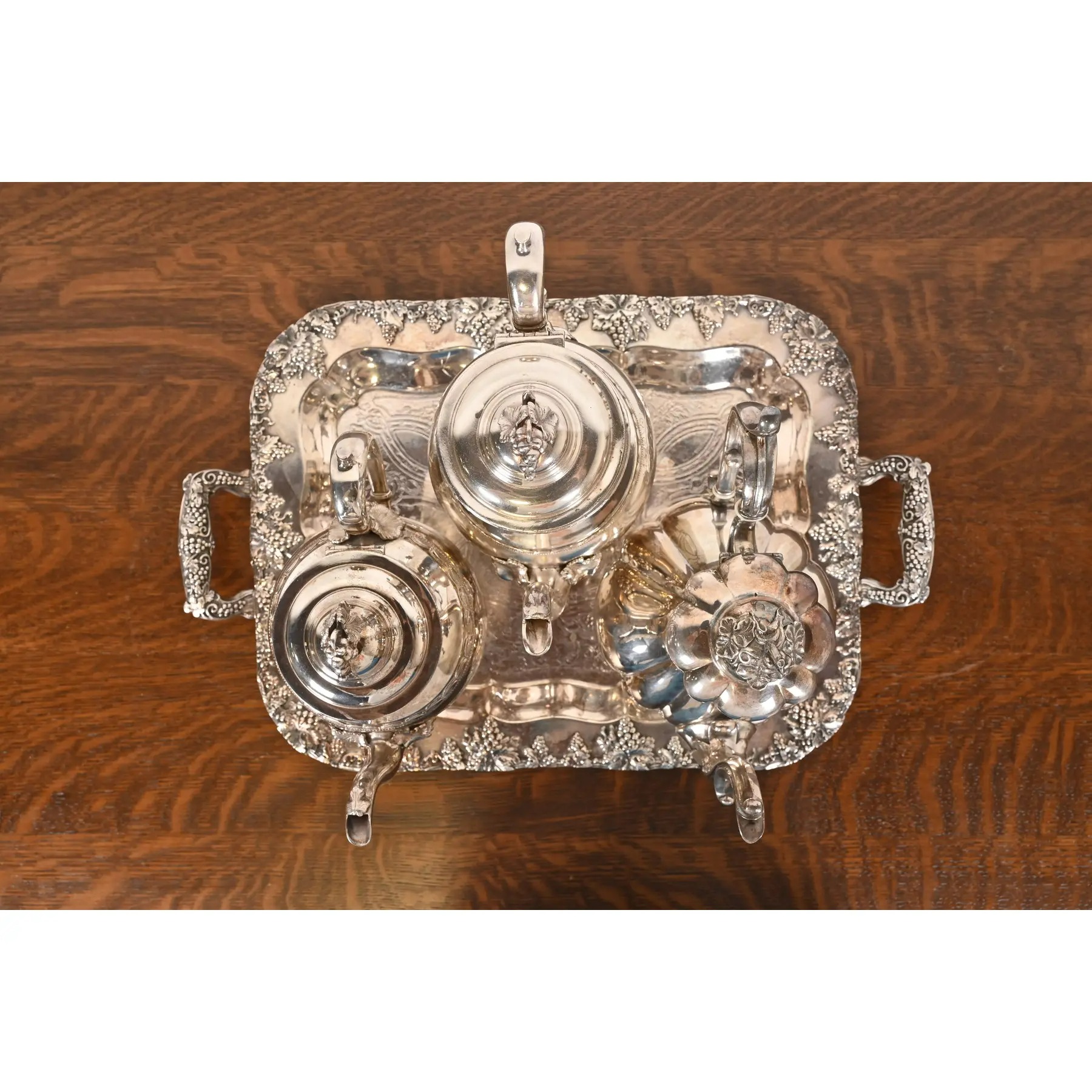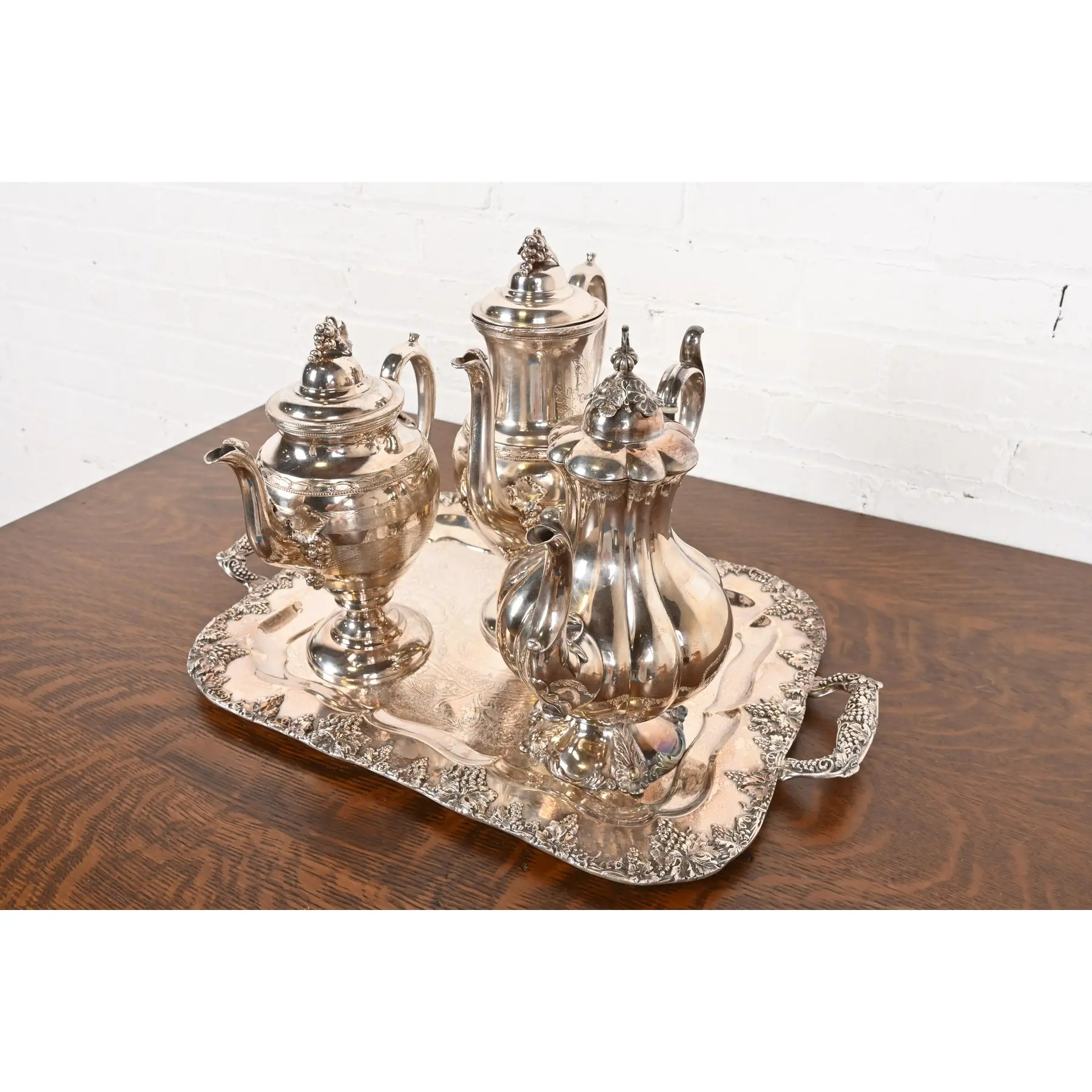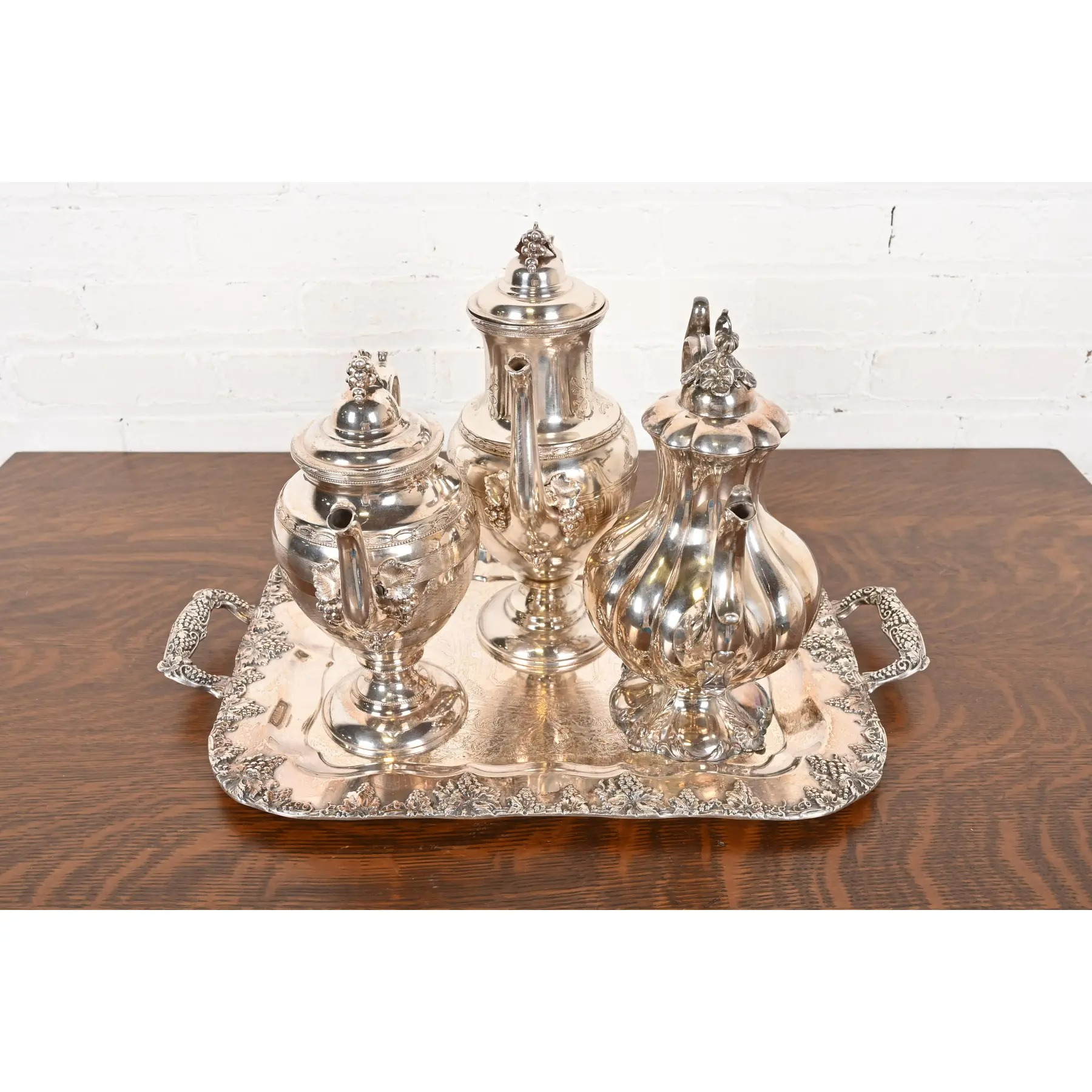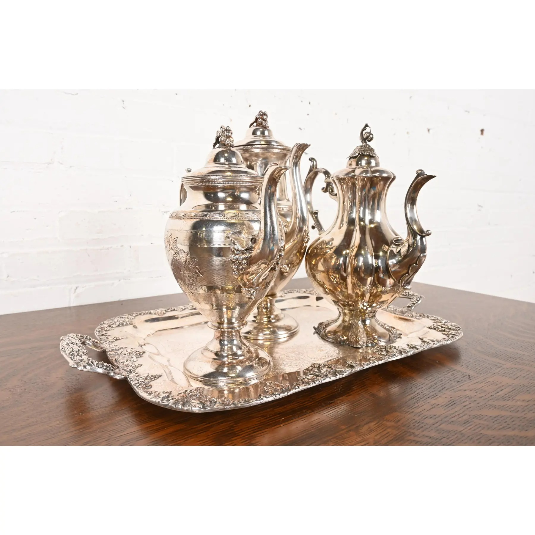 A gorgeous assembled antique Victorian silver plate service set, including three tea or coffee pots and a large serving tray.