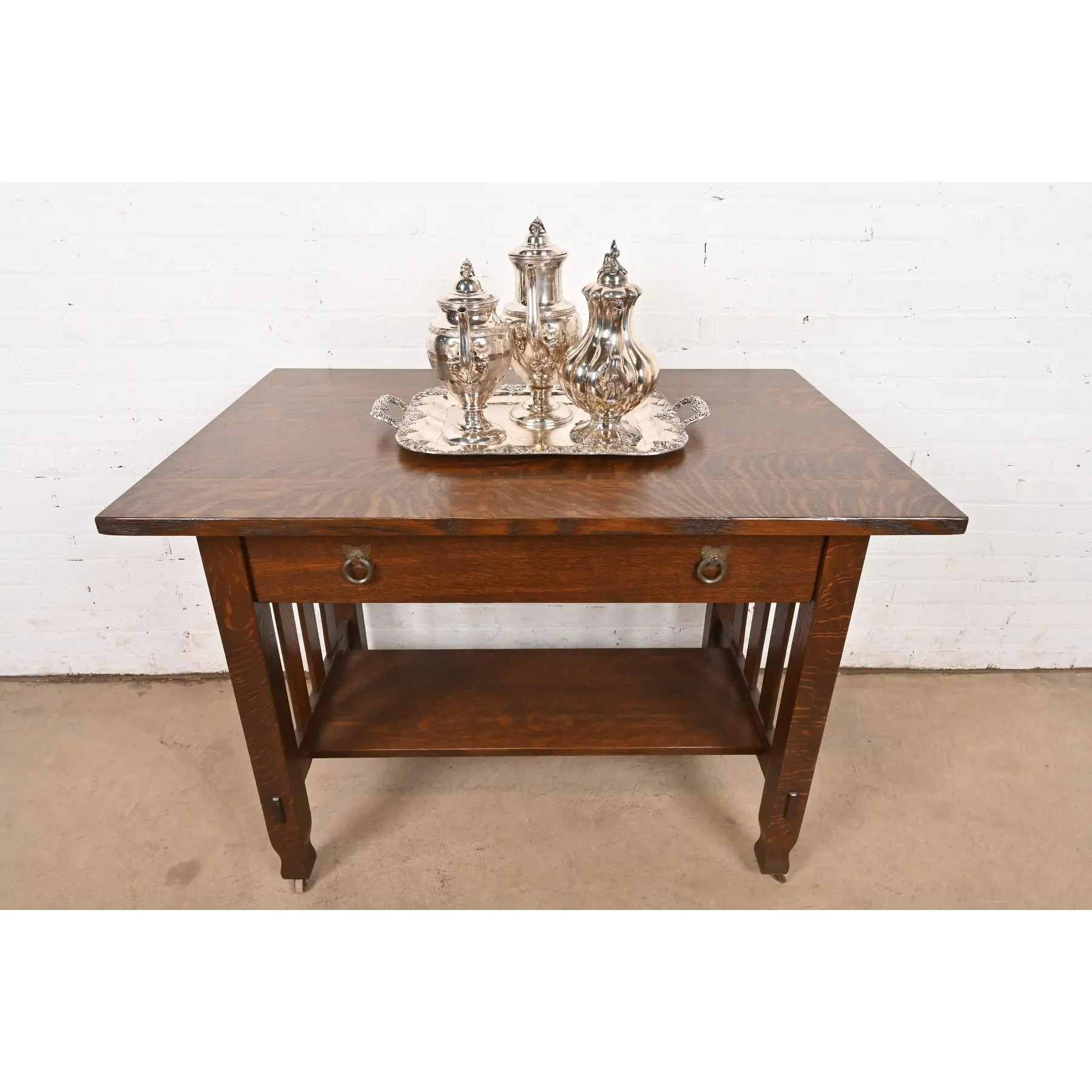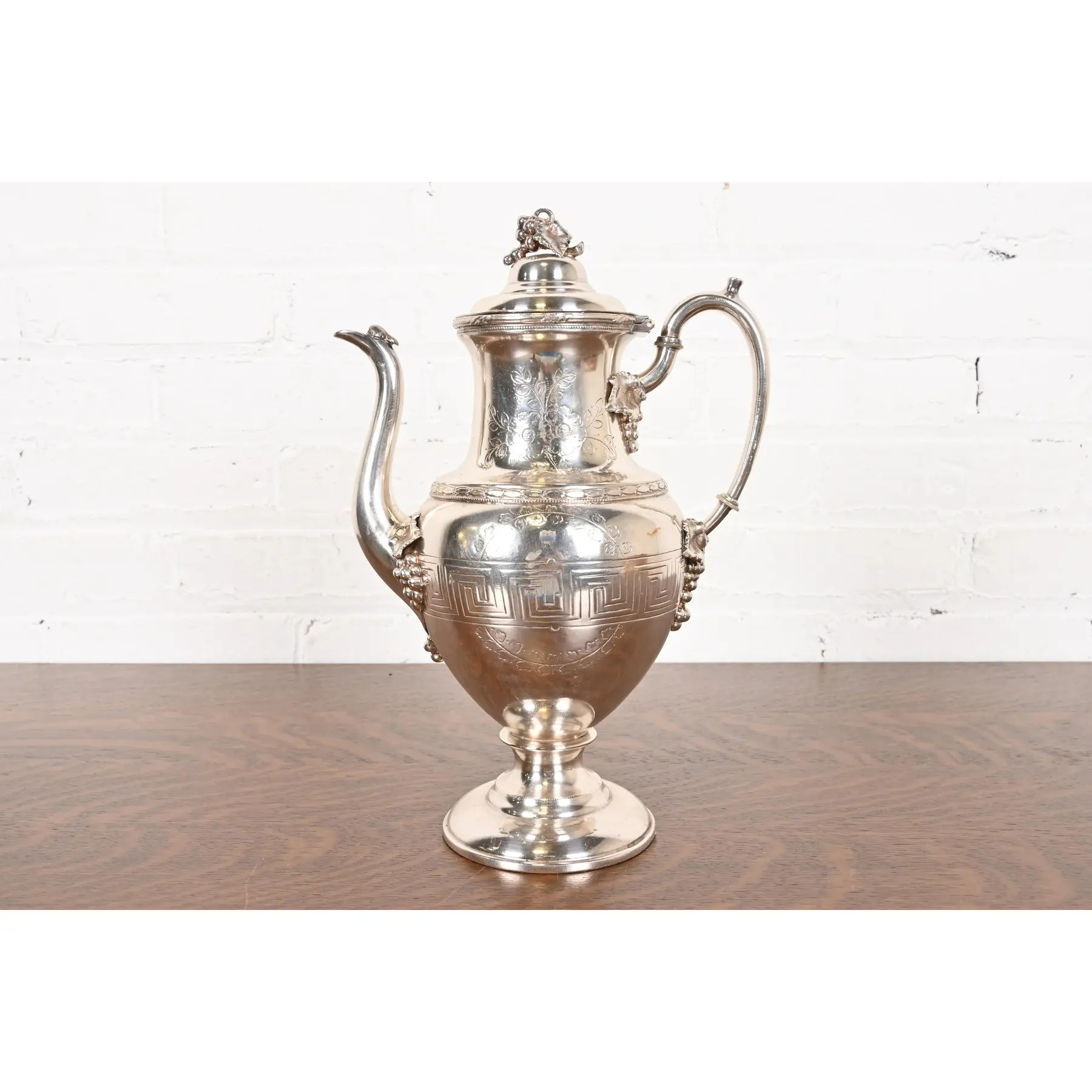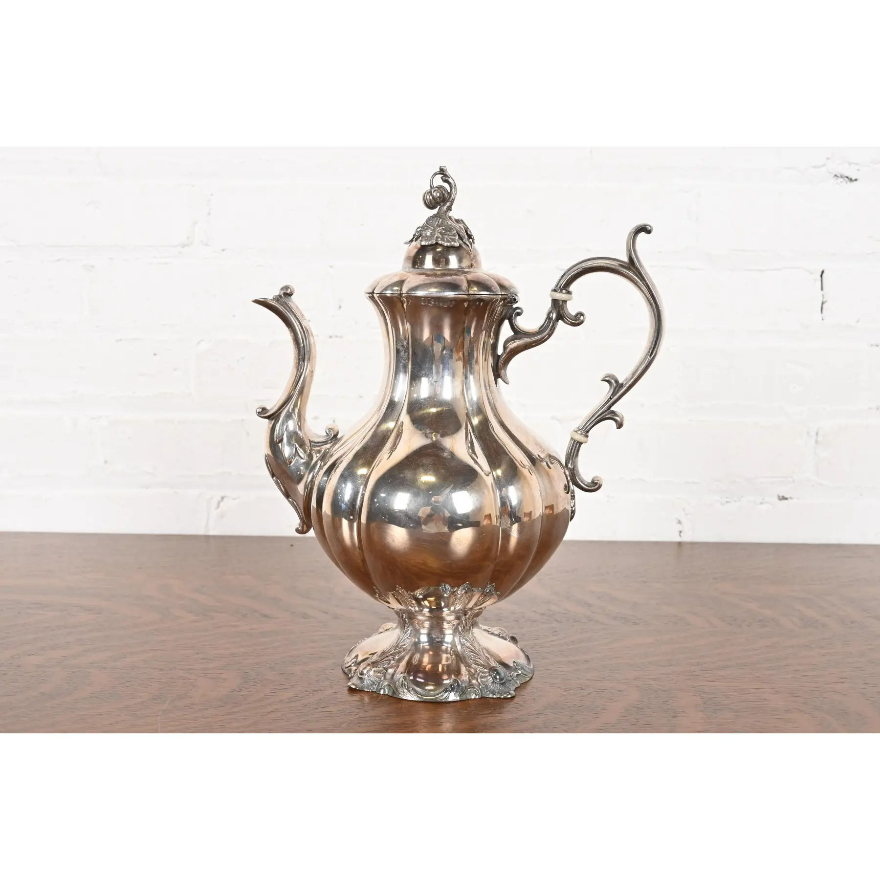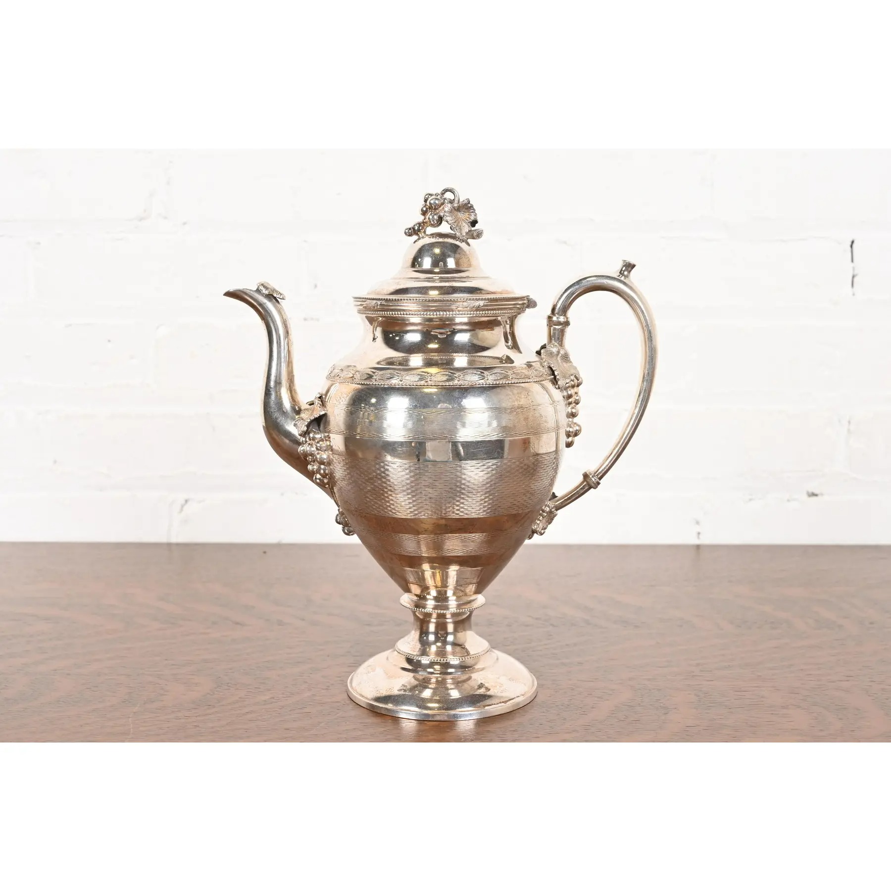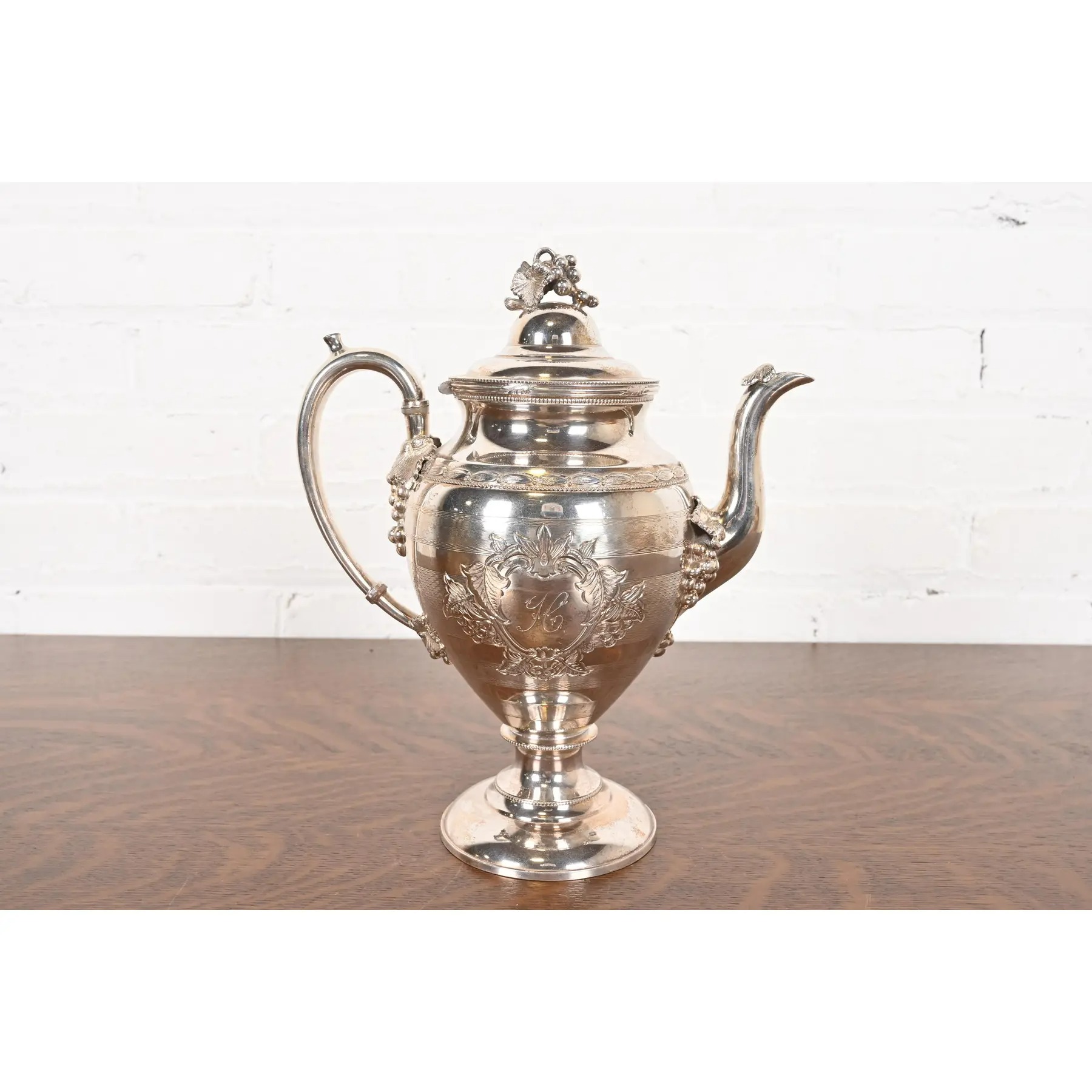 A gorgeous assembled antique Victorian silver plate service set, including three tea or coffee pots and a large serving tray.