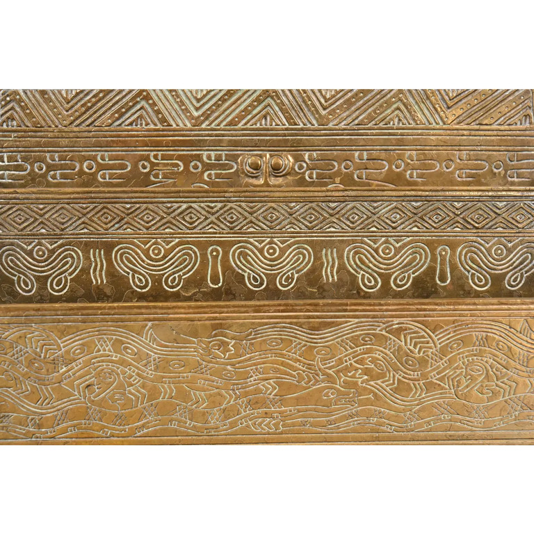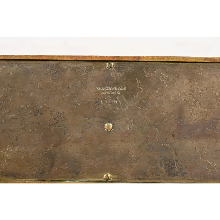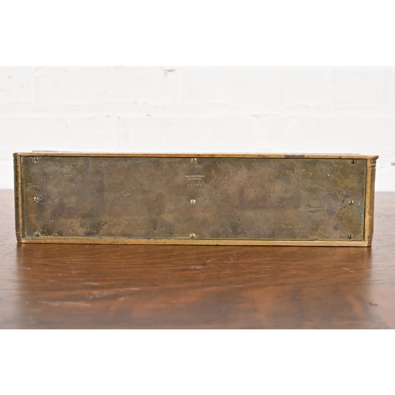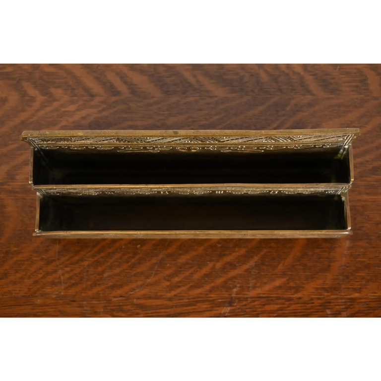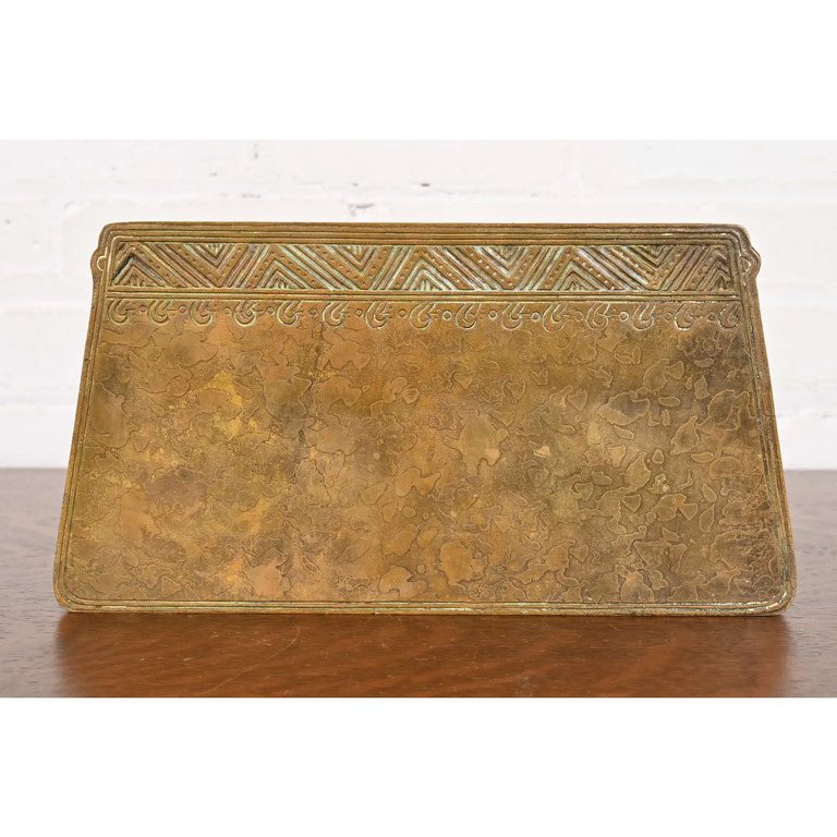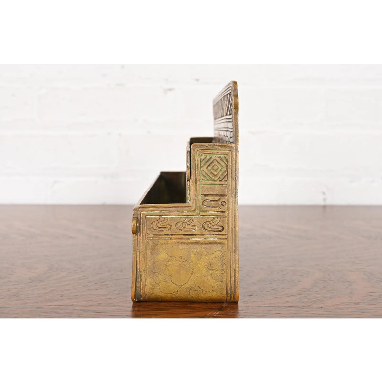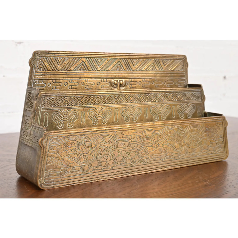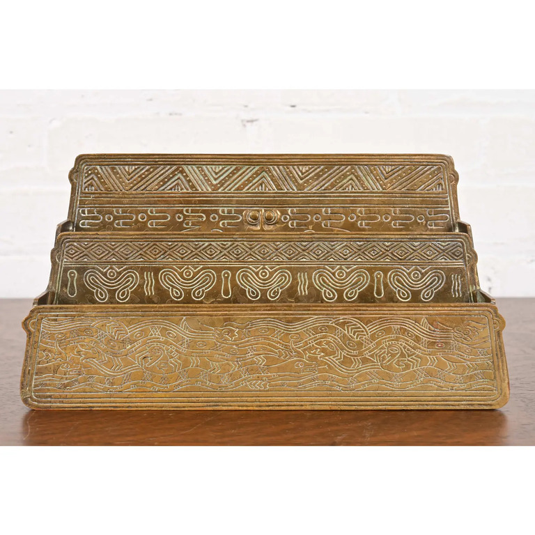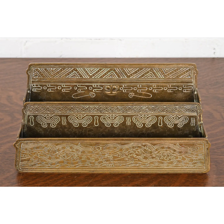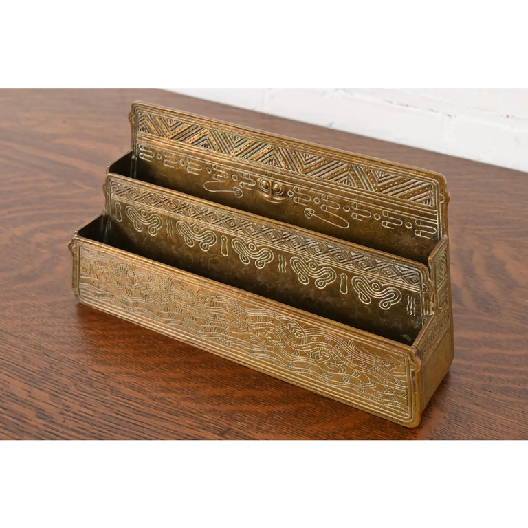 A gorgeous antique Arts & Crafts or Art Deco period gilt bronze “American Indian” pattern desk letter holder rack