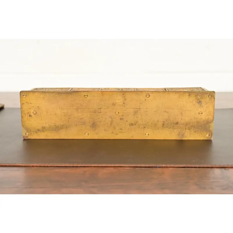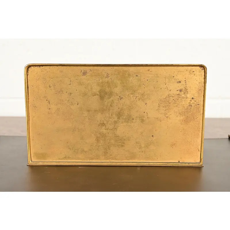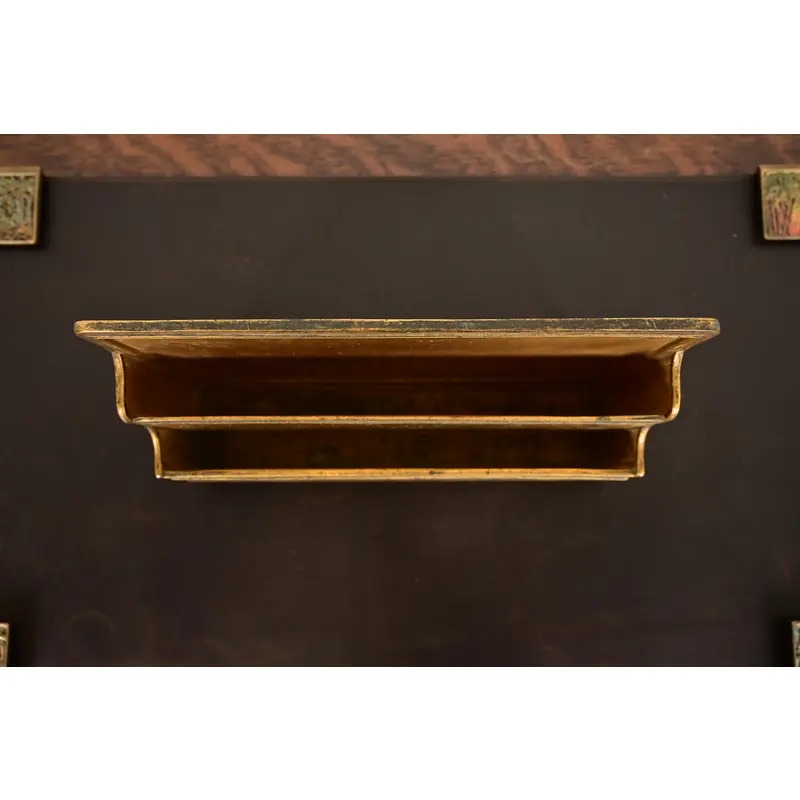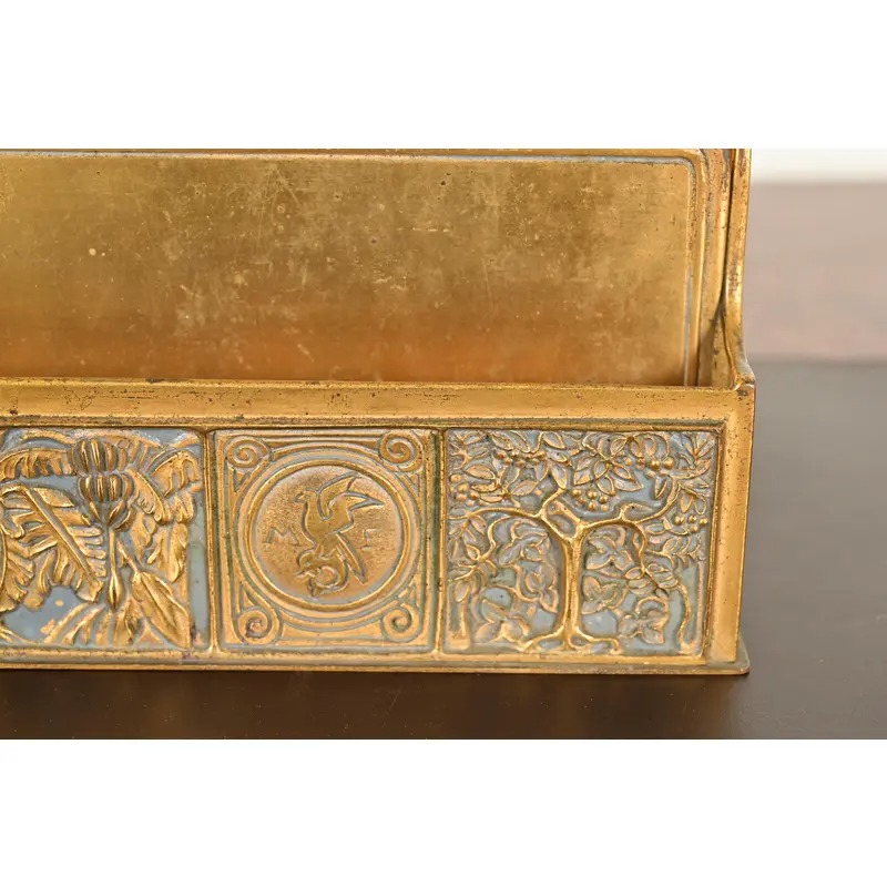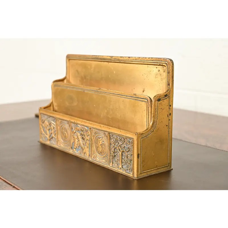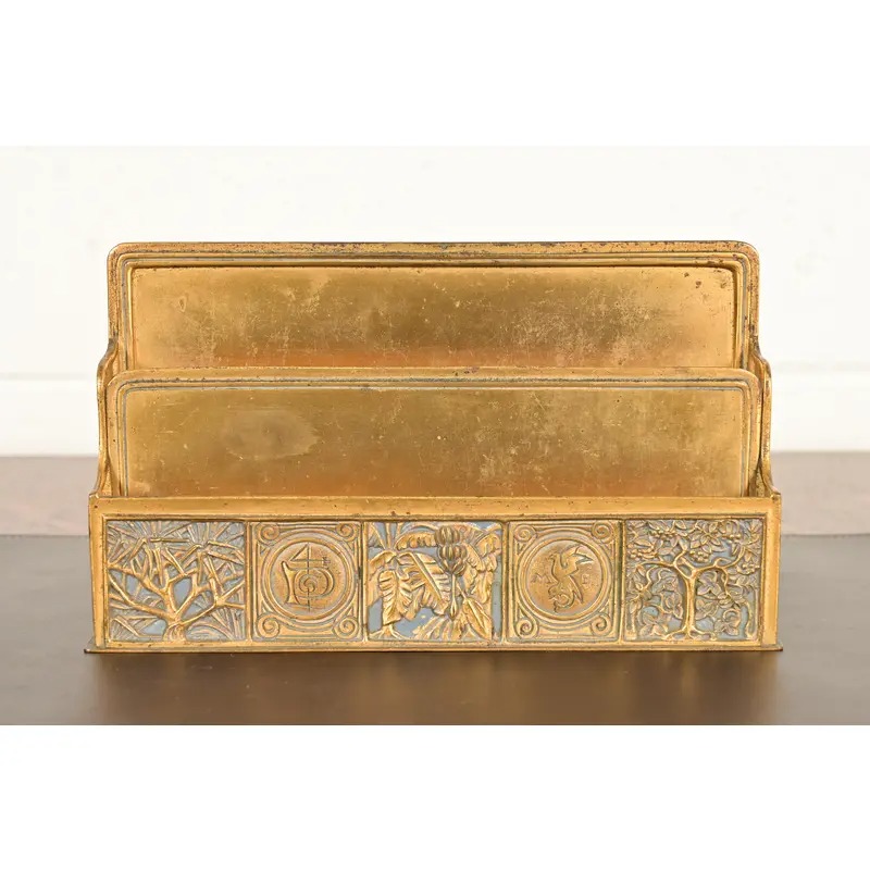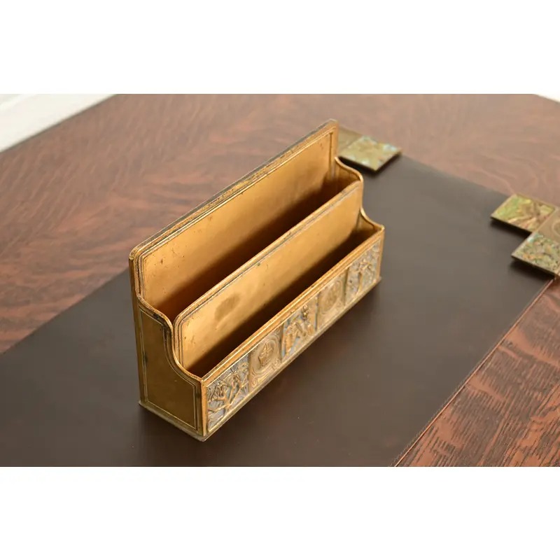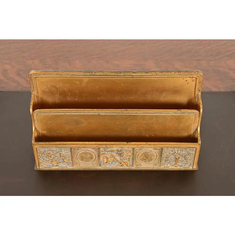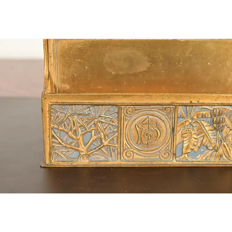 A gorgeous antique Arts & Crafts period “Bookmark” pattern gilt bronze and enamel desk letter rack