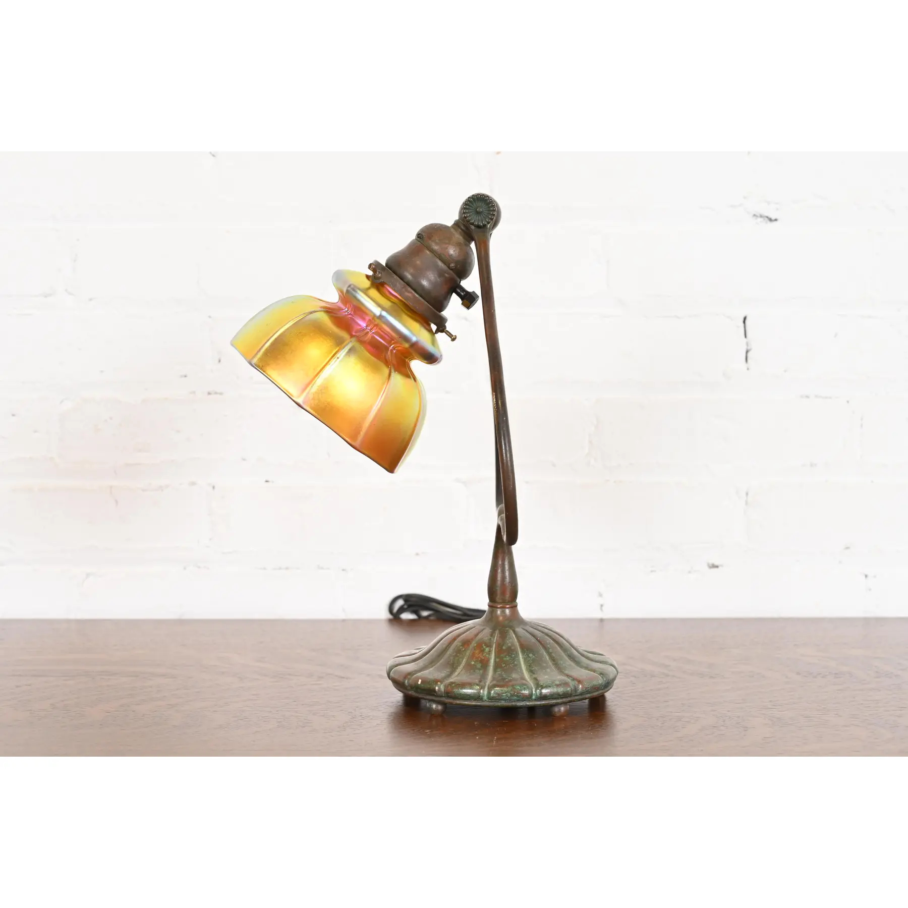 Patinated bronze base, with beautiful iridescent Favrile art glass shade.