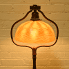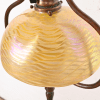 Patinated bronze harp form stand, with tripod base with spade feet, and stunning golden Damascene Favrile glass dome shade.