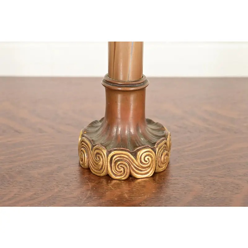 A gorgeous antique Arts & Crafts or Art Nouveau period Favrile iridescent art glass tall bud vase on gilt bronze stand