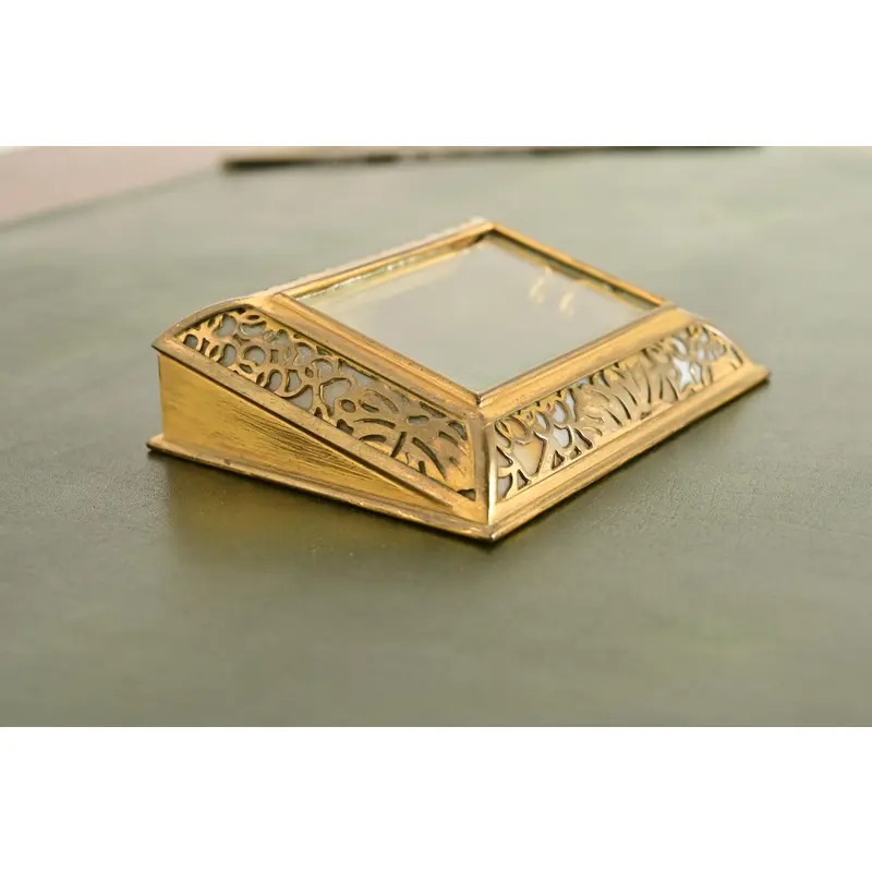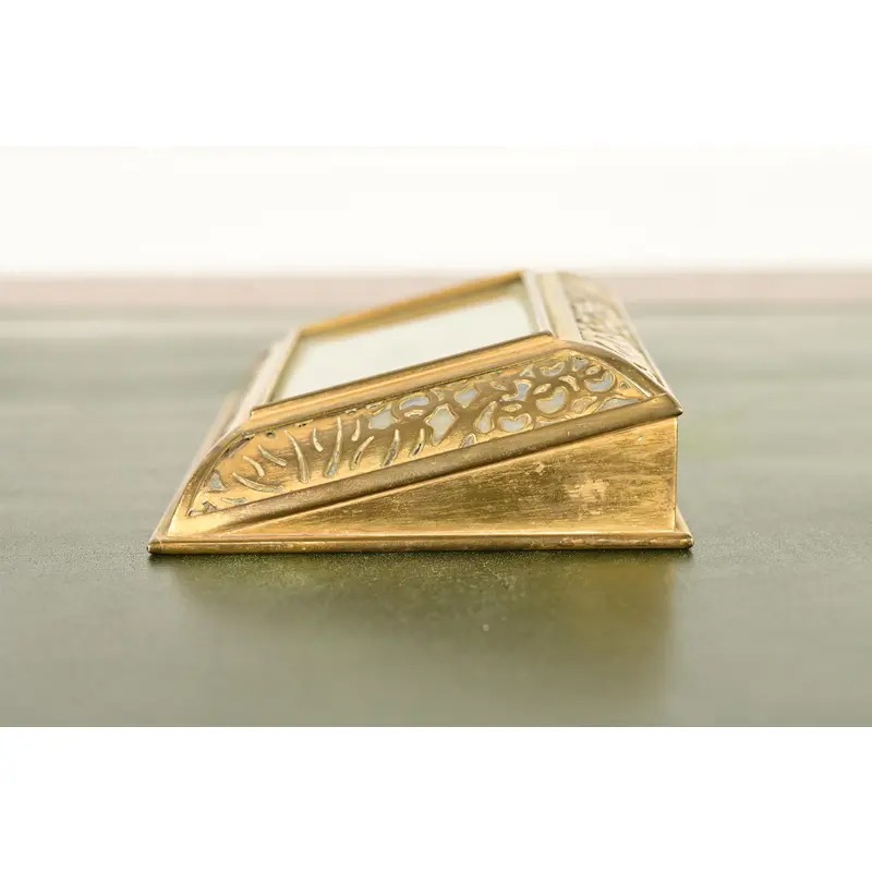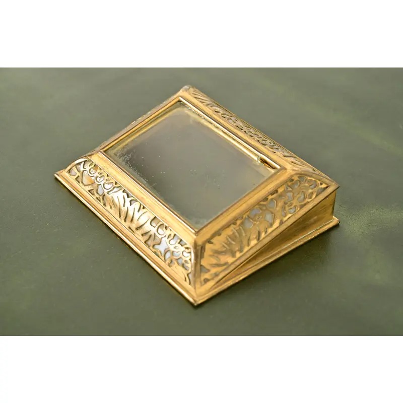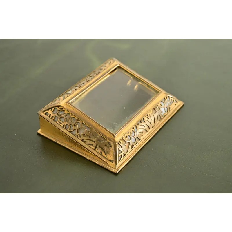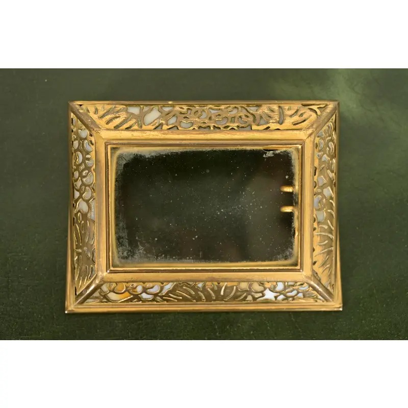 A gorgeous antique Arts & Crafts or Art Deco period “Grapevine” pattern gilt bronze and Favrile slag glass desk calendar holder or picture frame