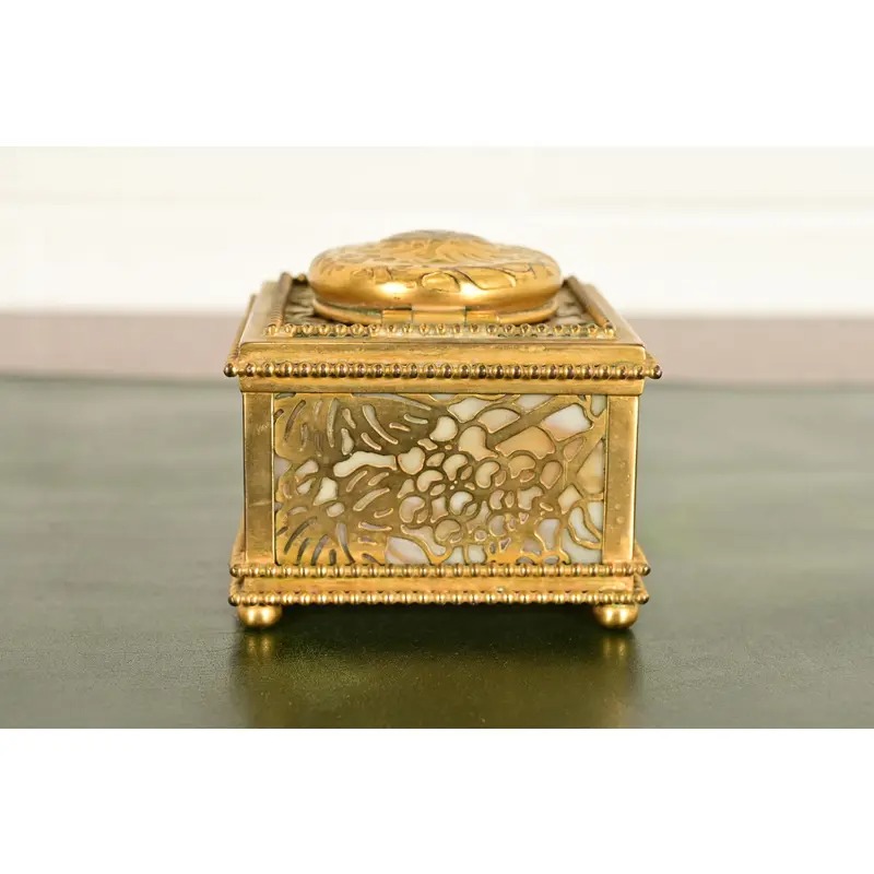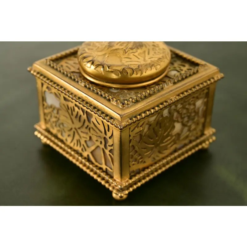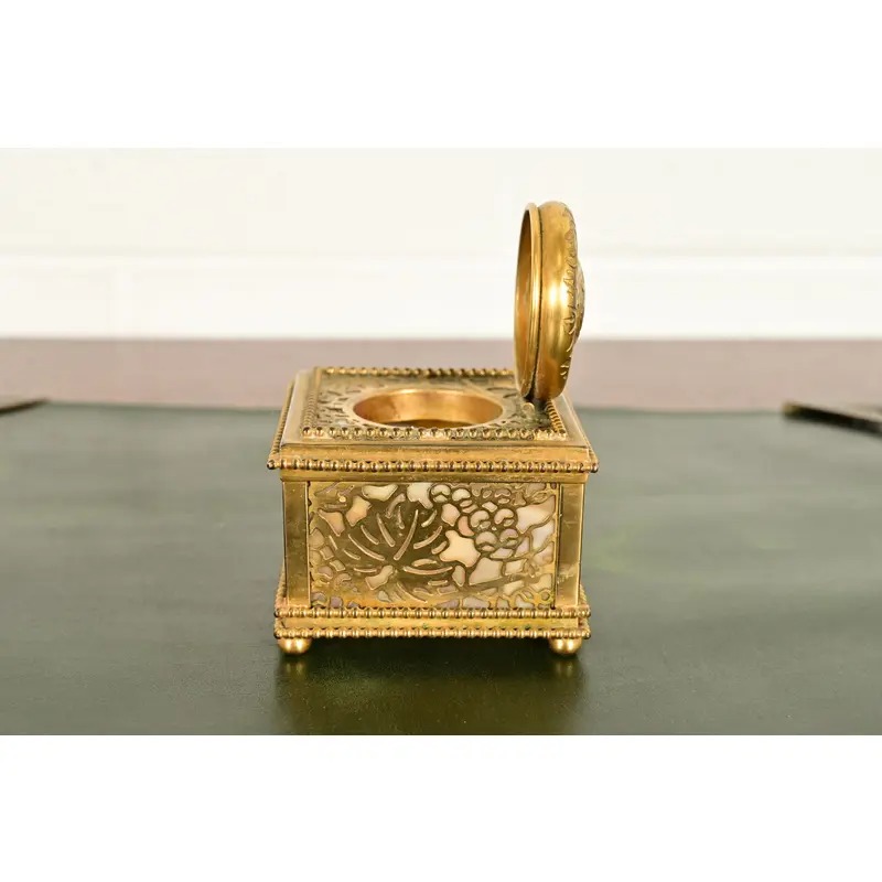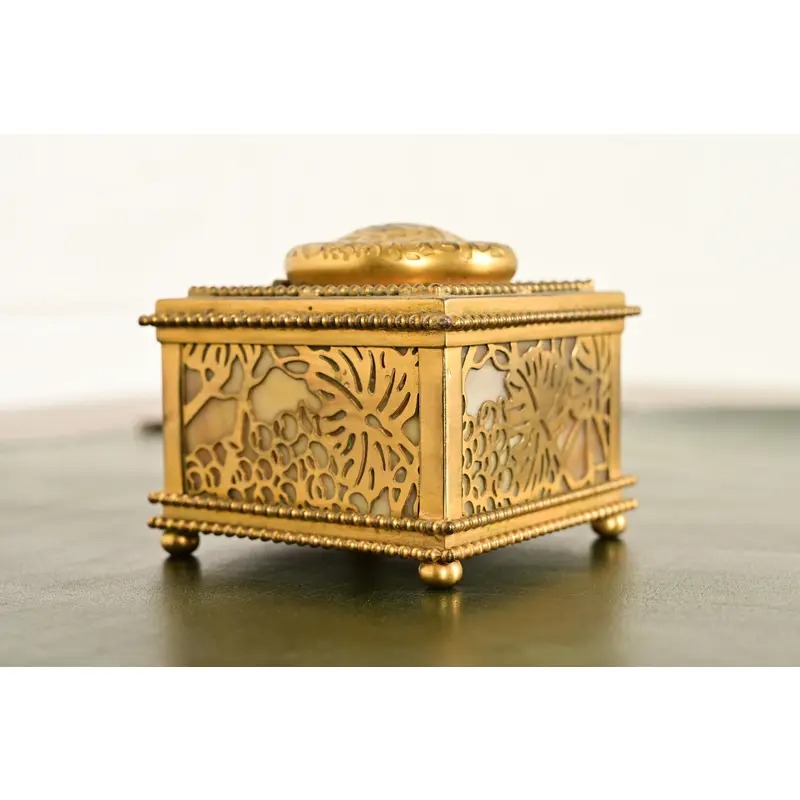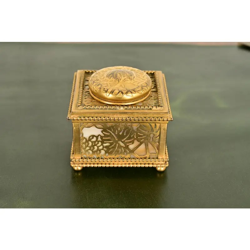 A gorgeous Arts & Crafts or Art Deco period “Grapevine” pattern gilt bronze and Favrile slag glass inkwell