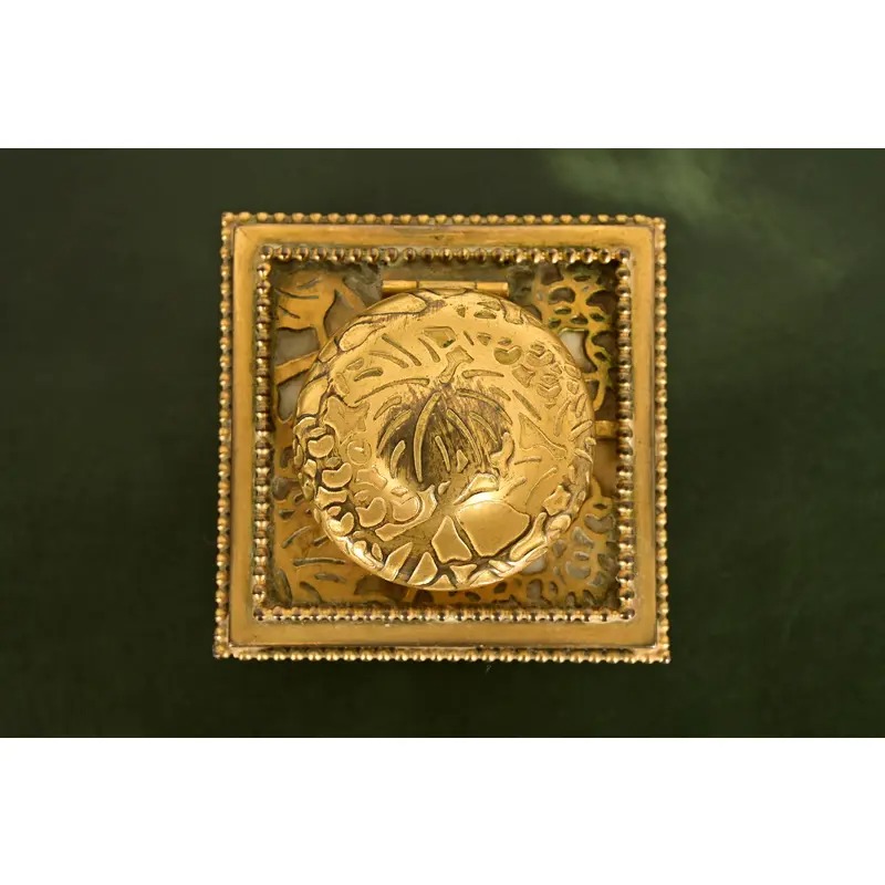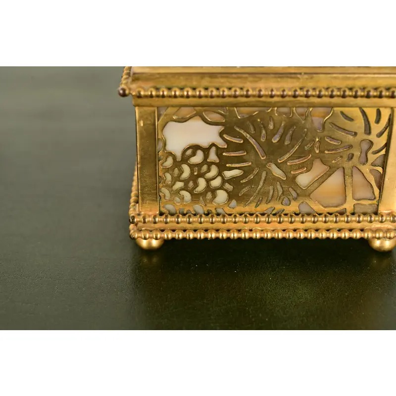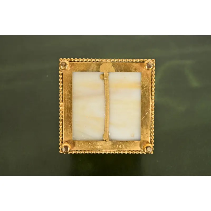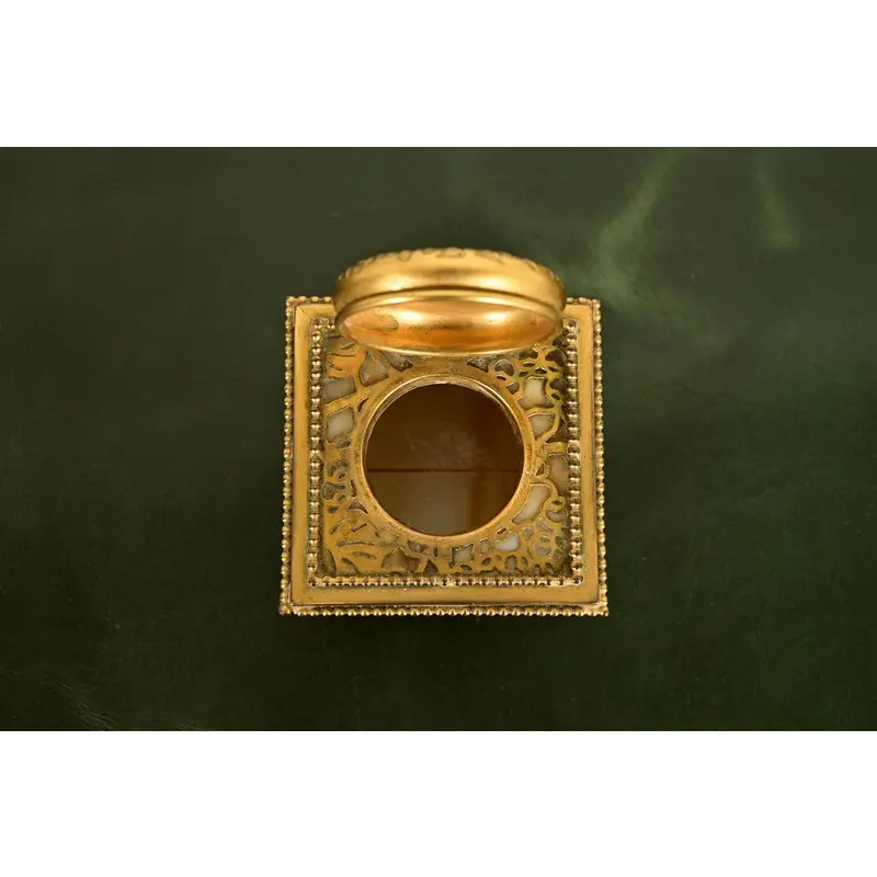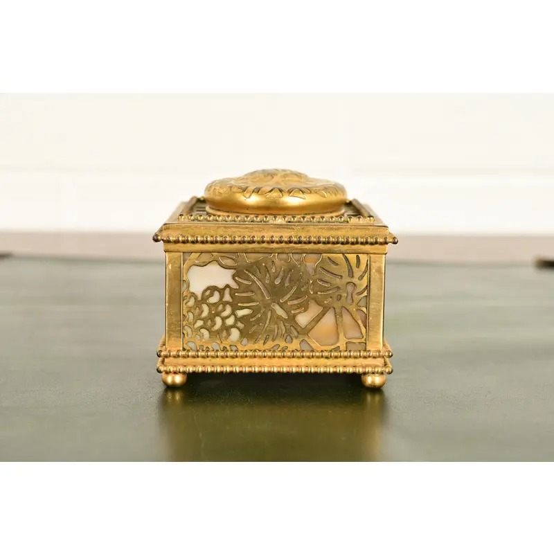 A gorgeous Arts & Crafts or Art Deco period “Grapevine” pattern gilt bronze and Favrile slag glass inkwell