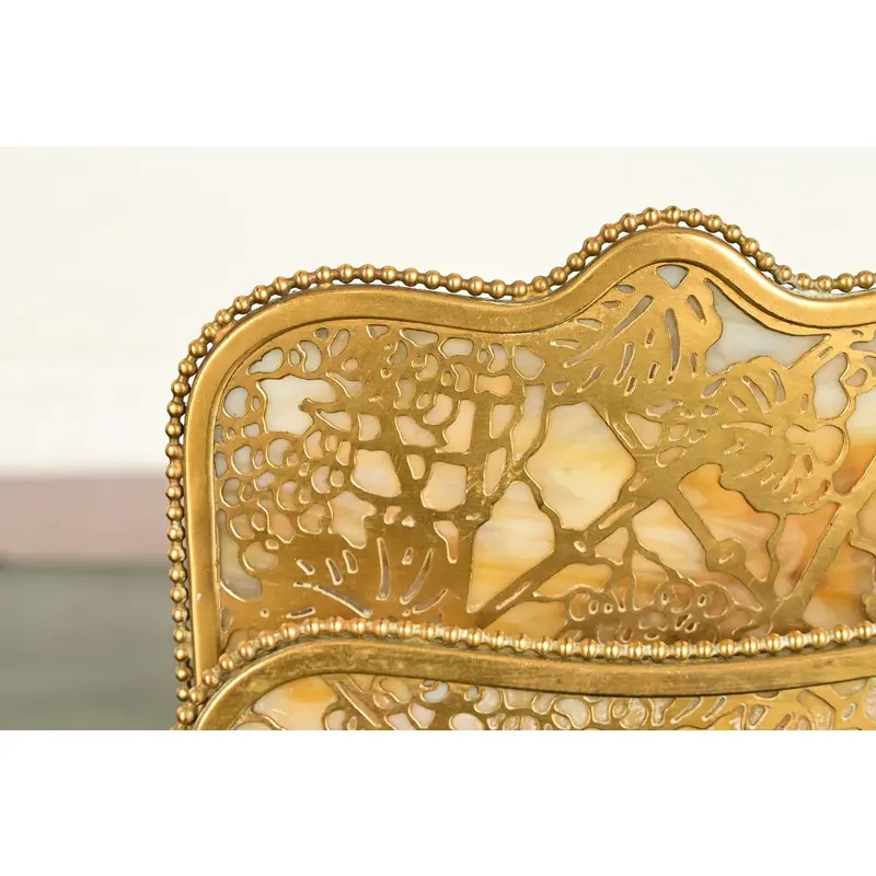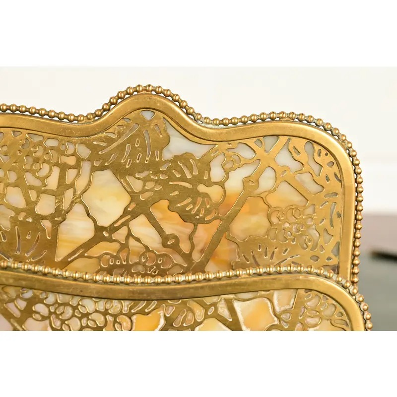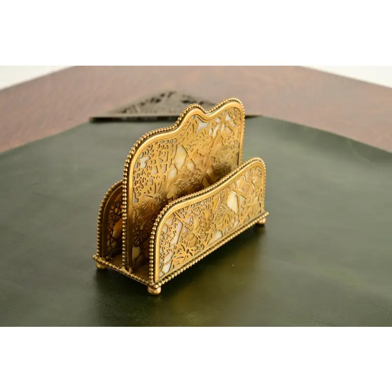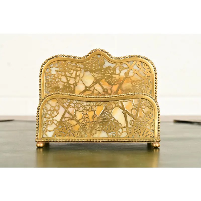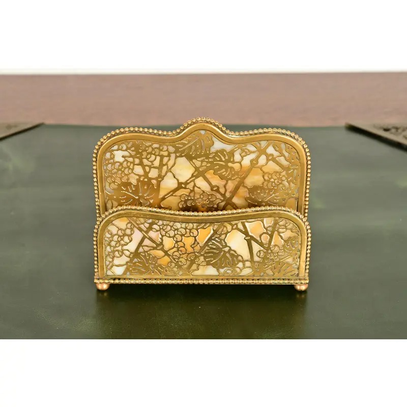A gorgeous antique Arts & Crafts or Art Deco period gilt bronze and Favrile slag glass “Grapevine” pattern desk letter holder rack