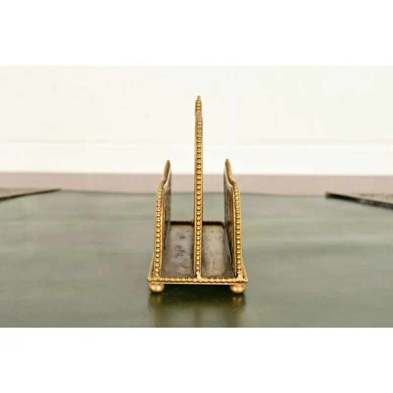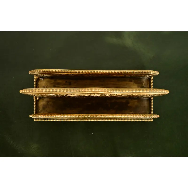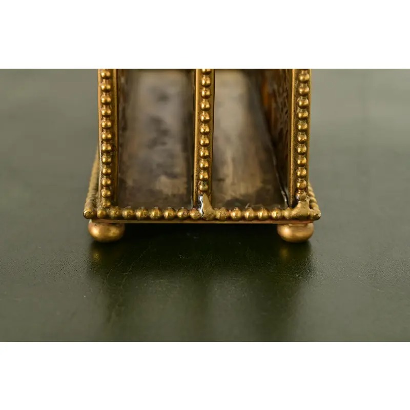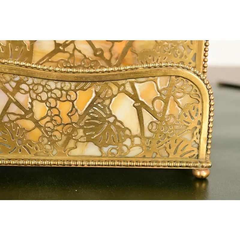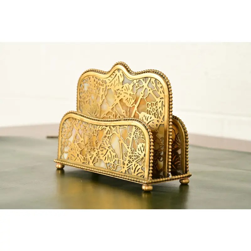 A gorgeous antique Arts & Crafts or Art Deco period gilt bronze and Favrile slag glass “Grapevine” pattern desk letter holder rack