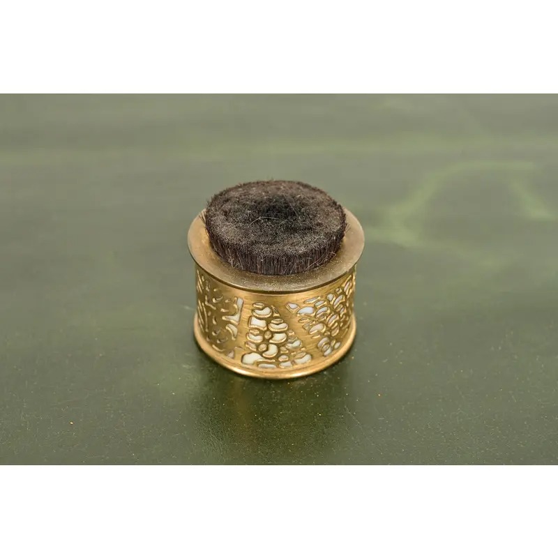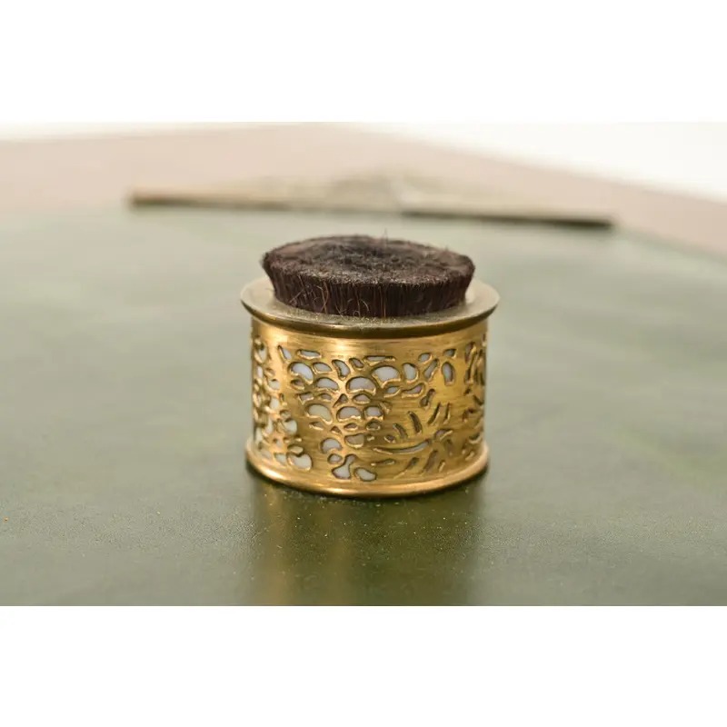 A gorgeous antique Arts & Crafts or Art Deco period “Grapevine” pattern gilt bronze and Favrile slag glass pen brush or pen wipe