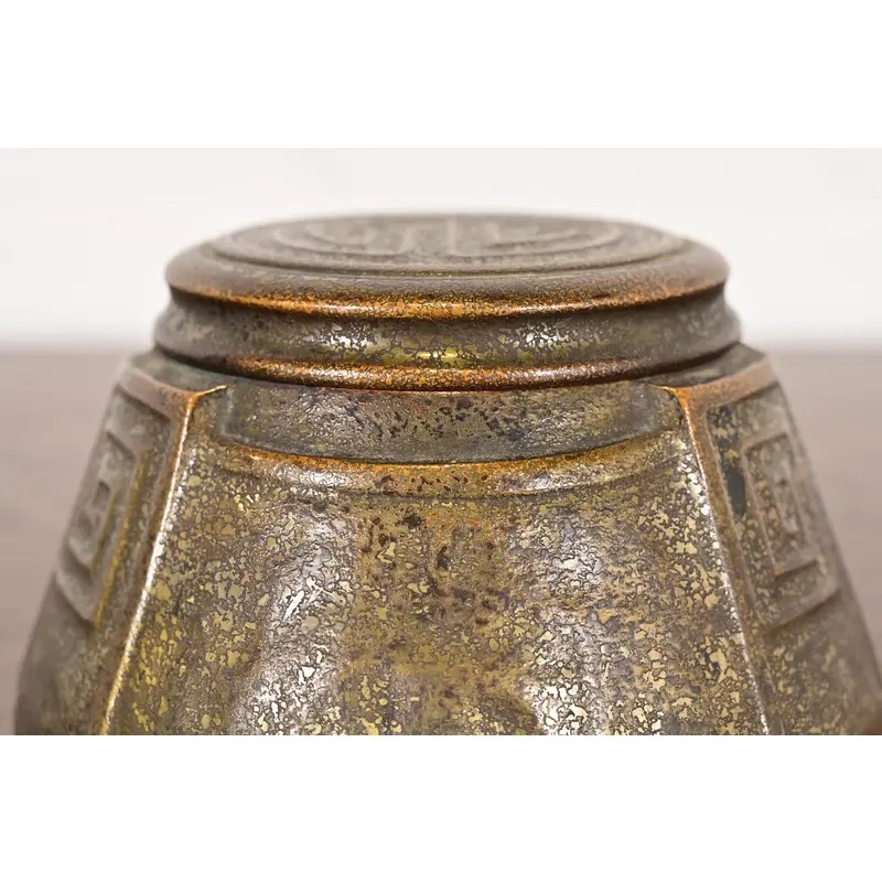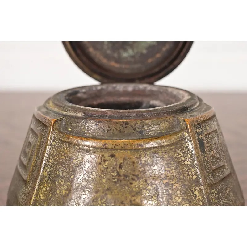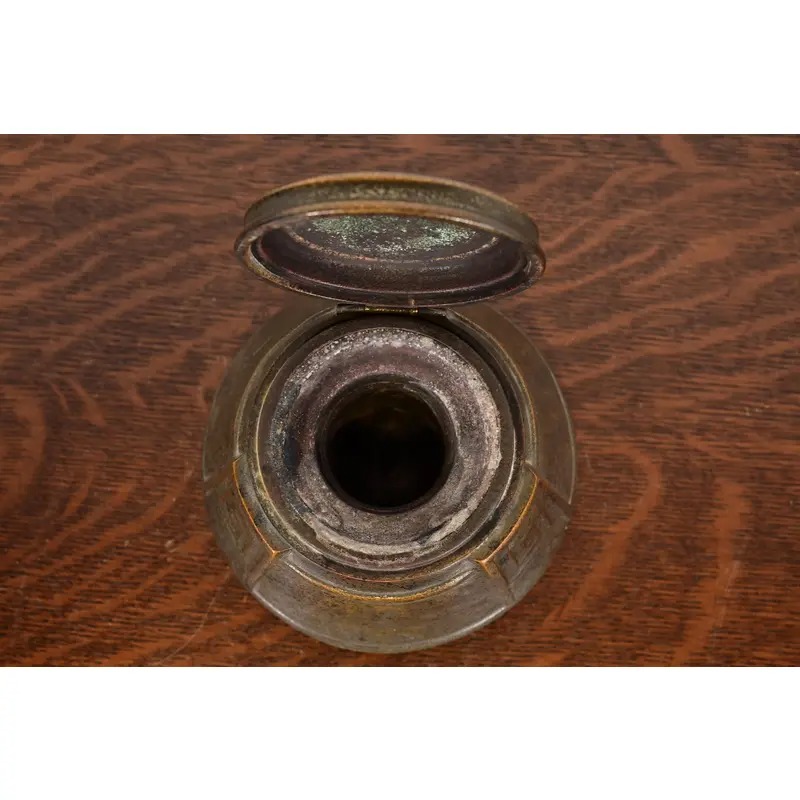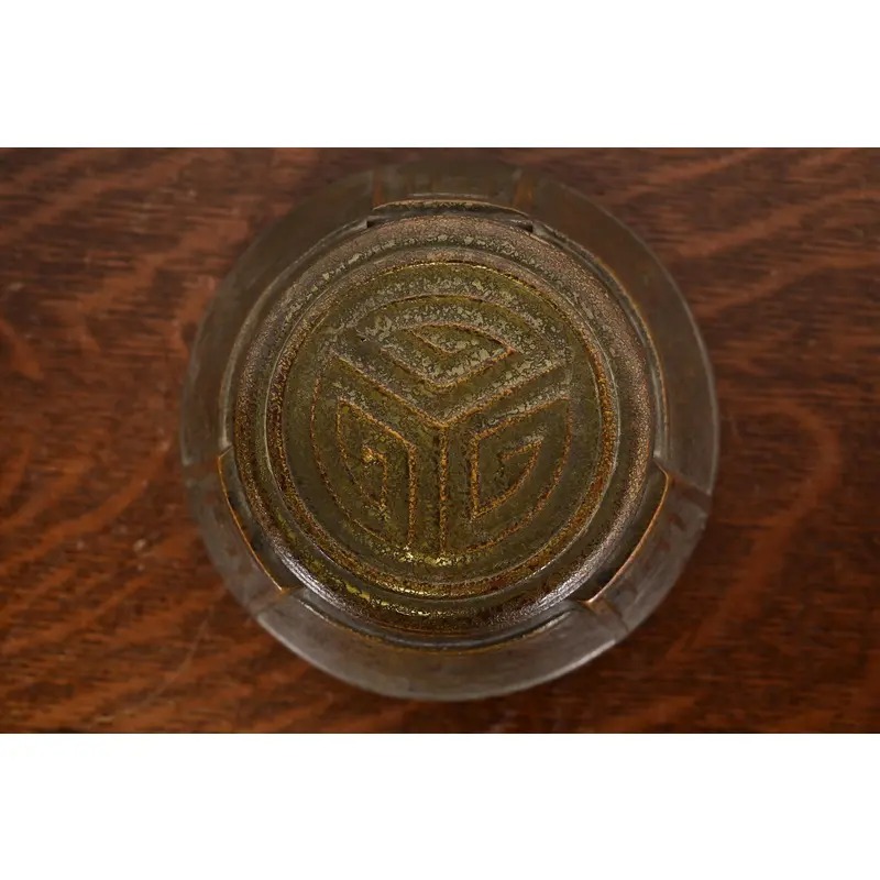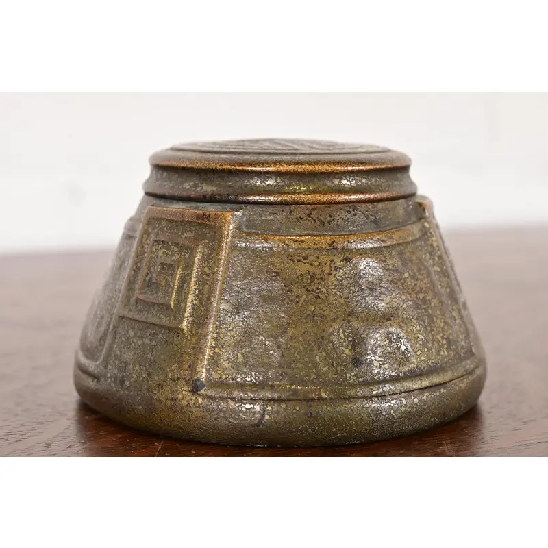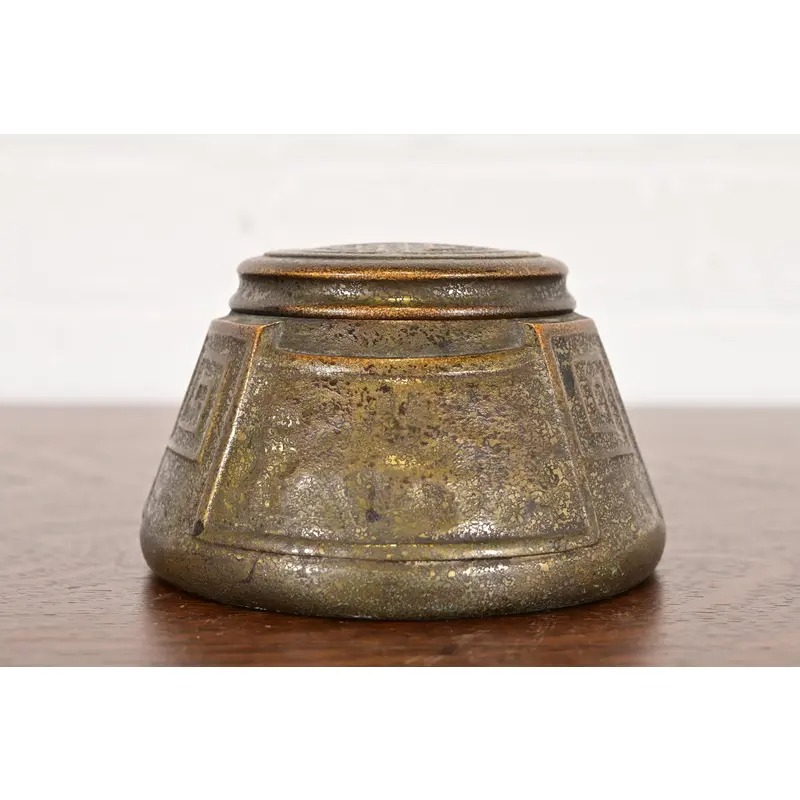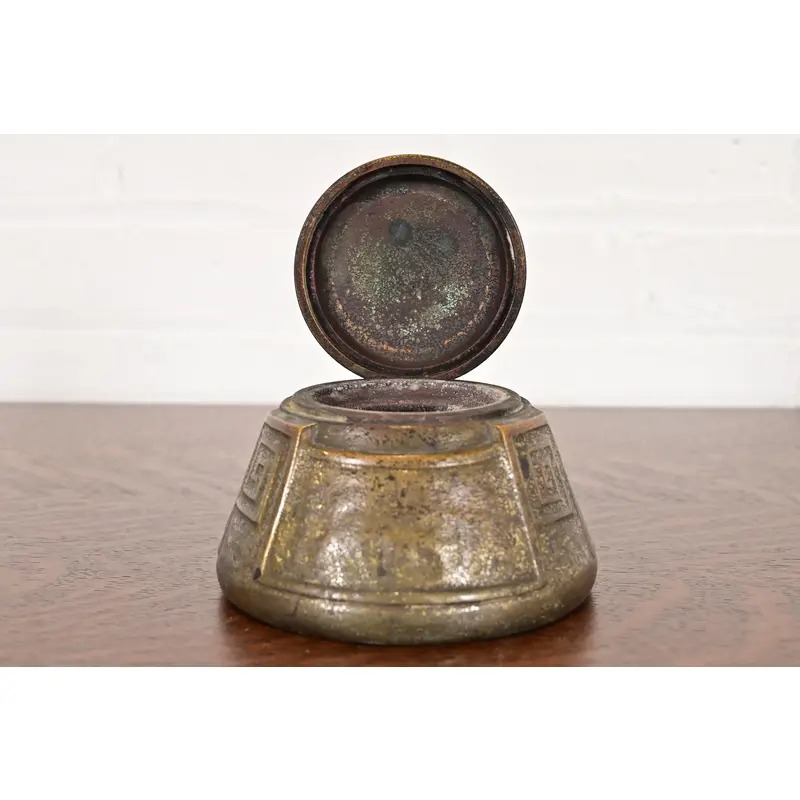 A gorgeous antique Arts & Crafts or Art Deco period bronze inkwell featuring Greek key designs