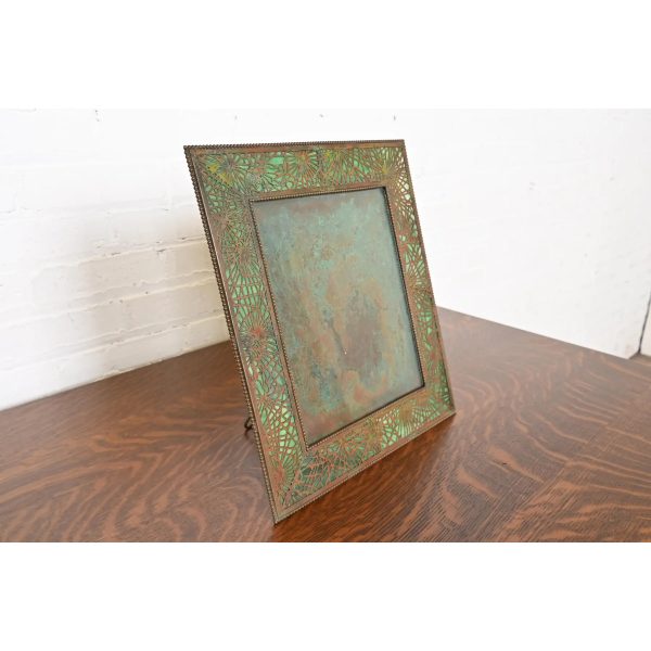 Patinated bronze in iconic pine needle pattern, with beautiful green slag glass.