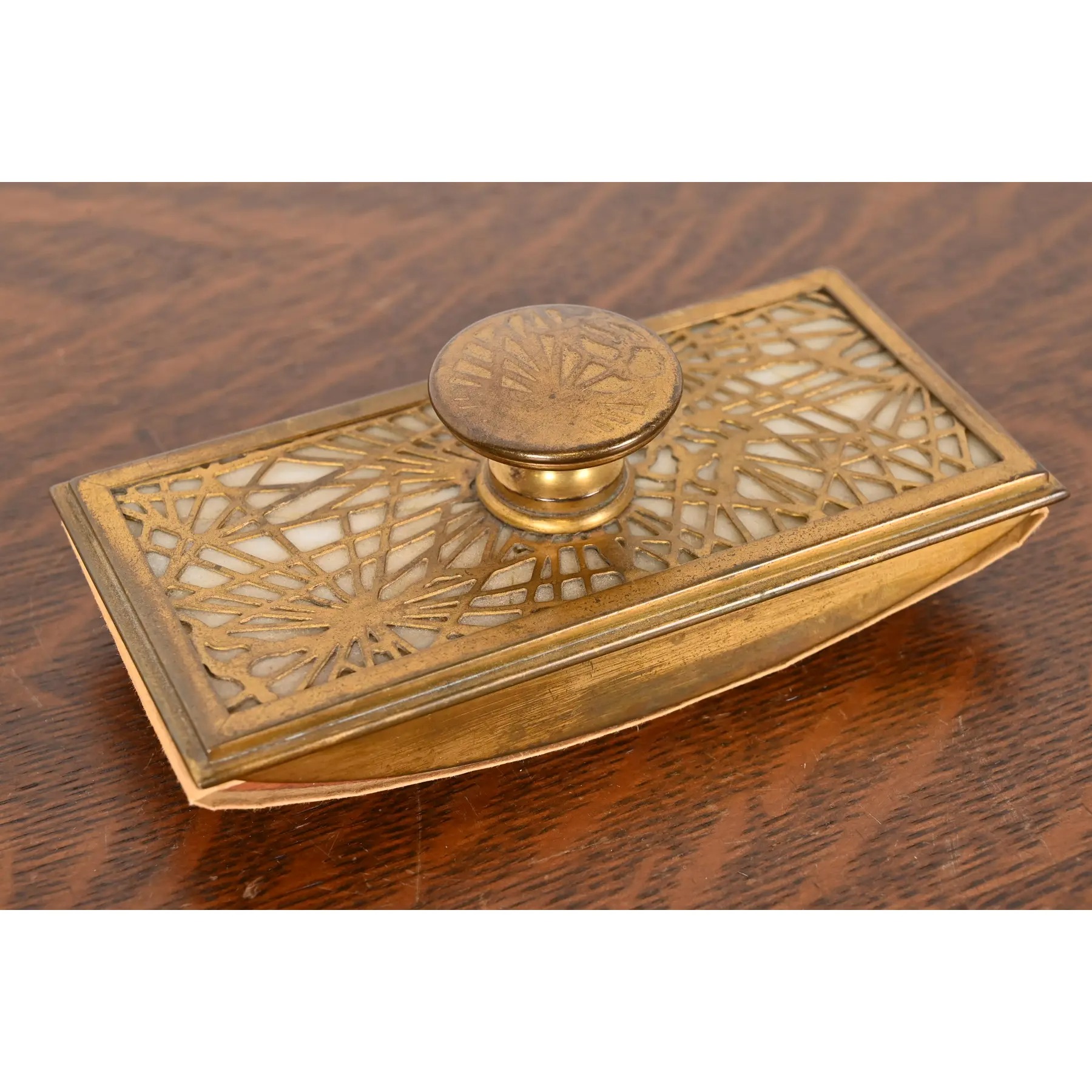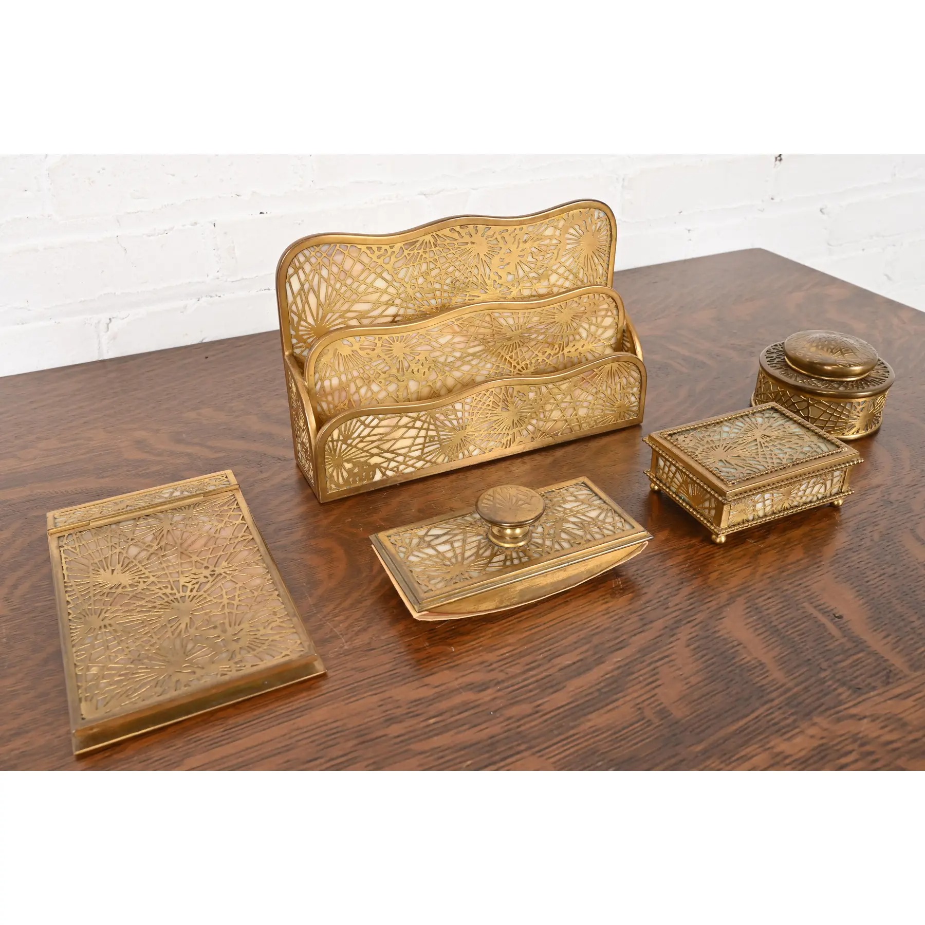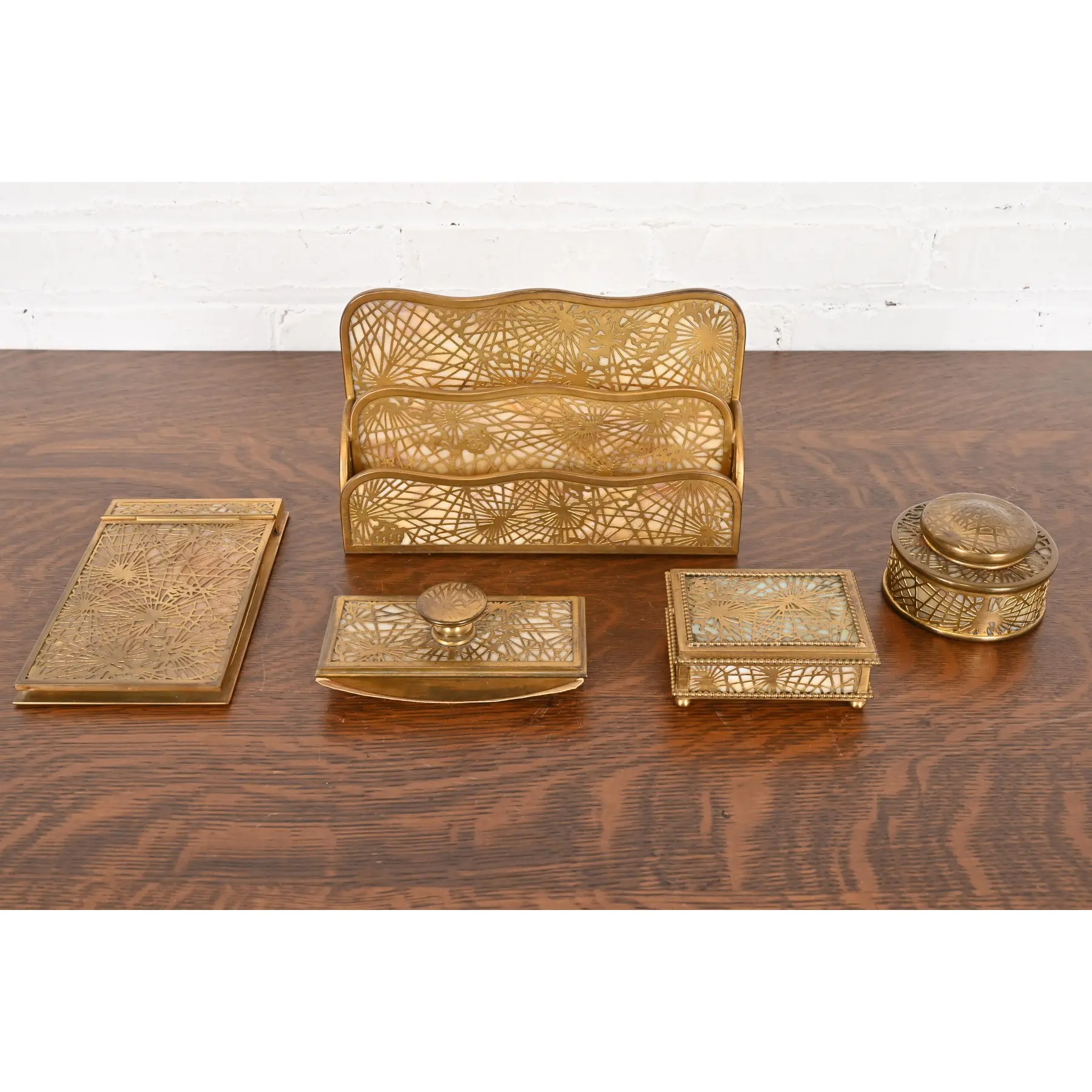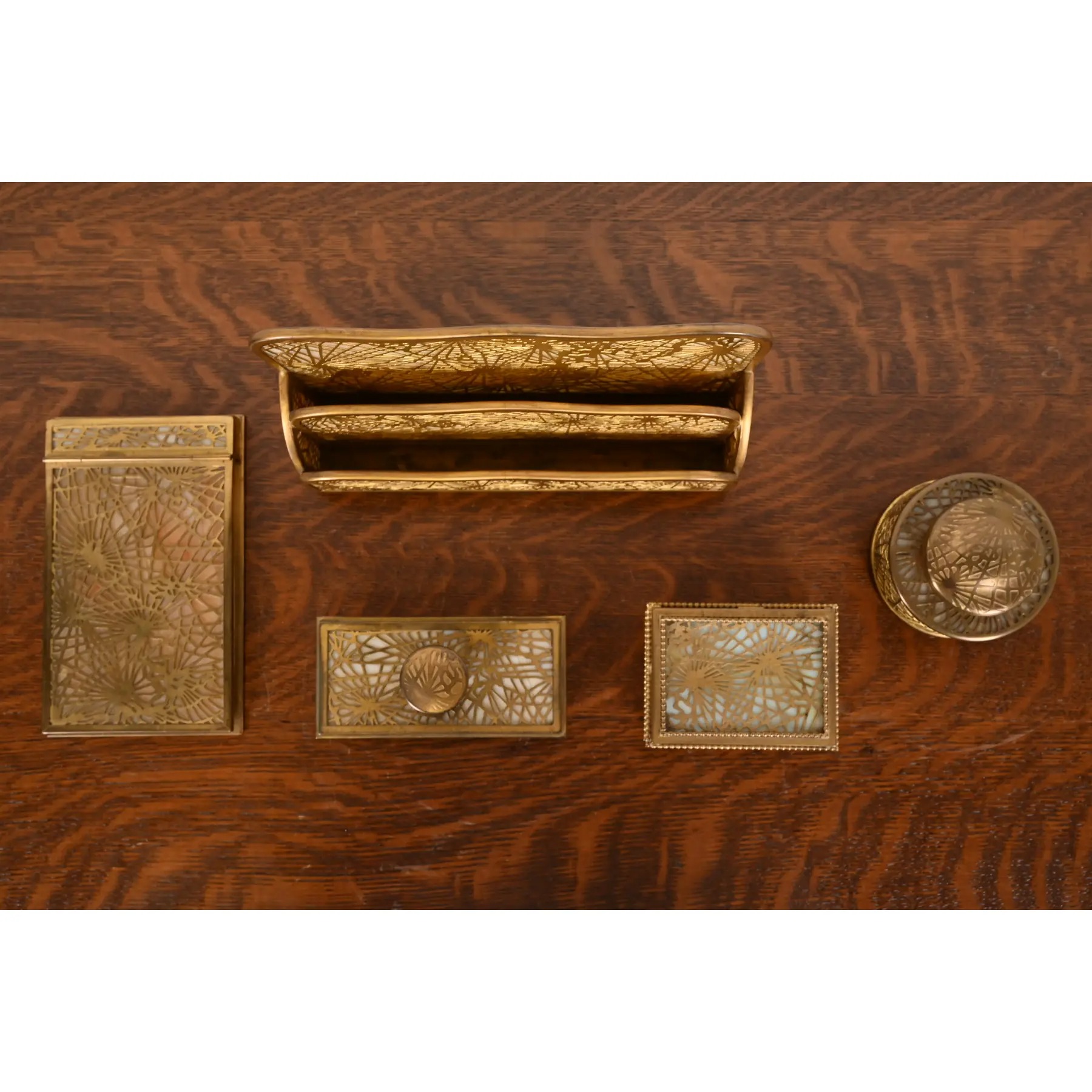 A gorgeous antique Arts & Crafts or Art Nouveau period “Pine Needle” gilt bronze and Favrile slag glass desk set. The five-piece set includes: inkwell, letter rack, stamp box, rocker blotter, and notepad holder.