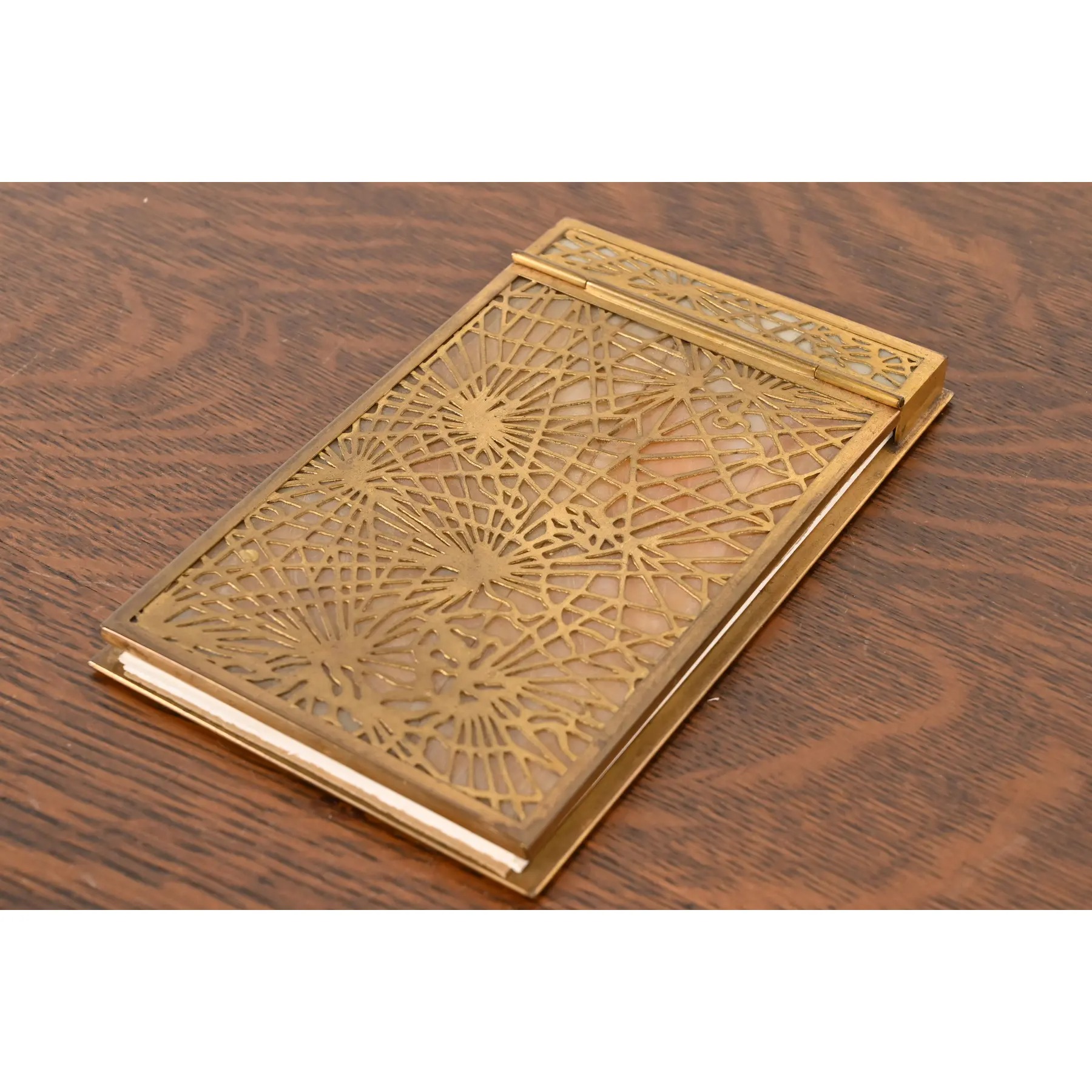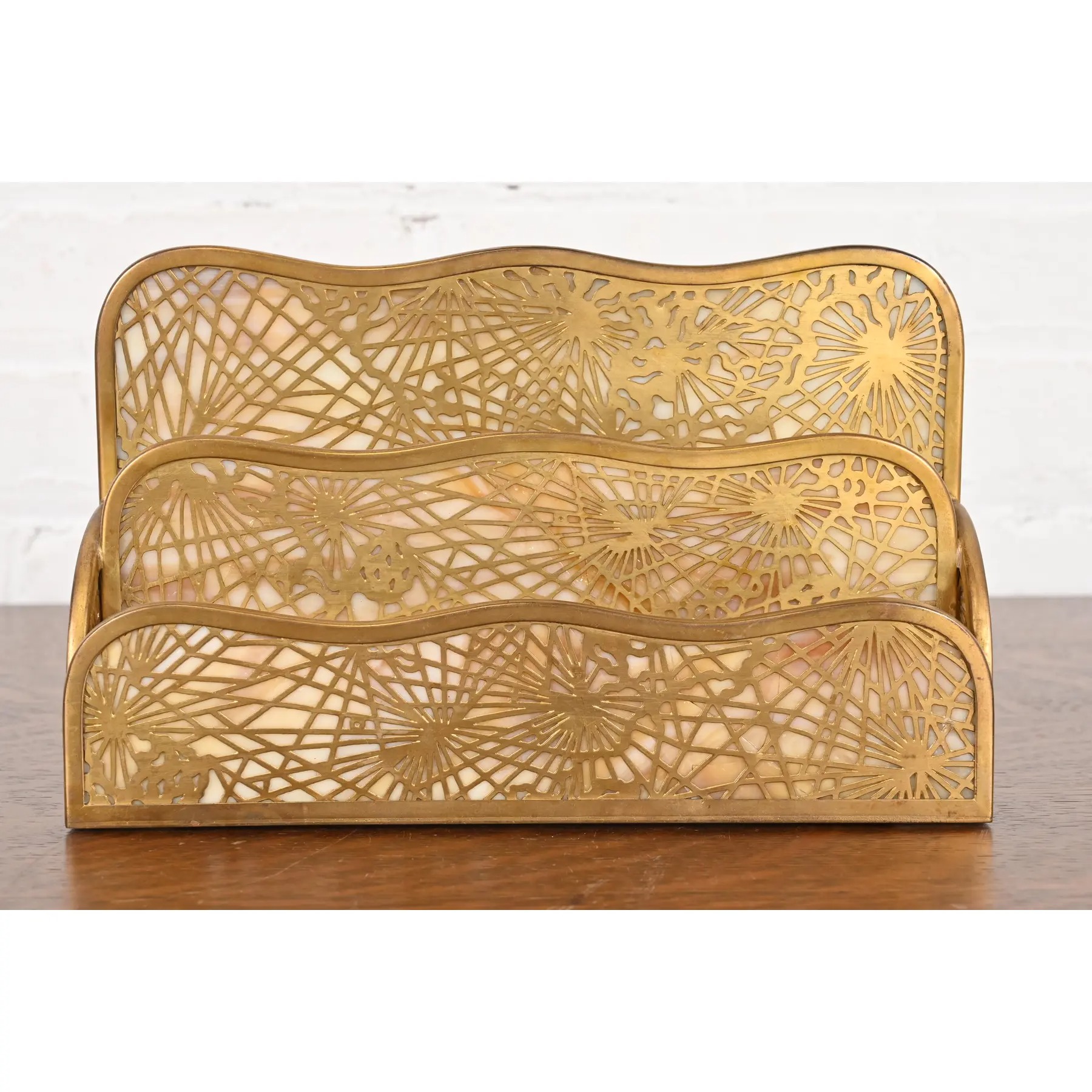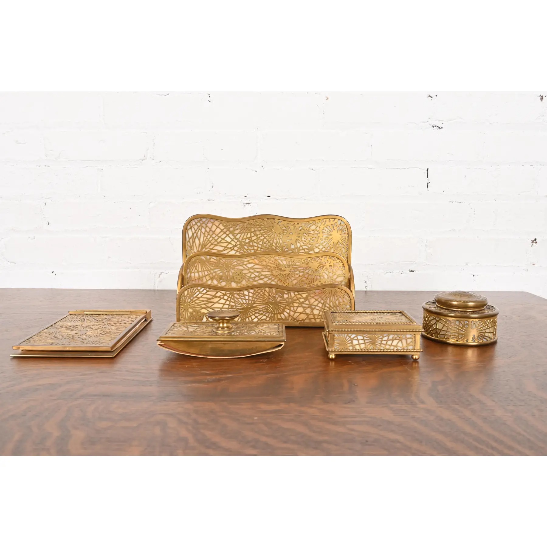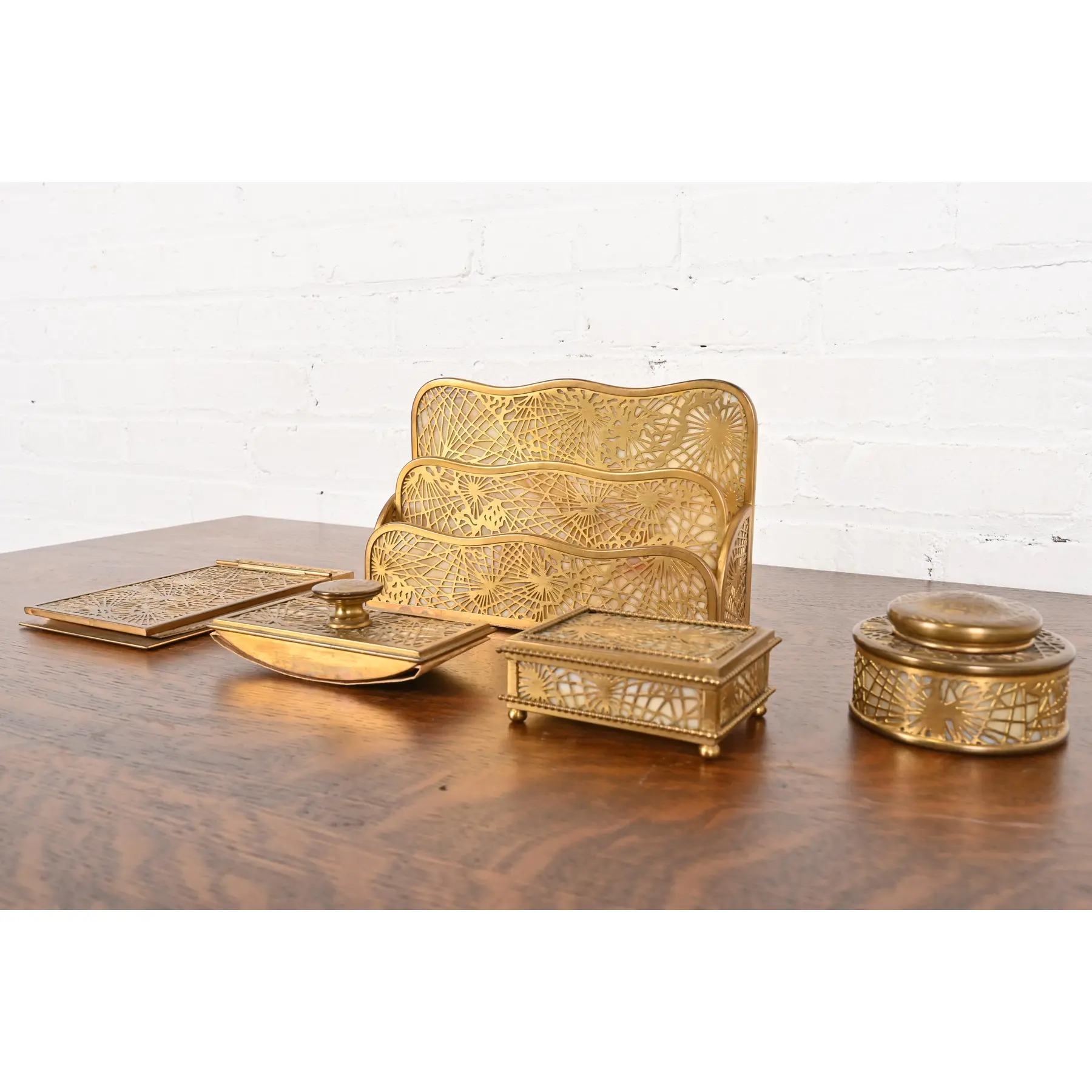 A gorgeous antique Arts & Crafts or Art Nouveau period “Pine Needle” gilt bronze and Favrile slag glass desk set. The five-piece set includes: inkwell, letter rack, stamp box, rocker blotter, and notepad holder.