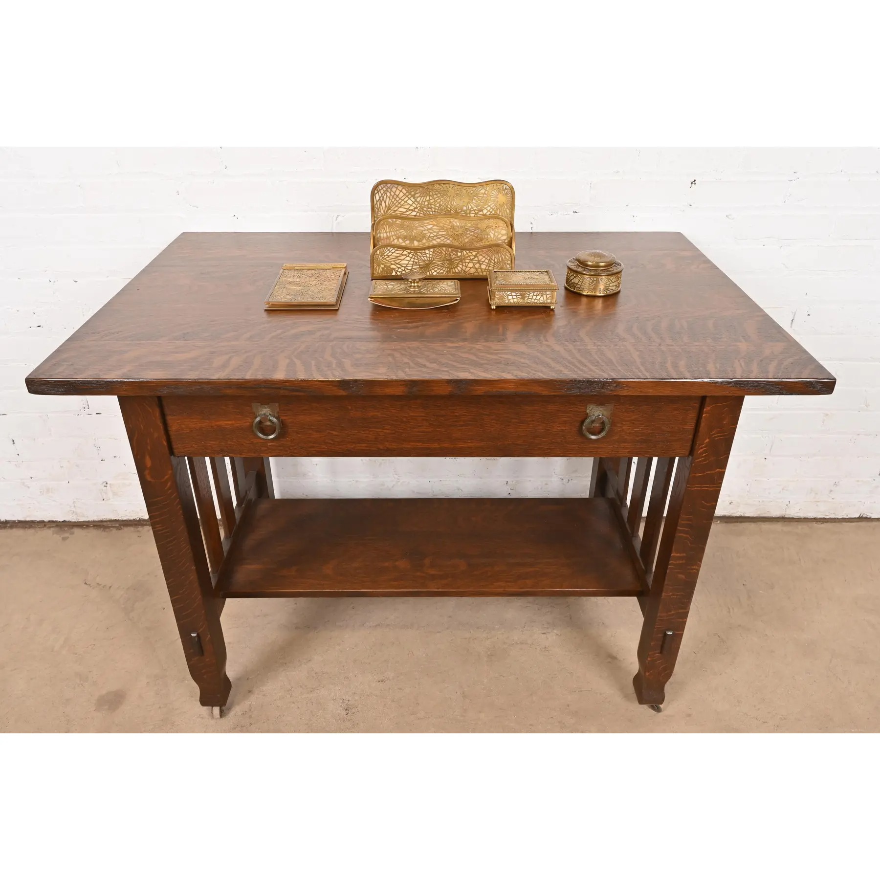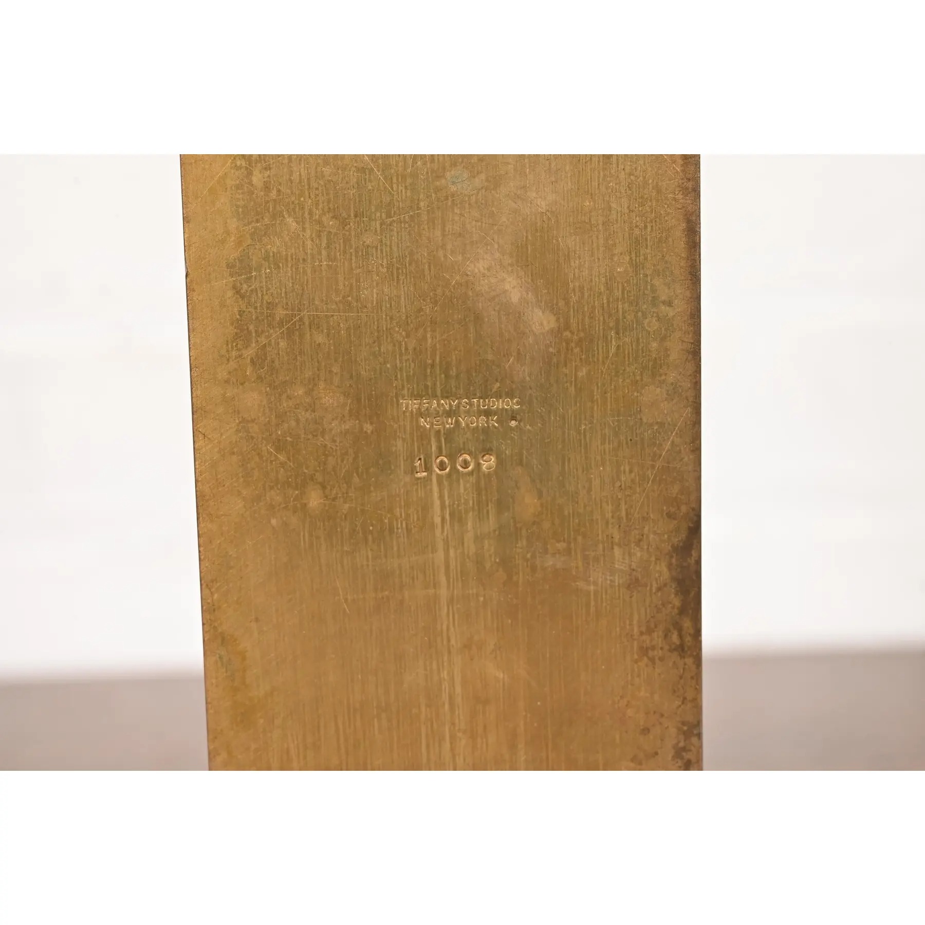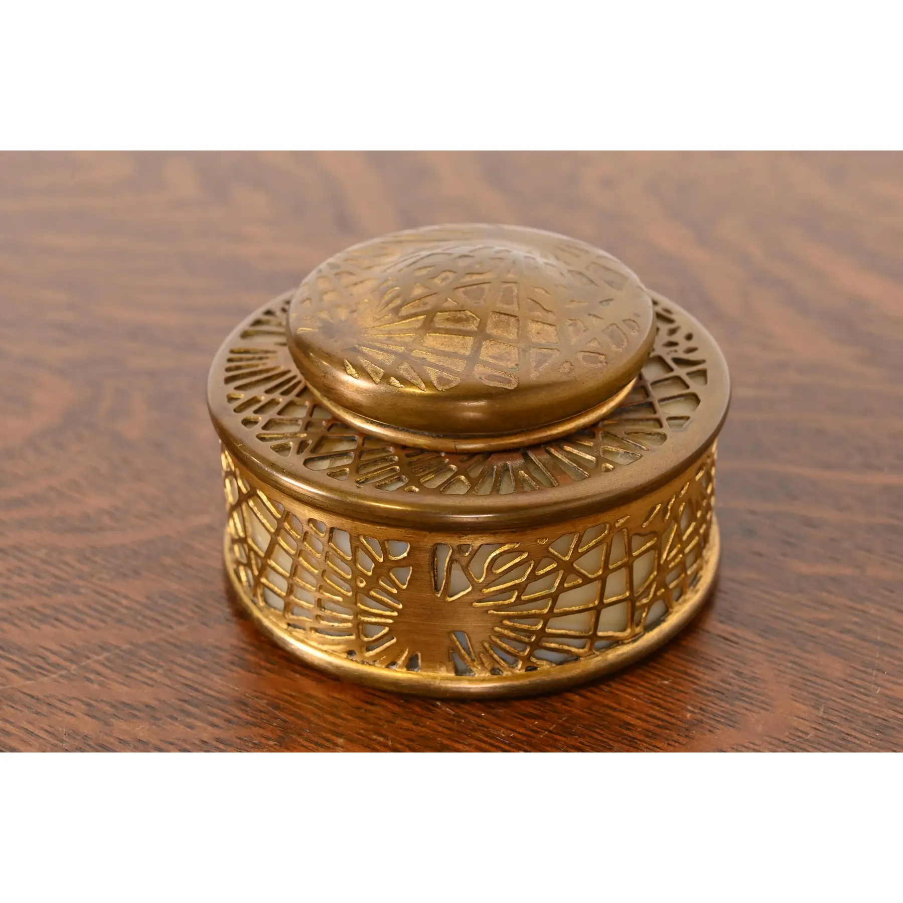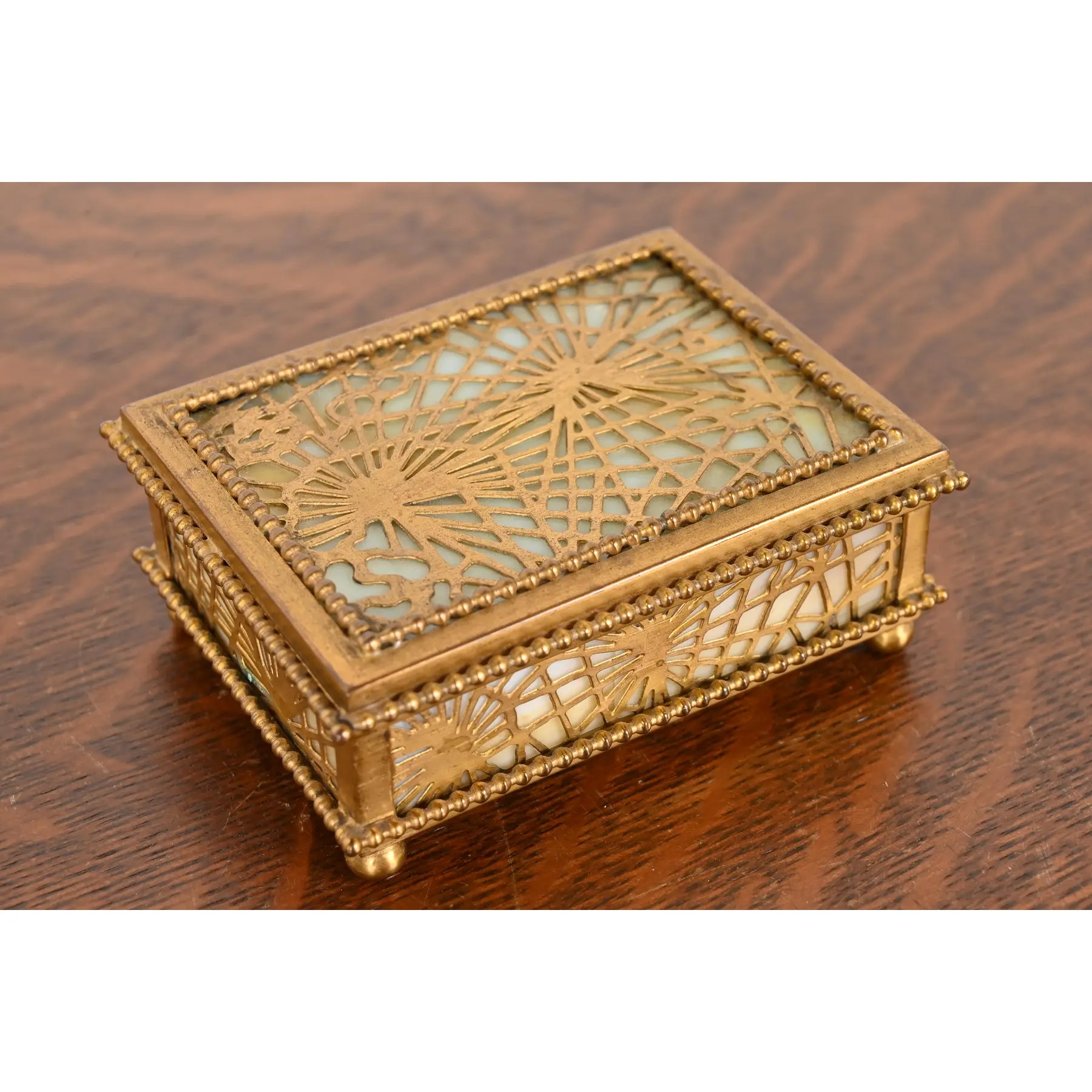 A gorgeous antique Arts & Crafts or Art Nouveau period “Pine Needle” gilt bronze and Favrile slag glass desk set. The five-piece set includes: inkwell, letter rack, stamp box, rocker blotter, and notepad holder.