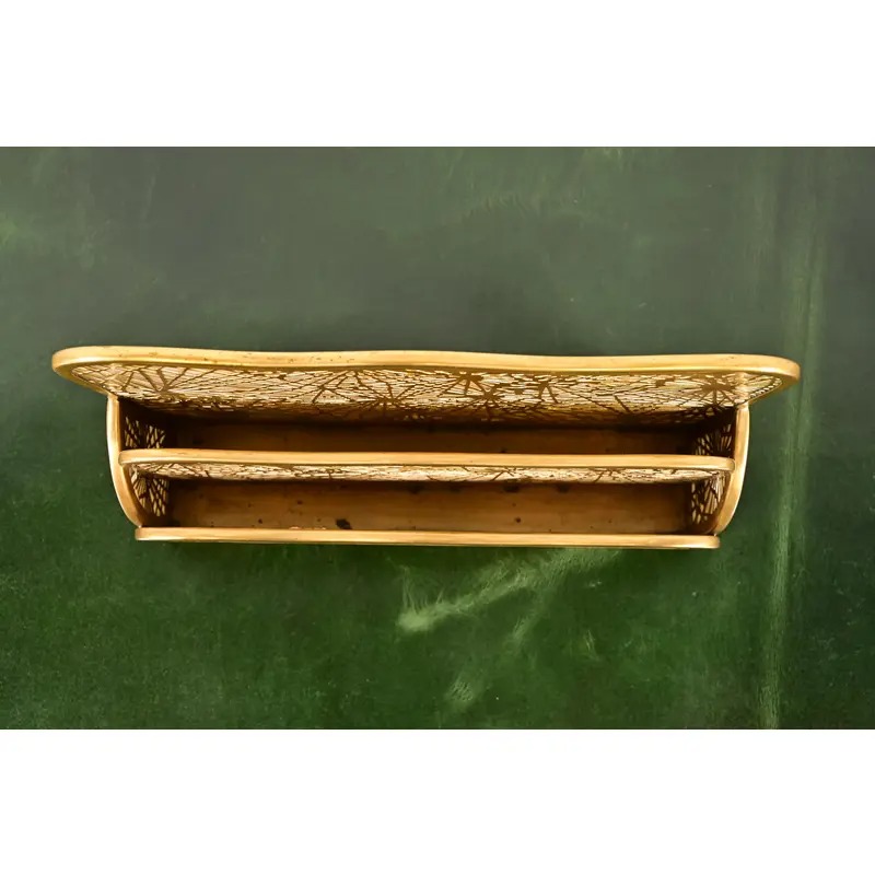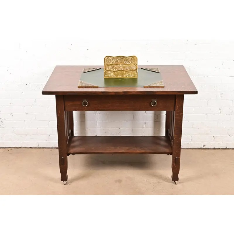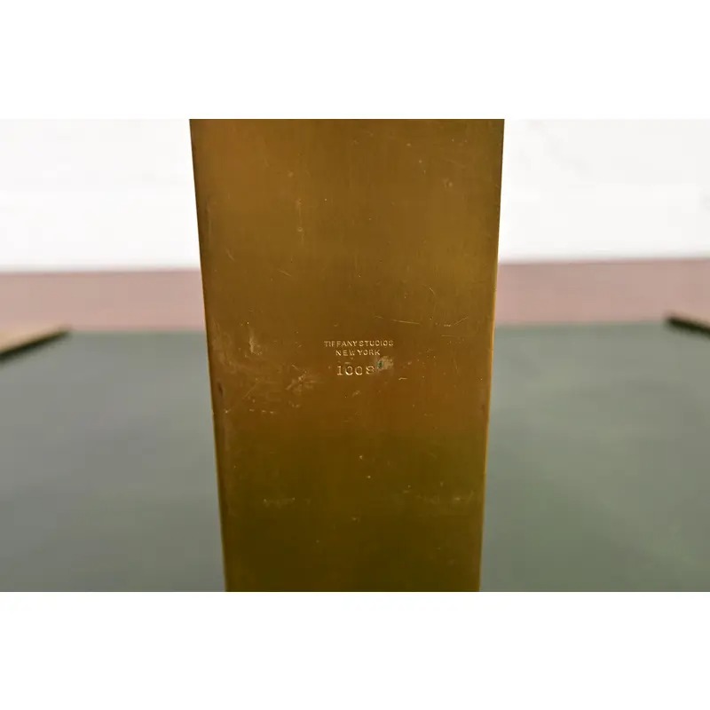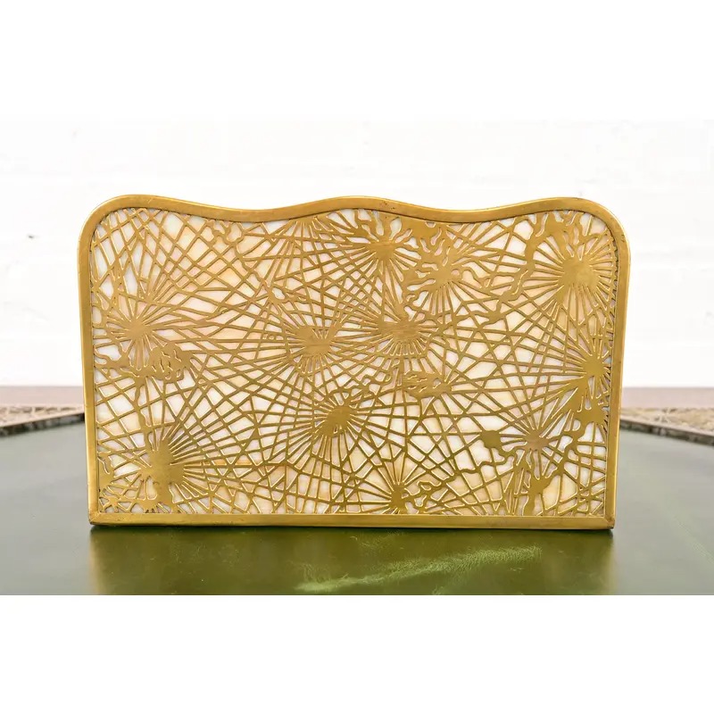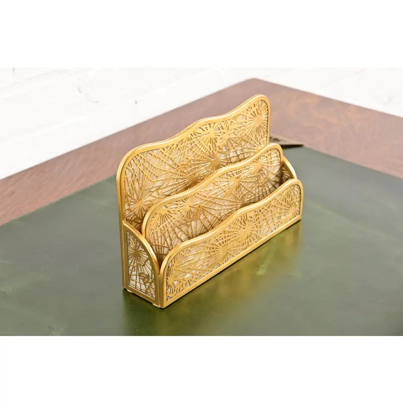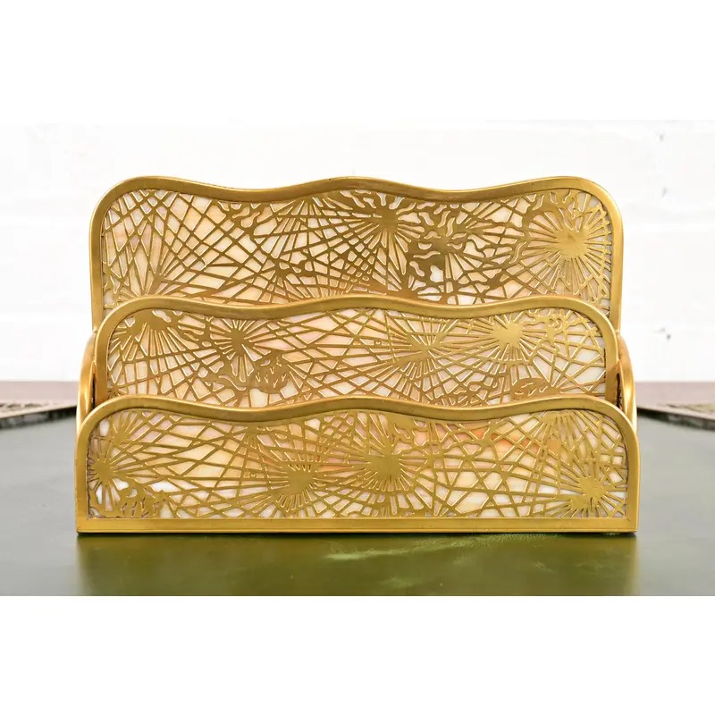 A gorgeous antique Arts & Crafts or Art Deco period gilt bronze and Favrile slag glass “Pine Needle” pattern desk letter holder rack
