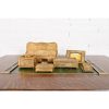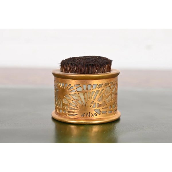 A gorgeous antique Arts & Crafts or Art Nouveau period “Pine Needle” gilt bronze and Favrile slag glass desk set. The eight-piece set includes: inkwell, pen brush, letter rack, calendar frame, large desk box, stamp box, paper clip, and set of two blotter ends with leather desk blotter.