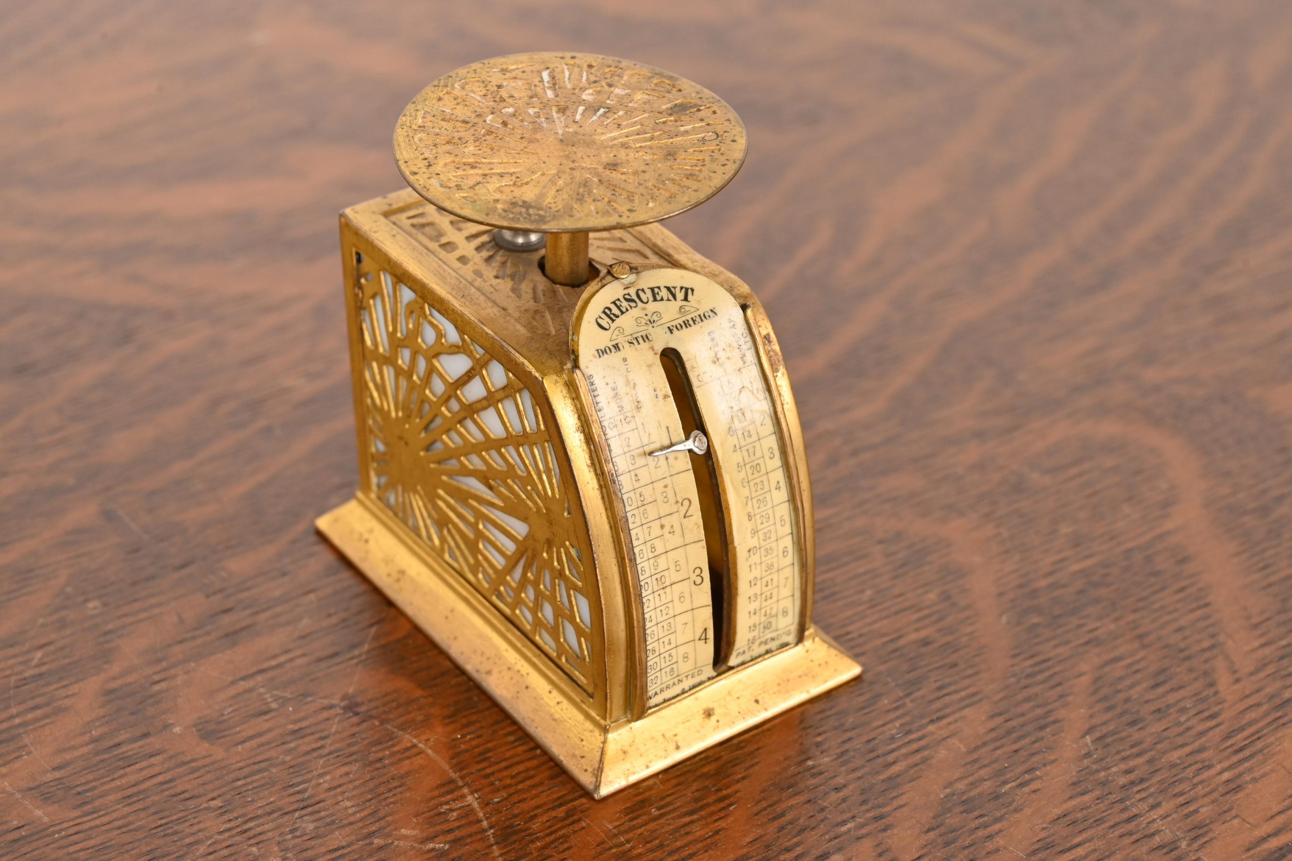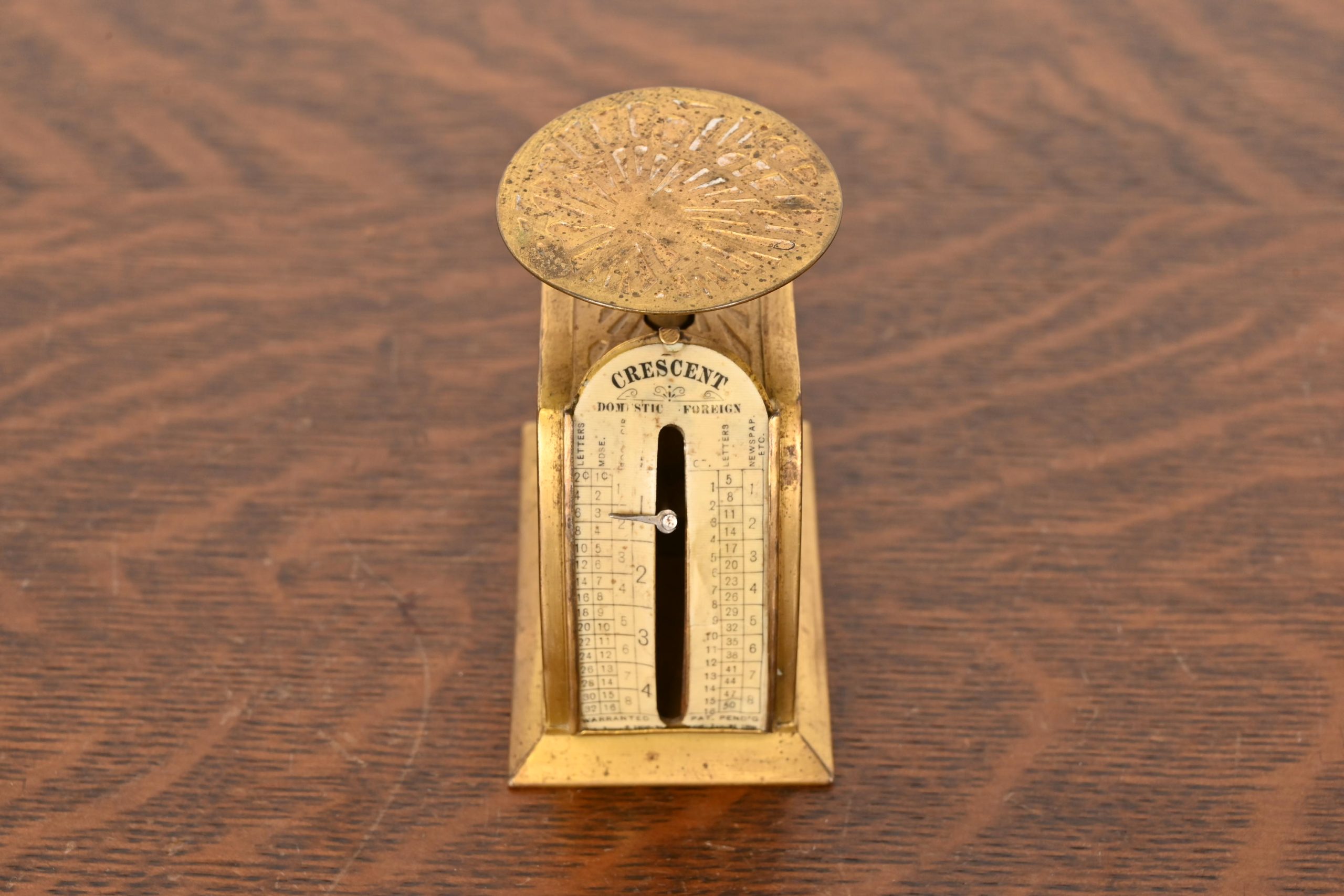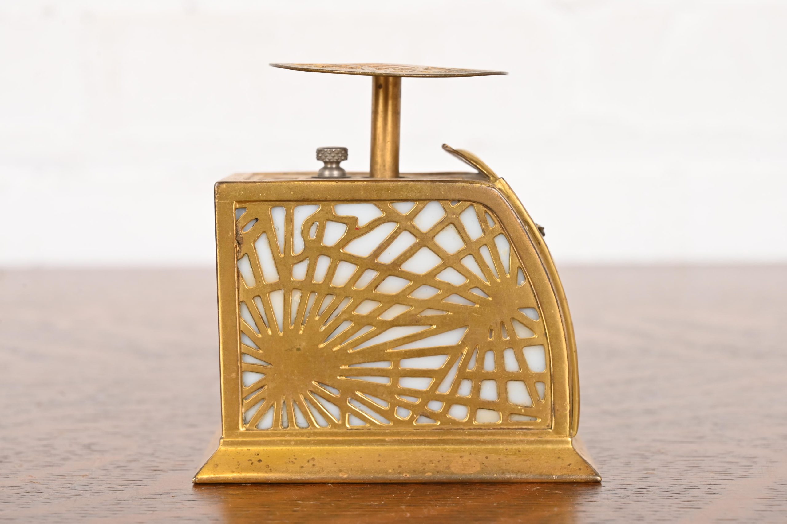 A gorgeous antique Arts & Crafts or Art Deco period gilt bronze and favrile slag glass “Pine Needle” pattern postage scale