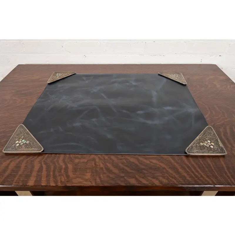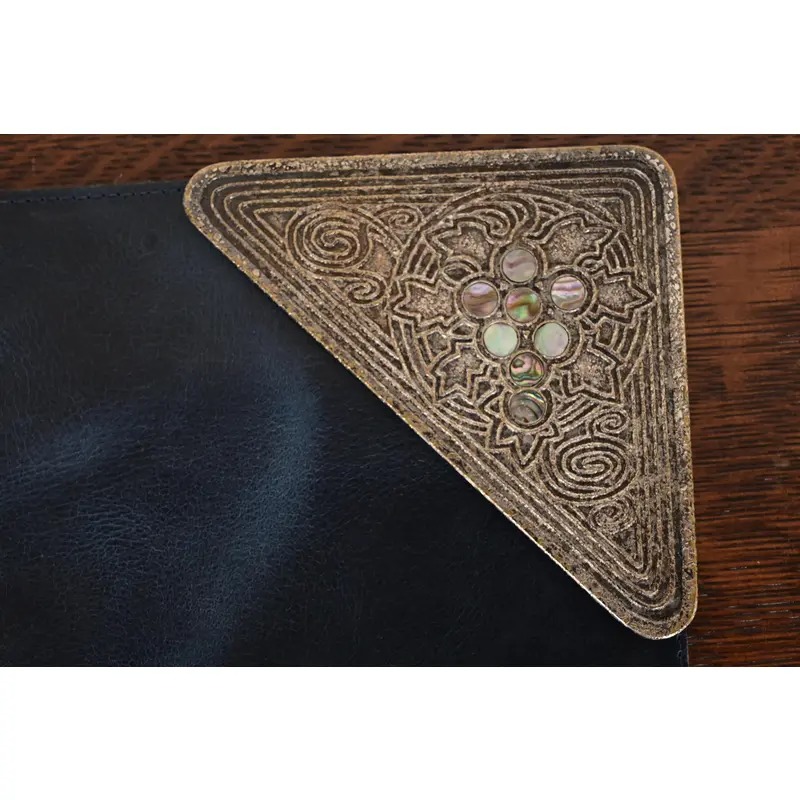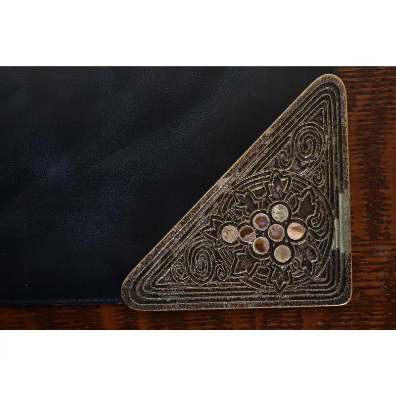 A gorgeous set of four Art Deco or Arts & Crafts period silvered bronze and abalone blotter corners, with a custom blue leather desk blotter.