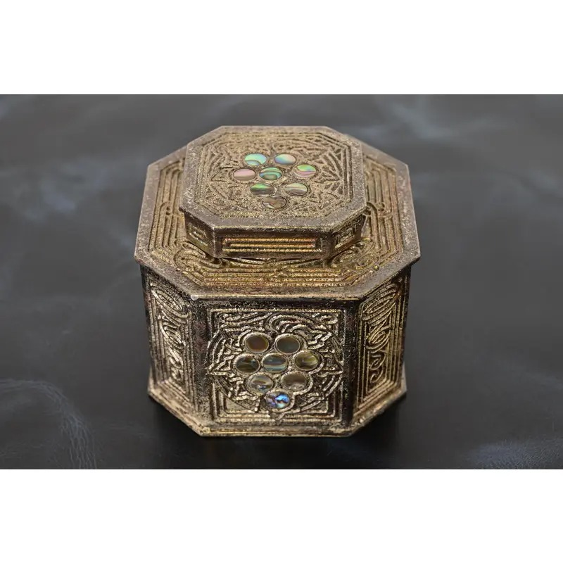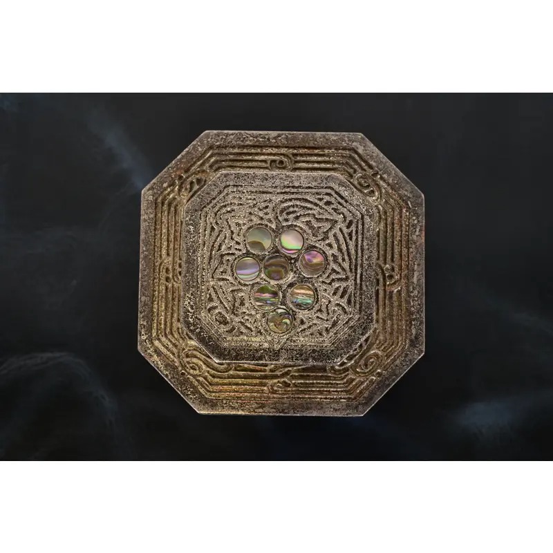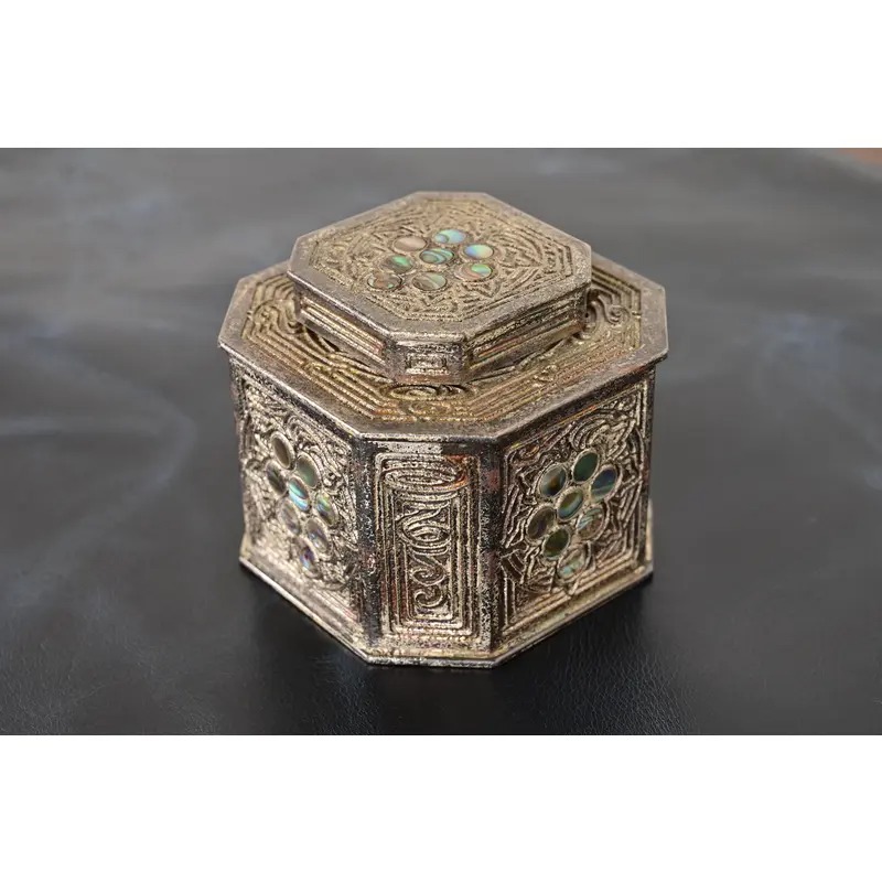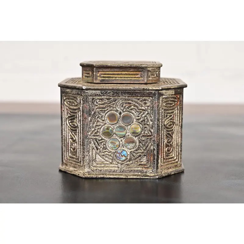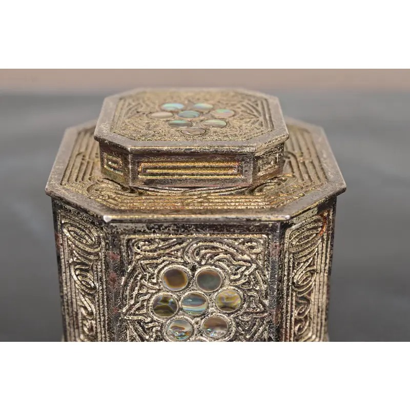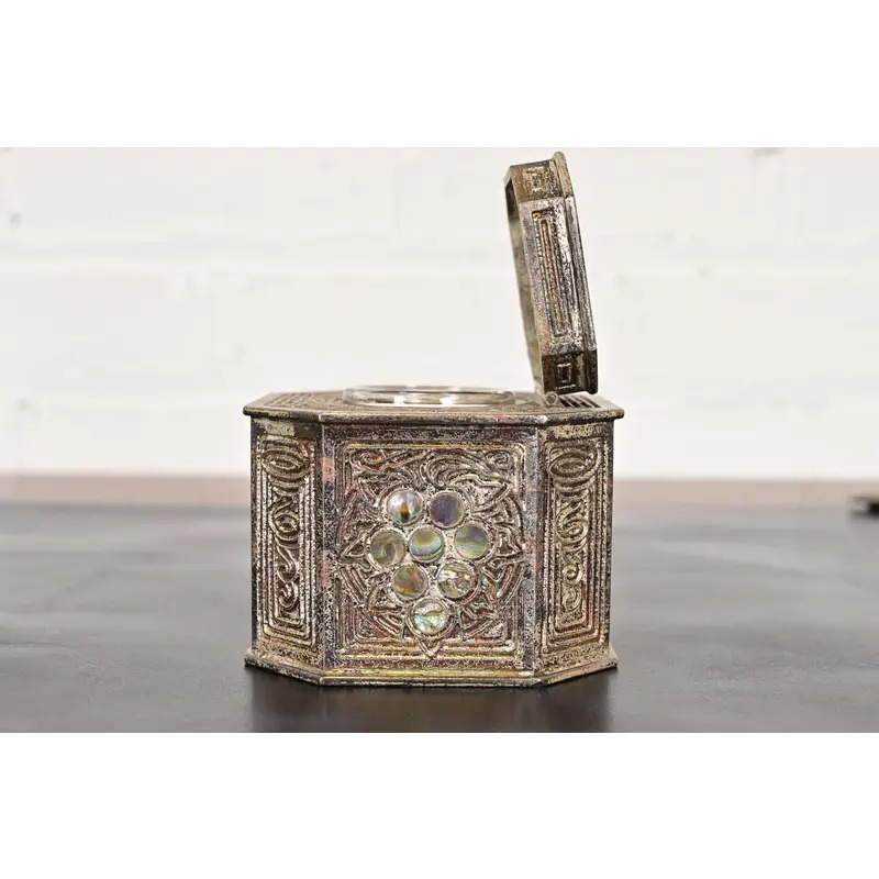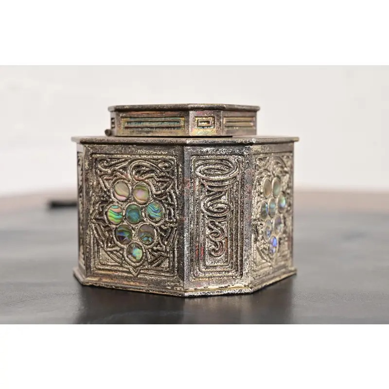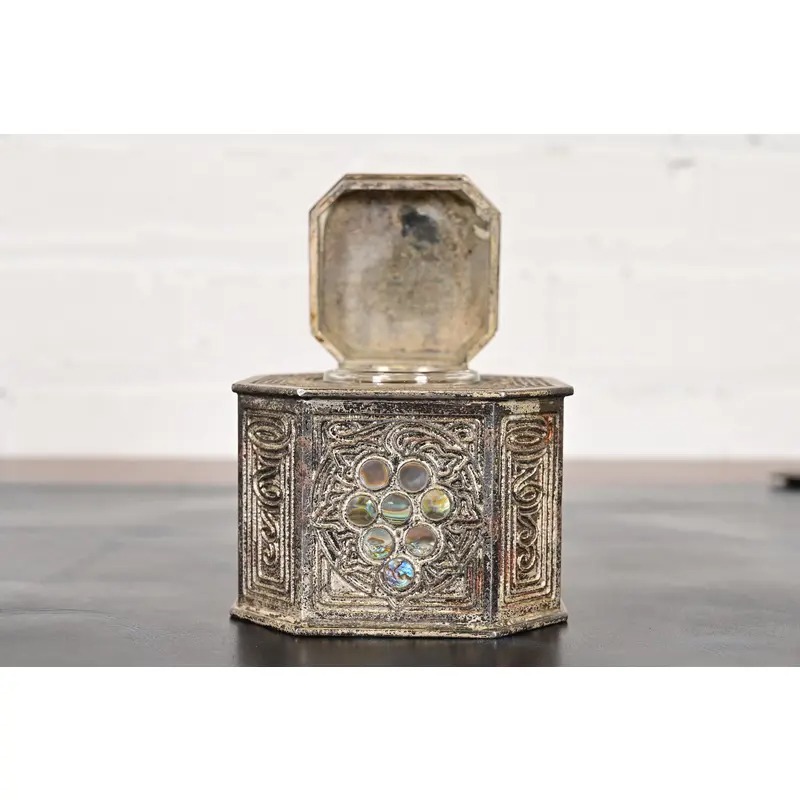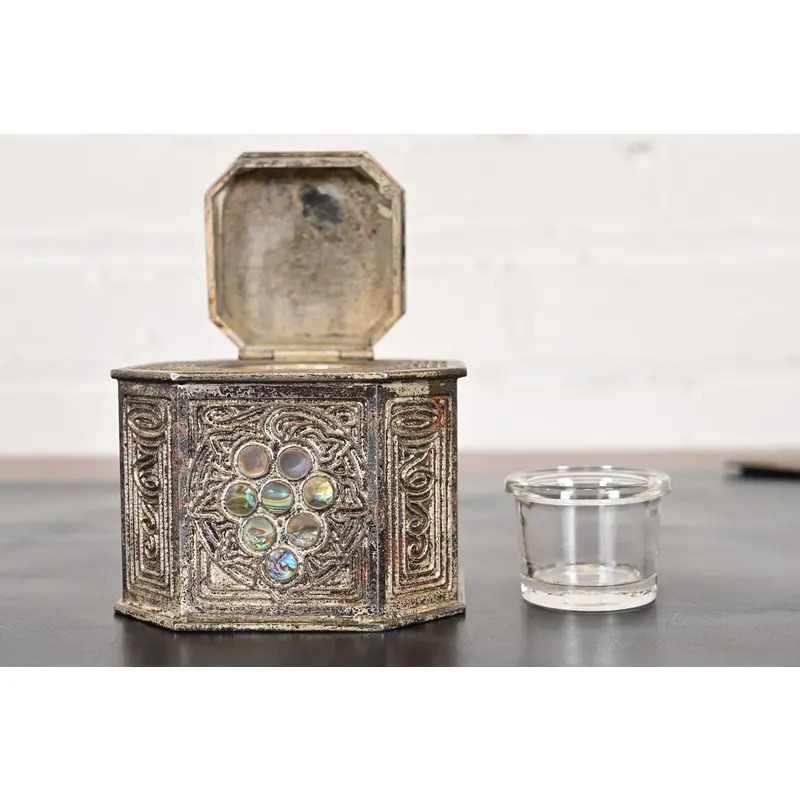 A gorgeous Art Nouveau or Arts & Crafts period silvered bronze and inlaid abalone inkwell