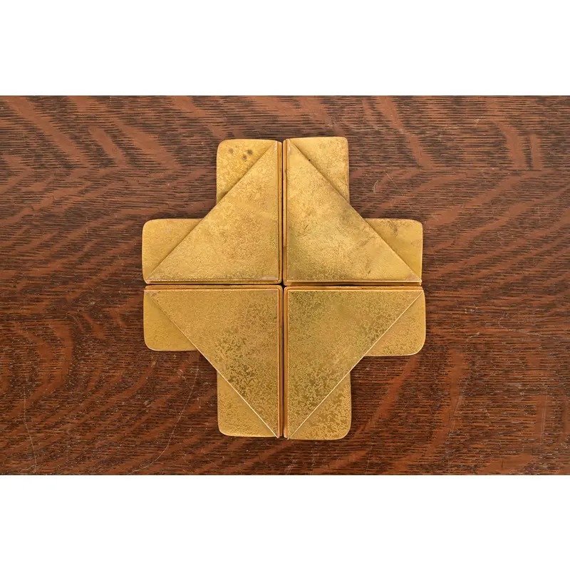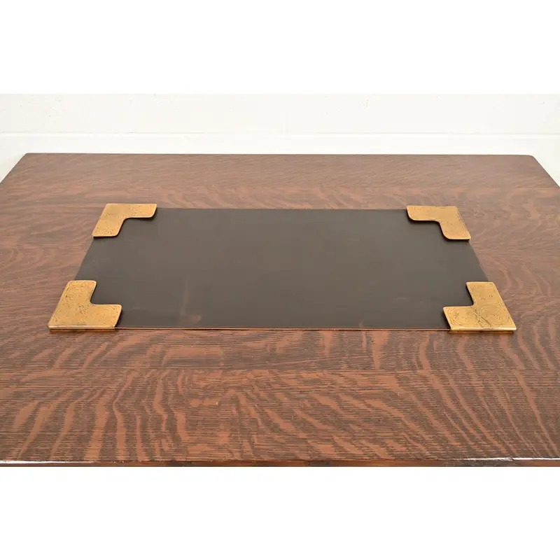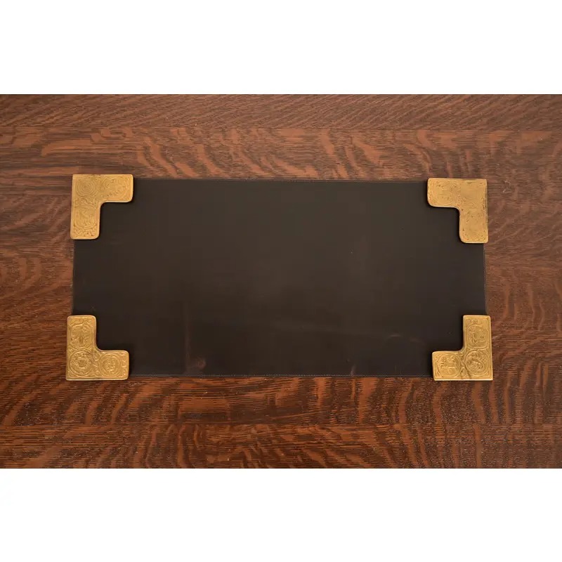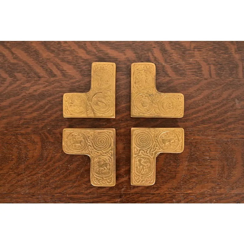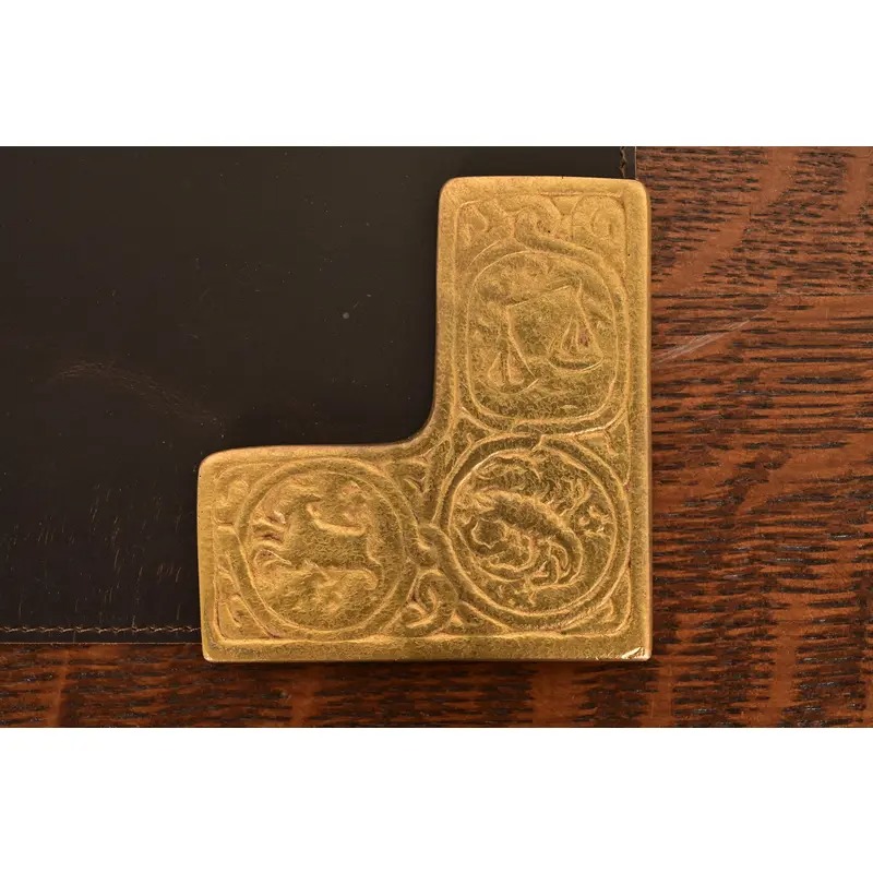 A gorgeous set of four Art Deco or Arts & Crafts period gilt bronze blotter corners featuring symbols of the Zodiac, with a custom brown leather desk blotter.