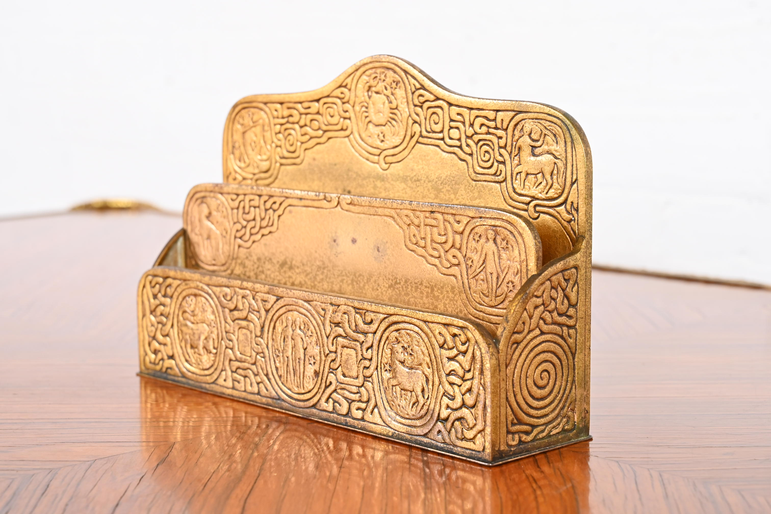 A gorgeous Art Deco period gilt bronze desk letter rack featuring a Zodiac design