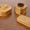 A gorgeous antique Arts & Crafts or Art Deco period gilt bronze “Zodiac” pattern stamp box, desk box, decorative box, or jewelry box