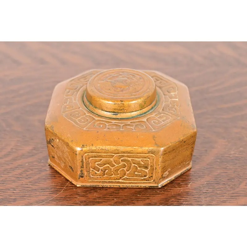 A gorgeous Arts & Crafts or Art Deco period “Zodiac” pattern gilt bronze inkwell