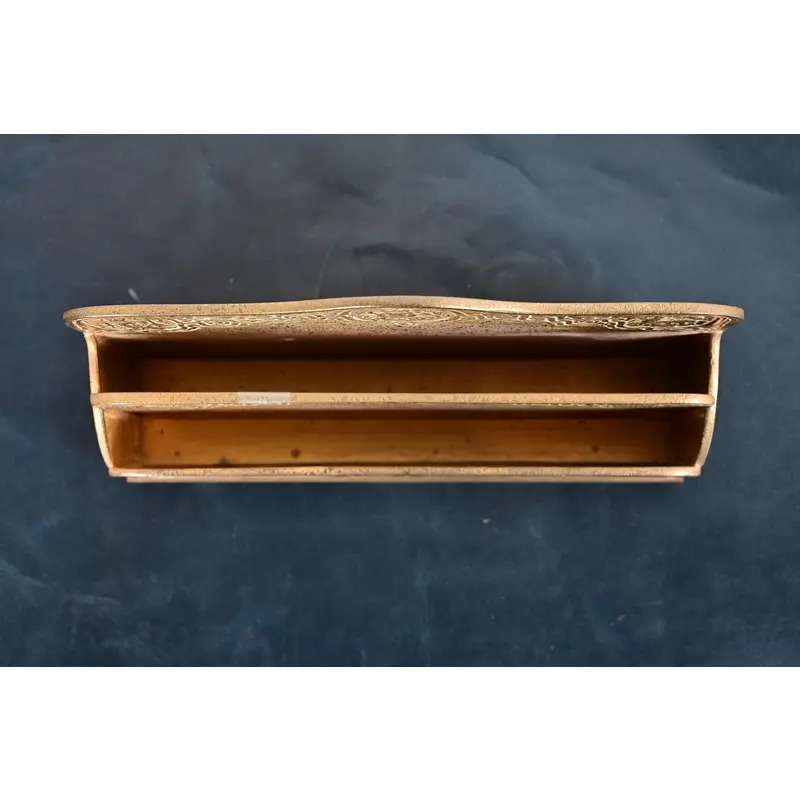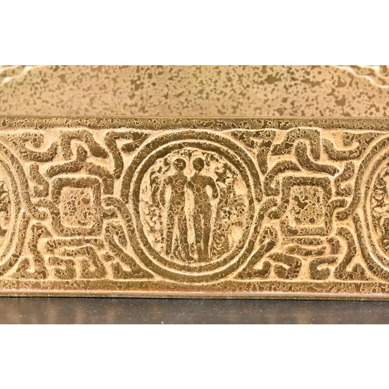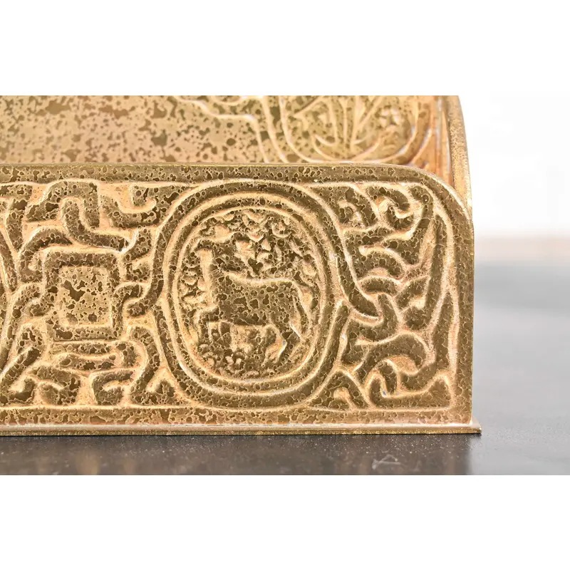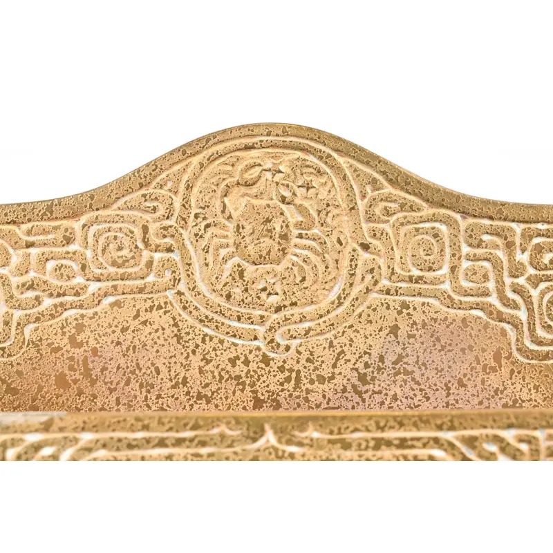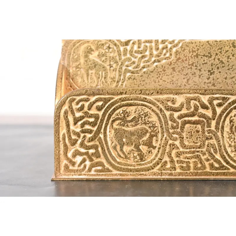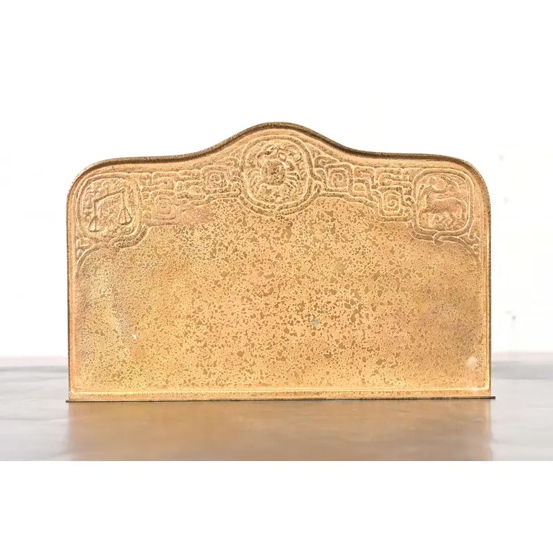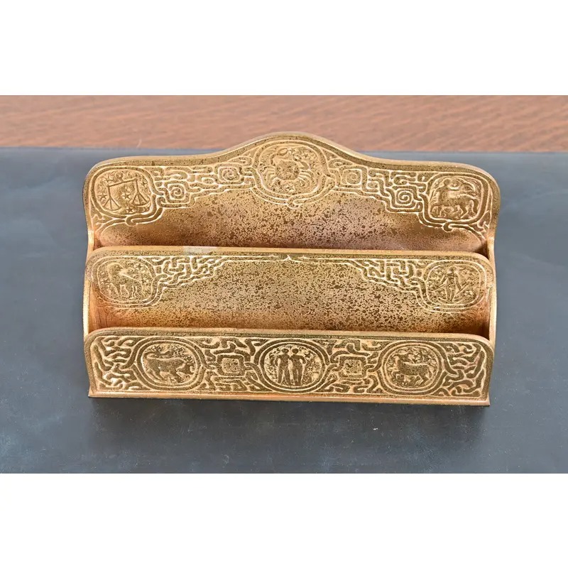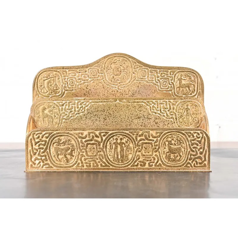 A gorgeous antique Arts & Crafts or Art Deco period gilt bronze “Zodiac” pattern desk letter holder rack