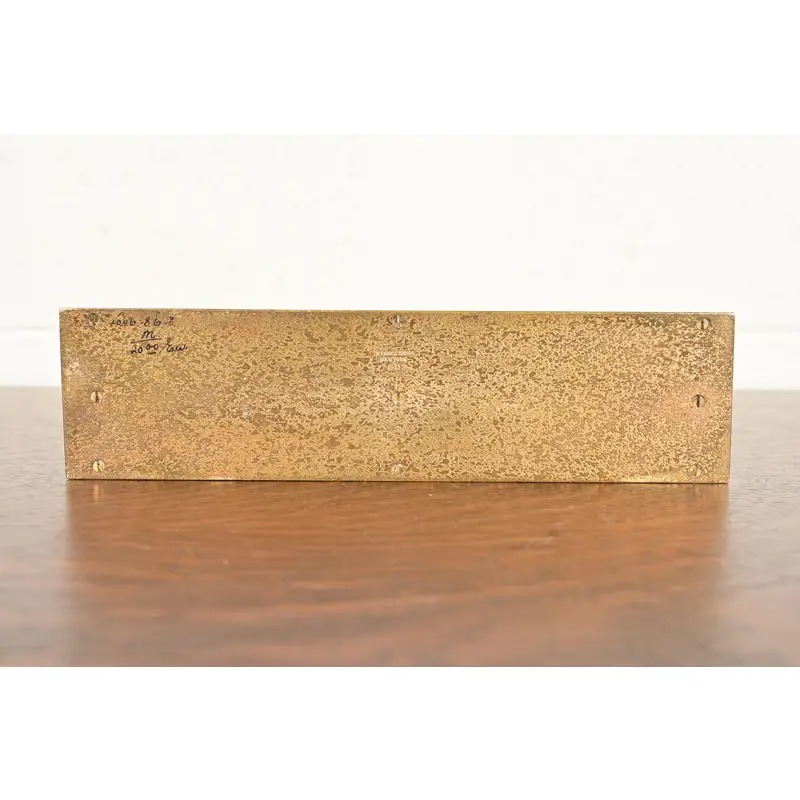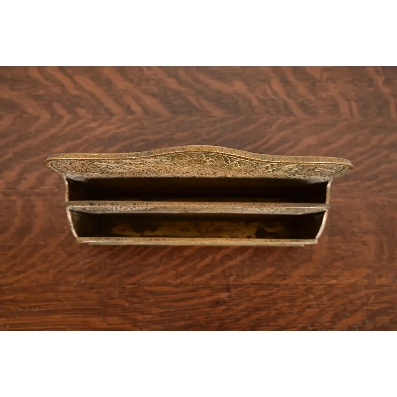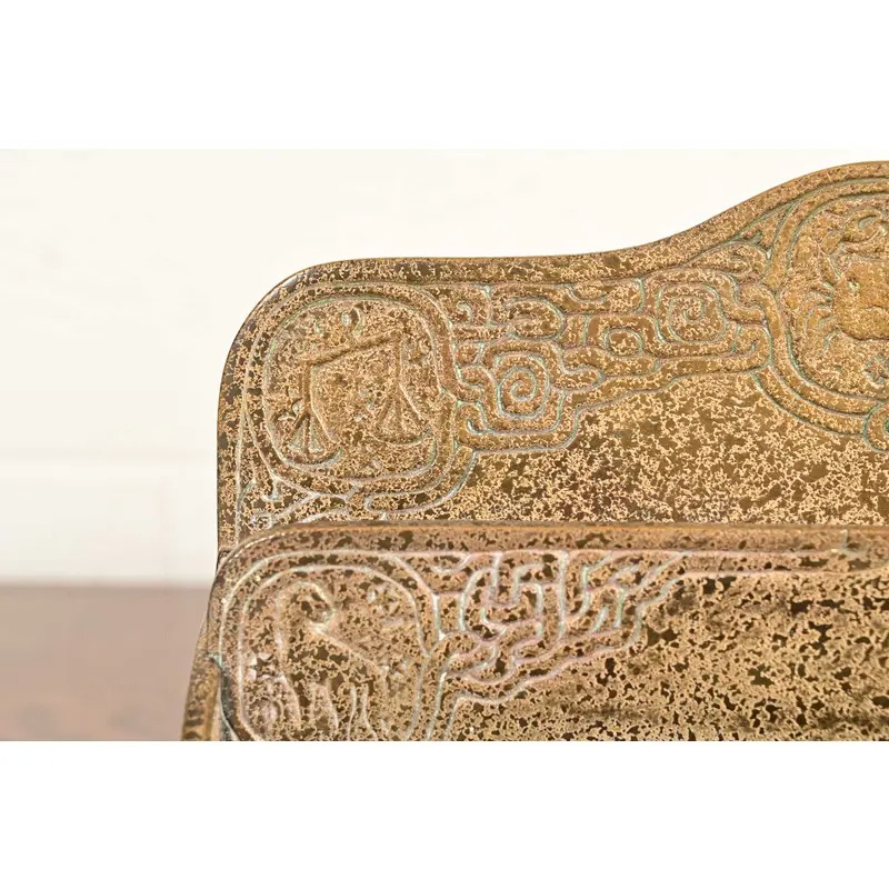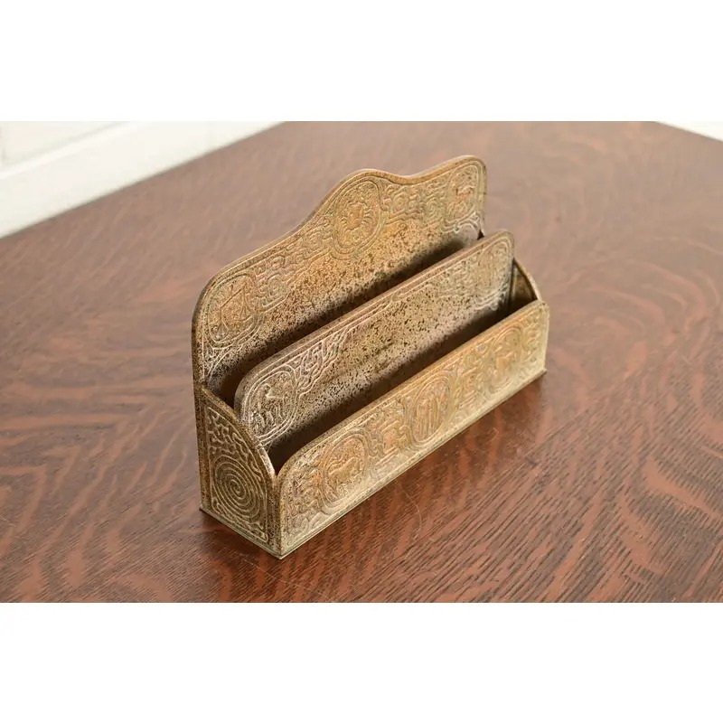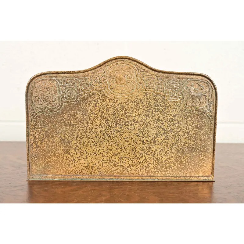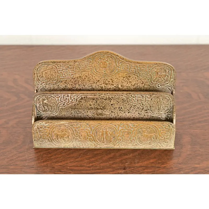A gorgeous antique Arts & Crafts or Art Deco period gilt bronze “Zodiac” pattern desk letter holder rack