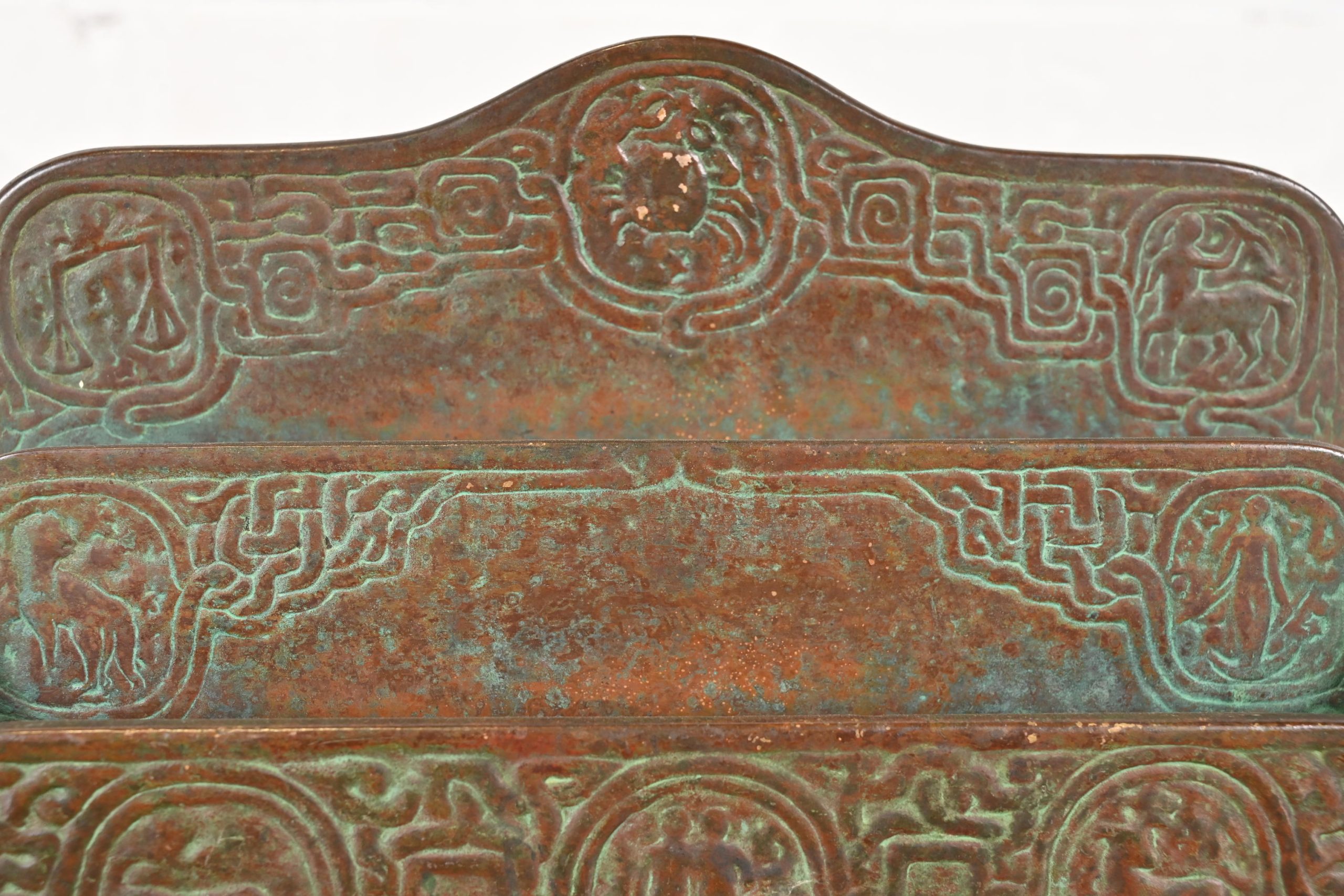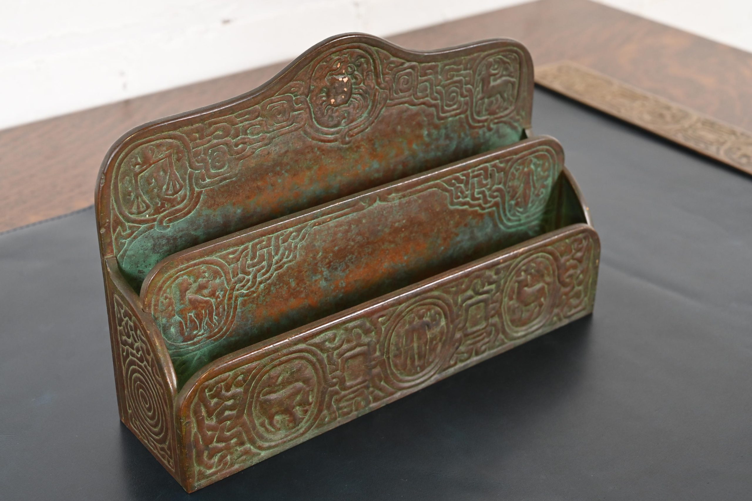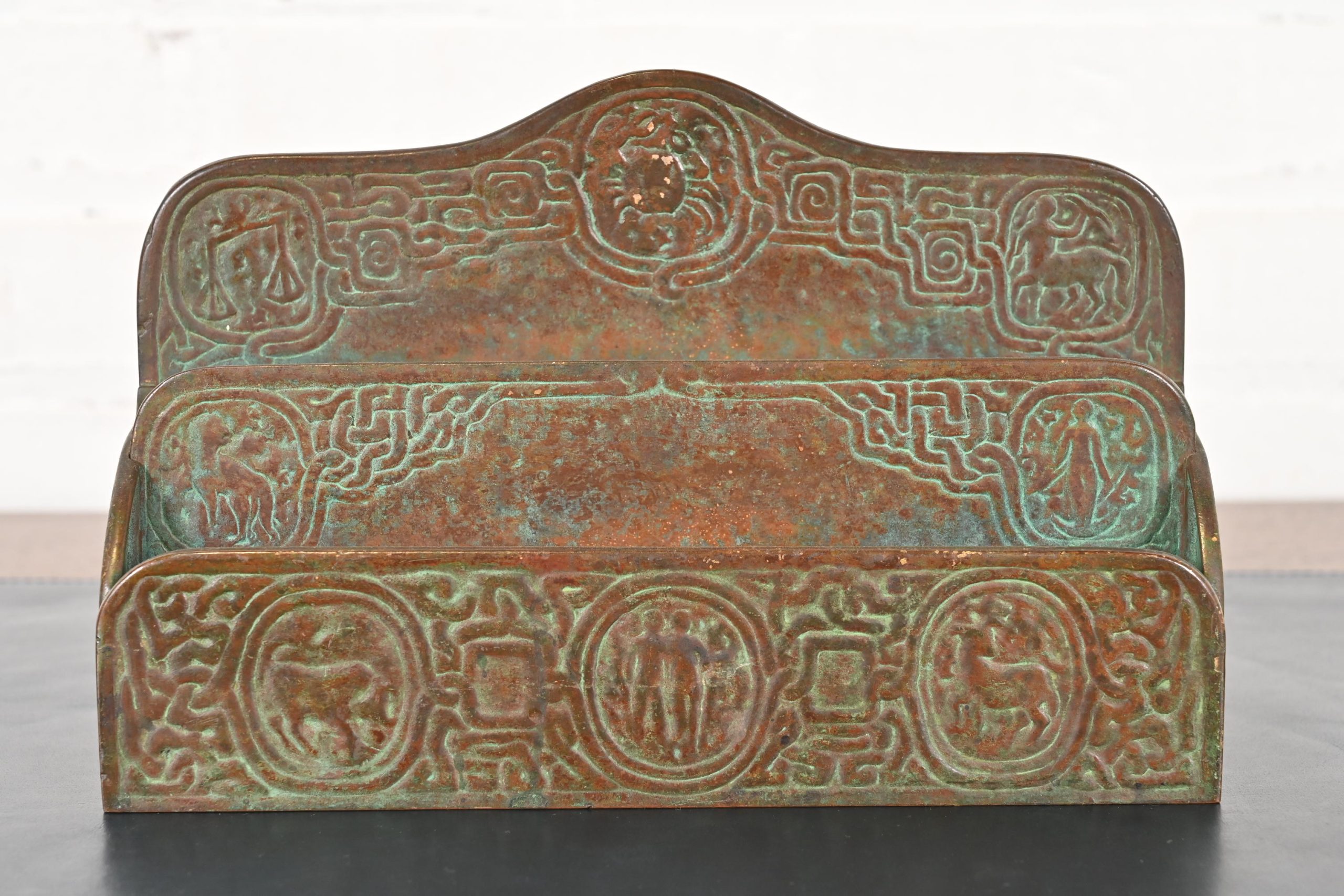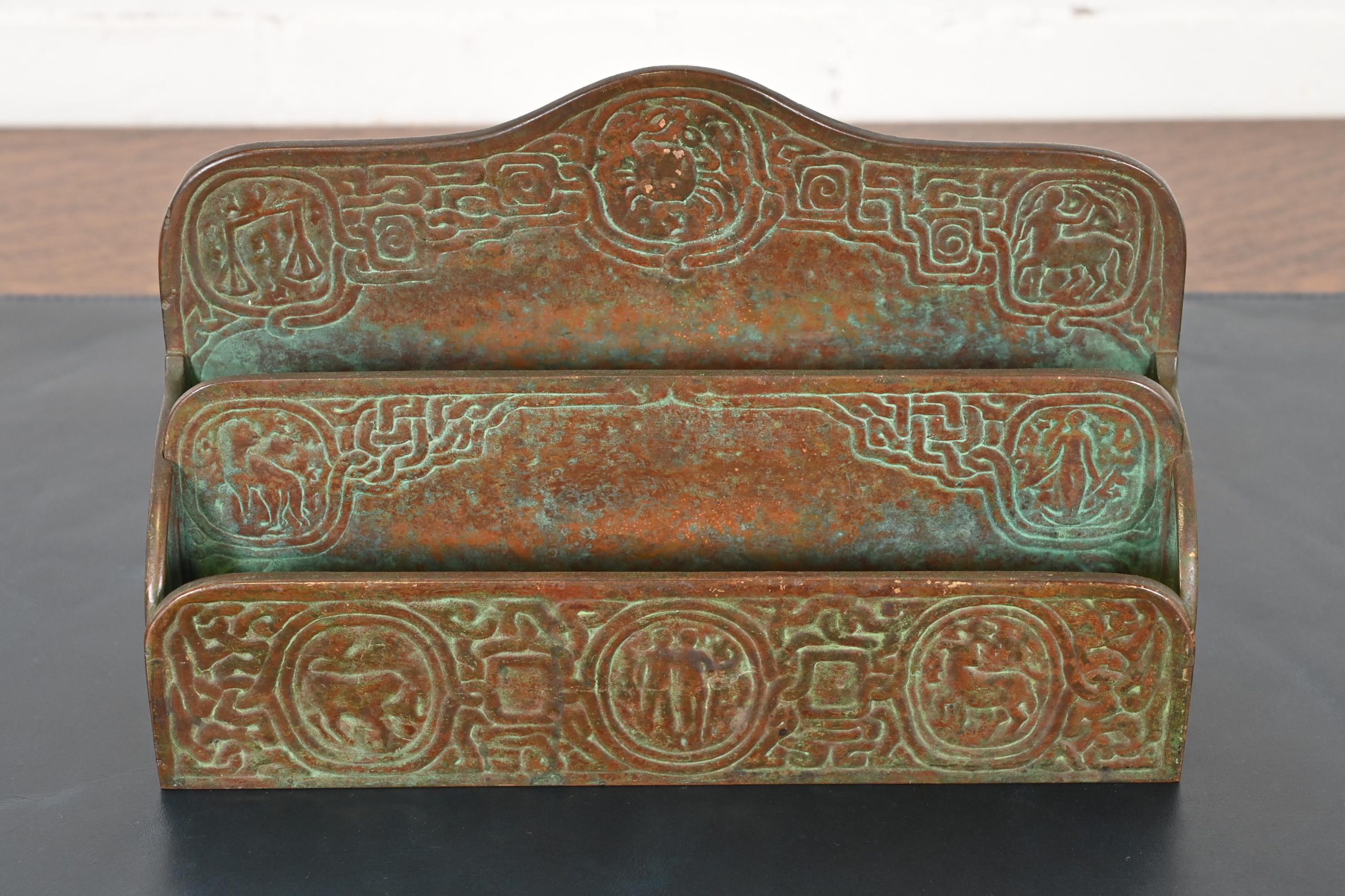 A gorgeous antique Arts & Crafts or Art Deco period bronze “Zodiac” pattern desk letter holder rack