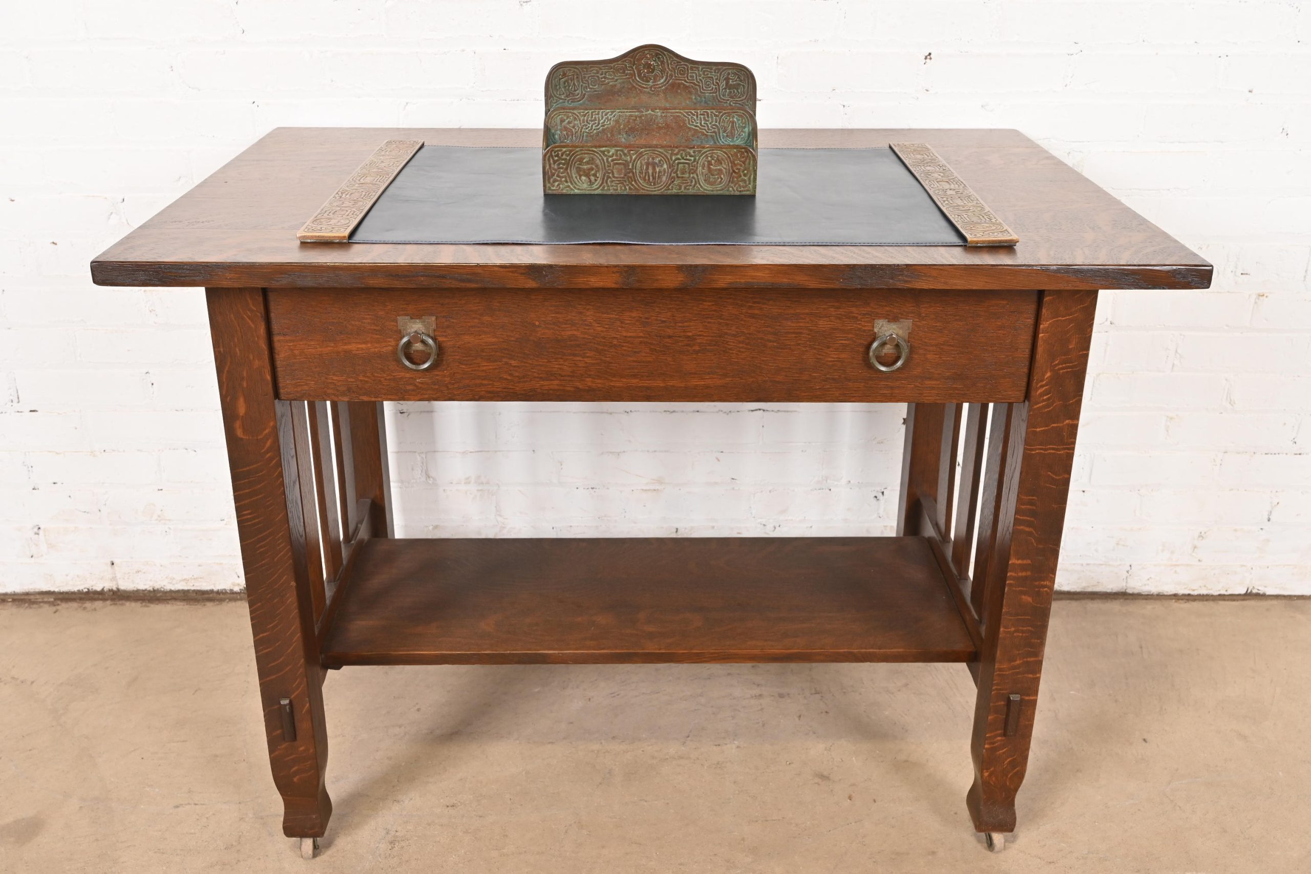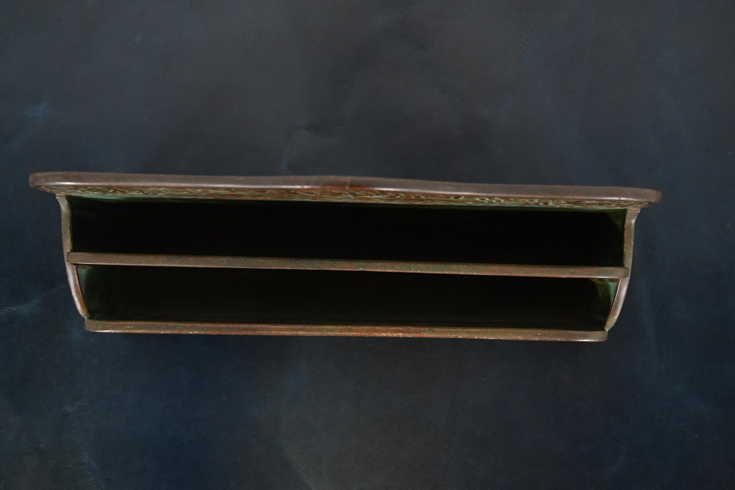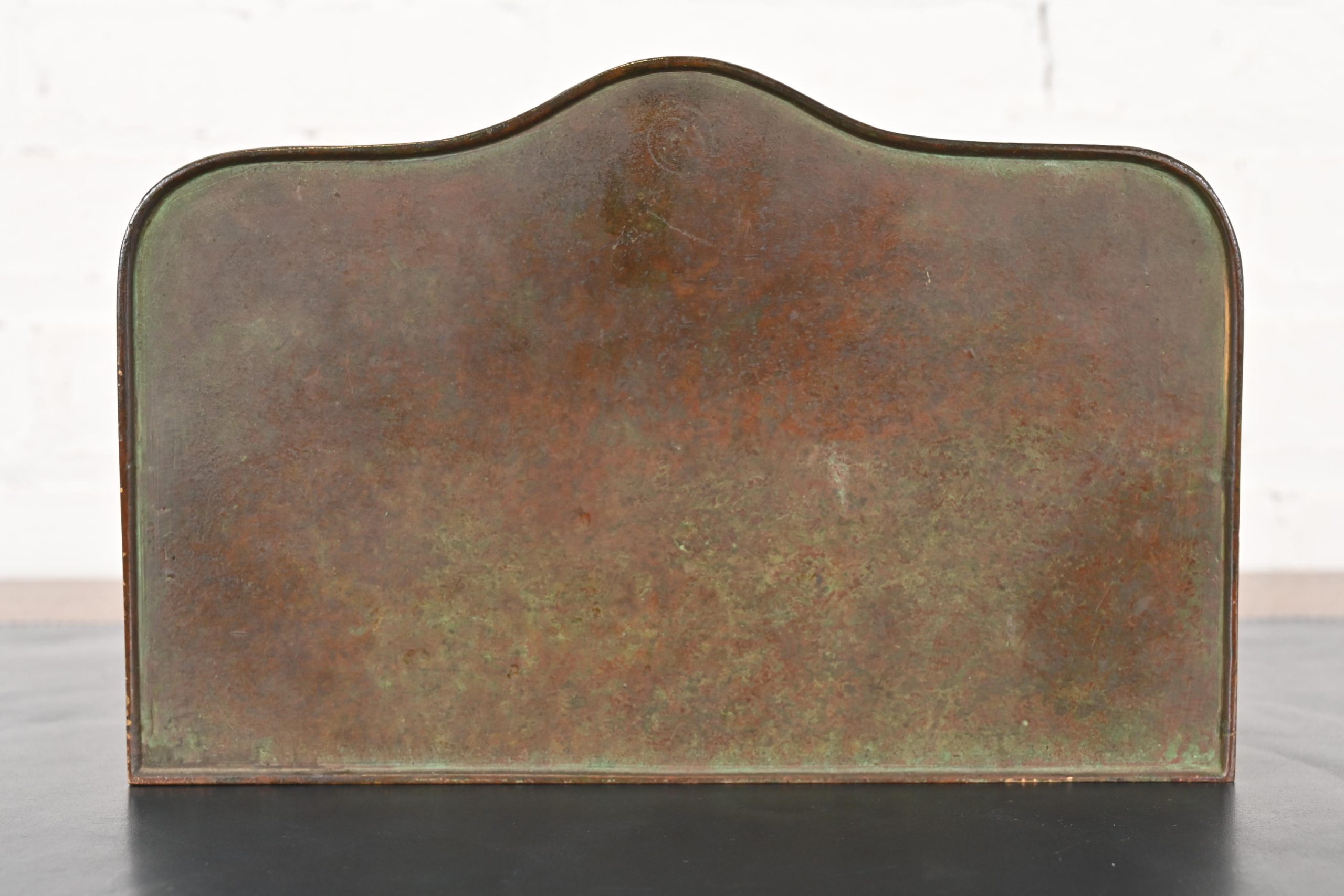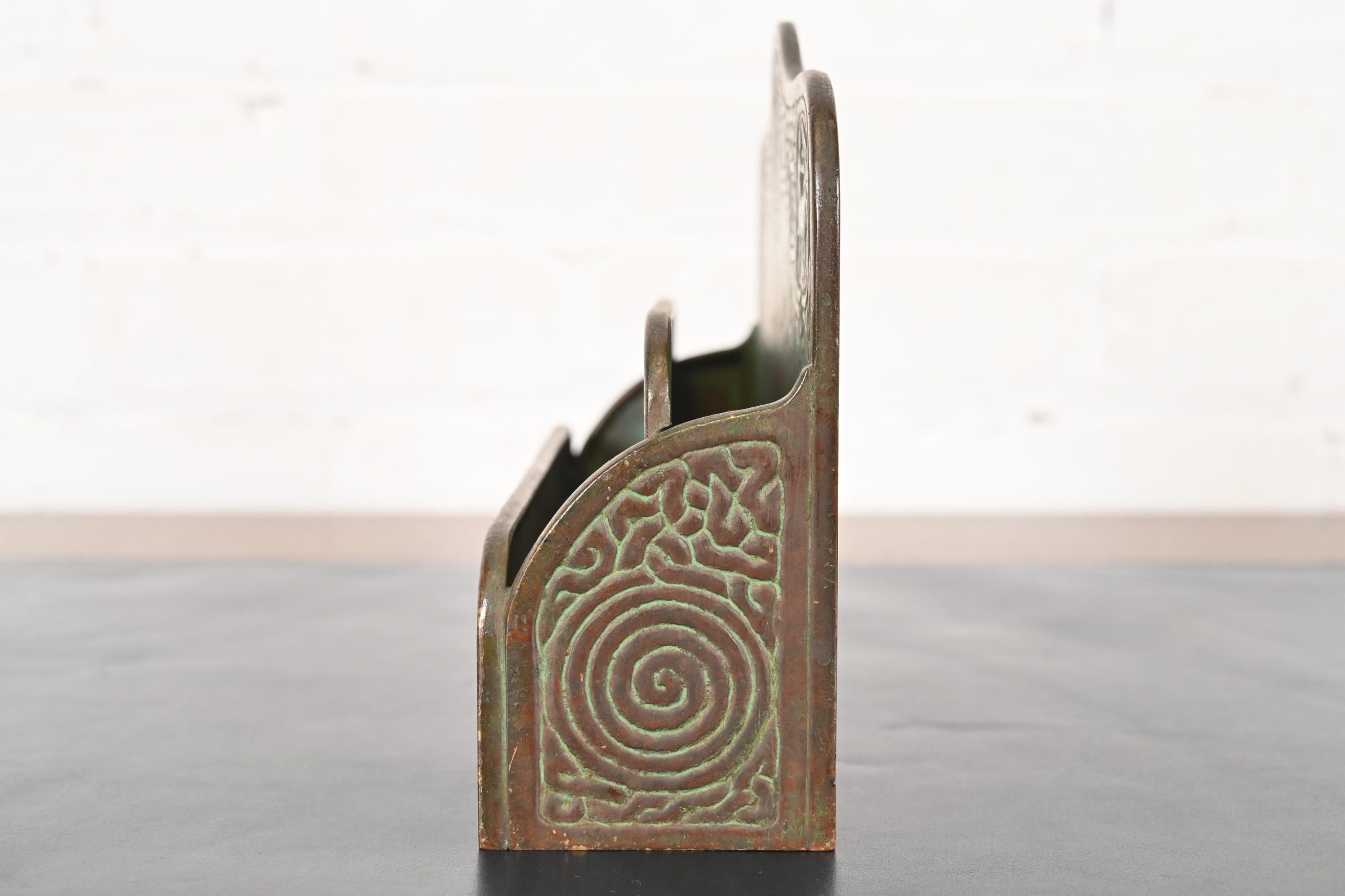A gorgeous antique Arts & Crafts or Art Deco period bronze “Zodiac” pattern desk letter holder rack