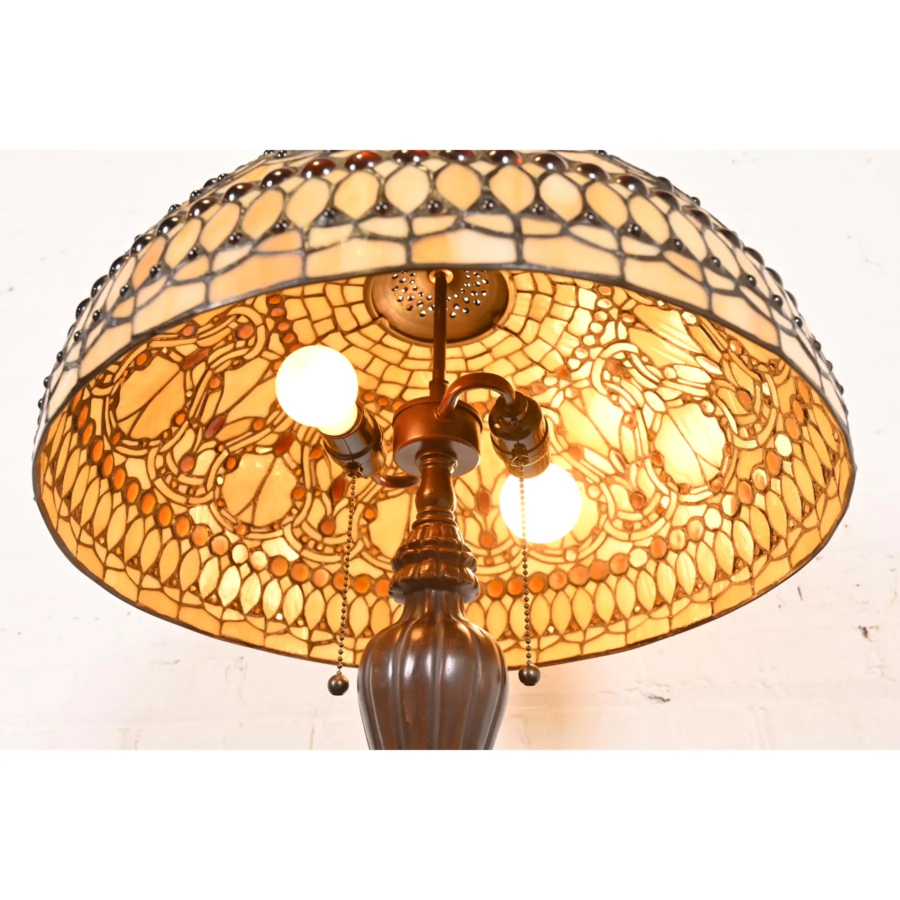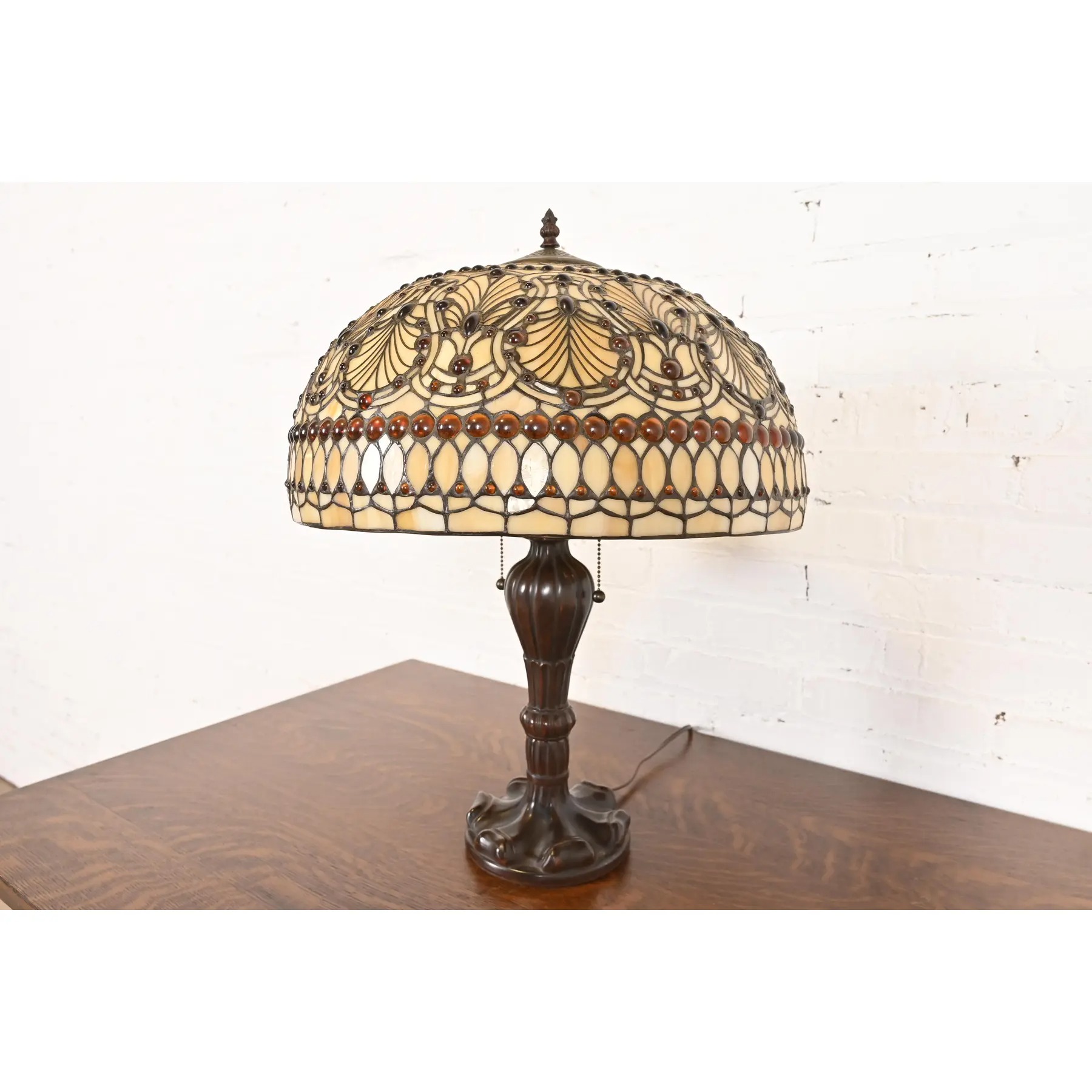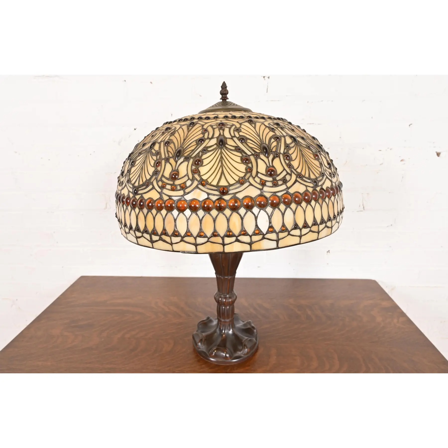 Tiffany Studios Style Arts & Crafts Table Lamp With Jeweled Stained Glass Shade