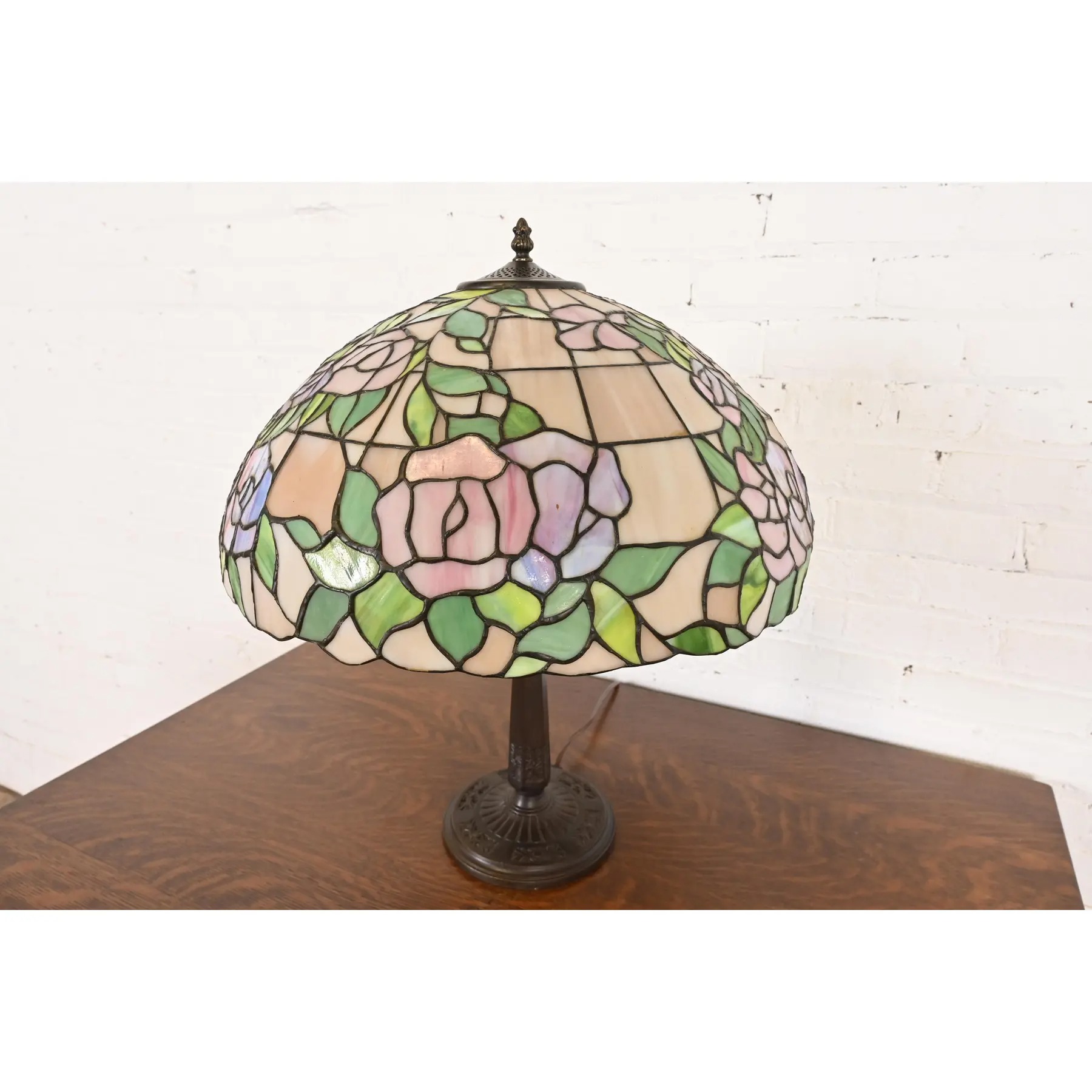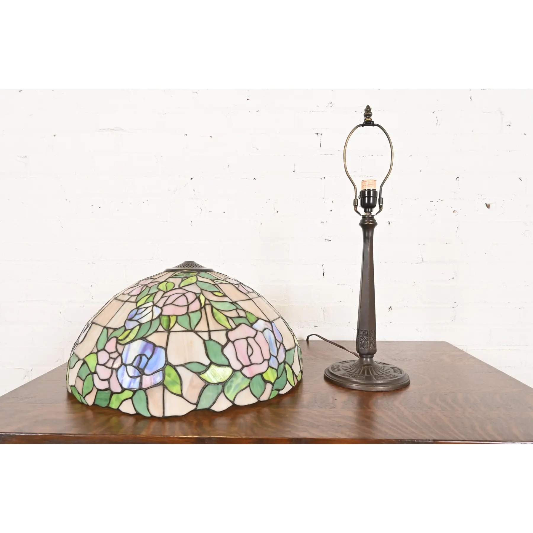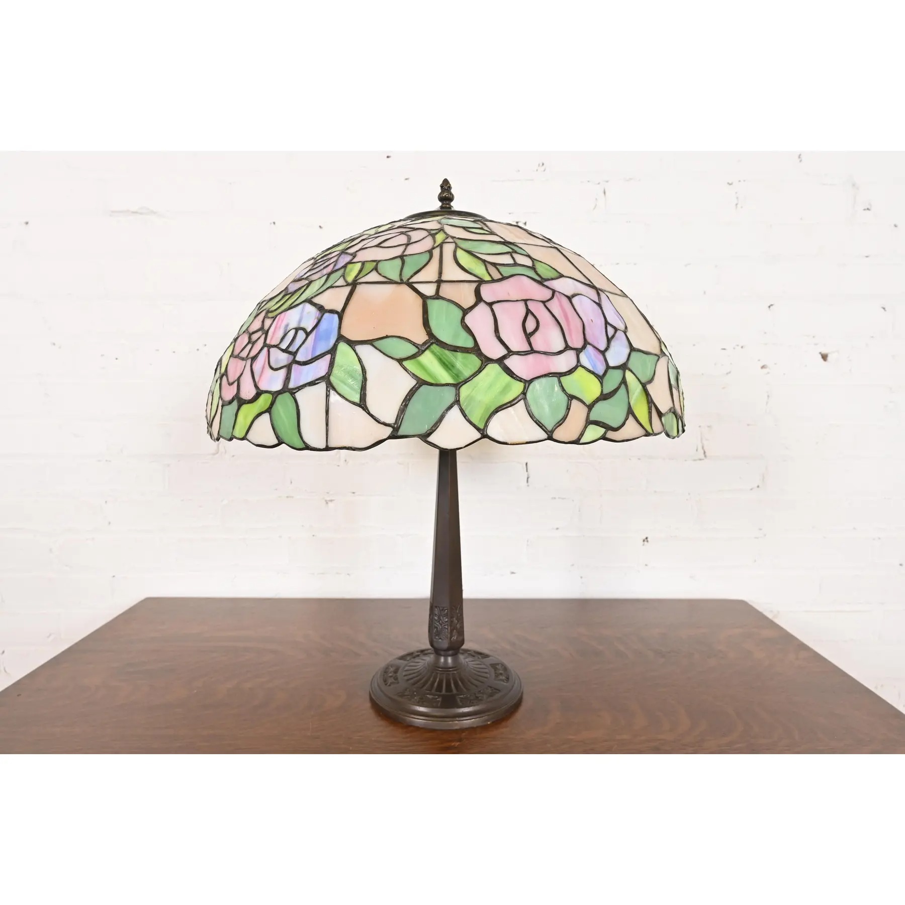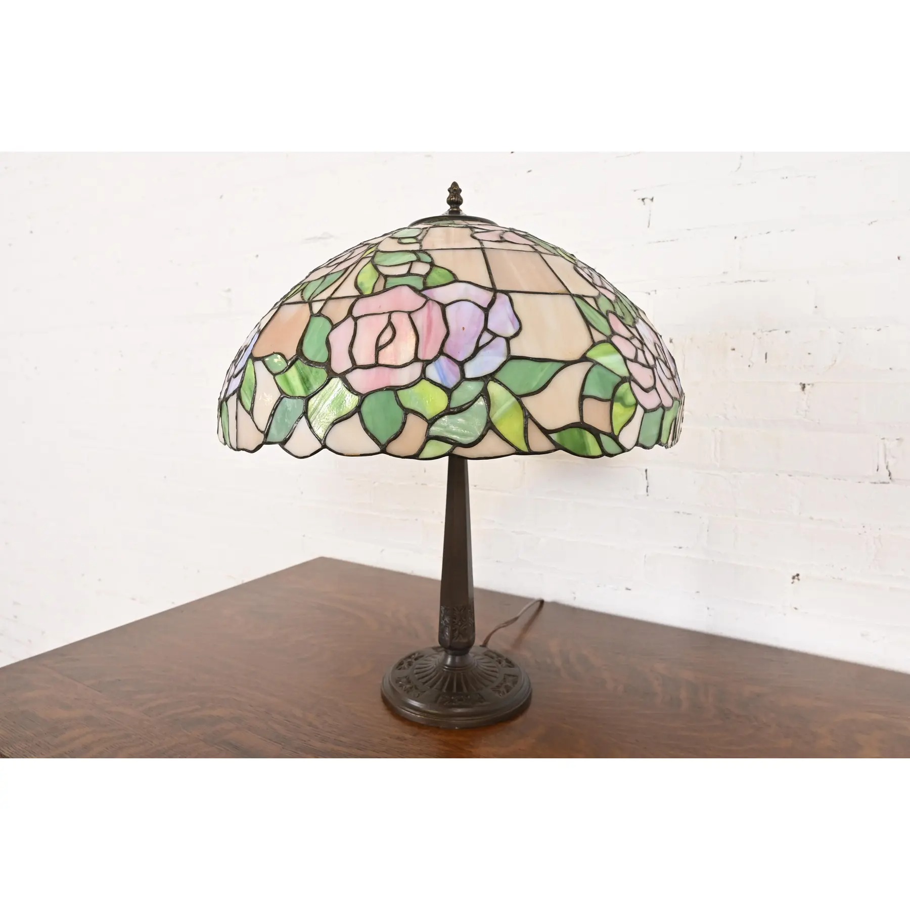 A gorgeous Arts & Crafts style table lamp with pink rose stained glass shade