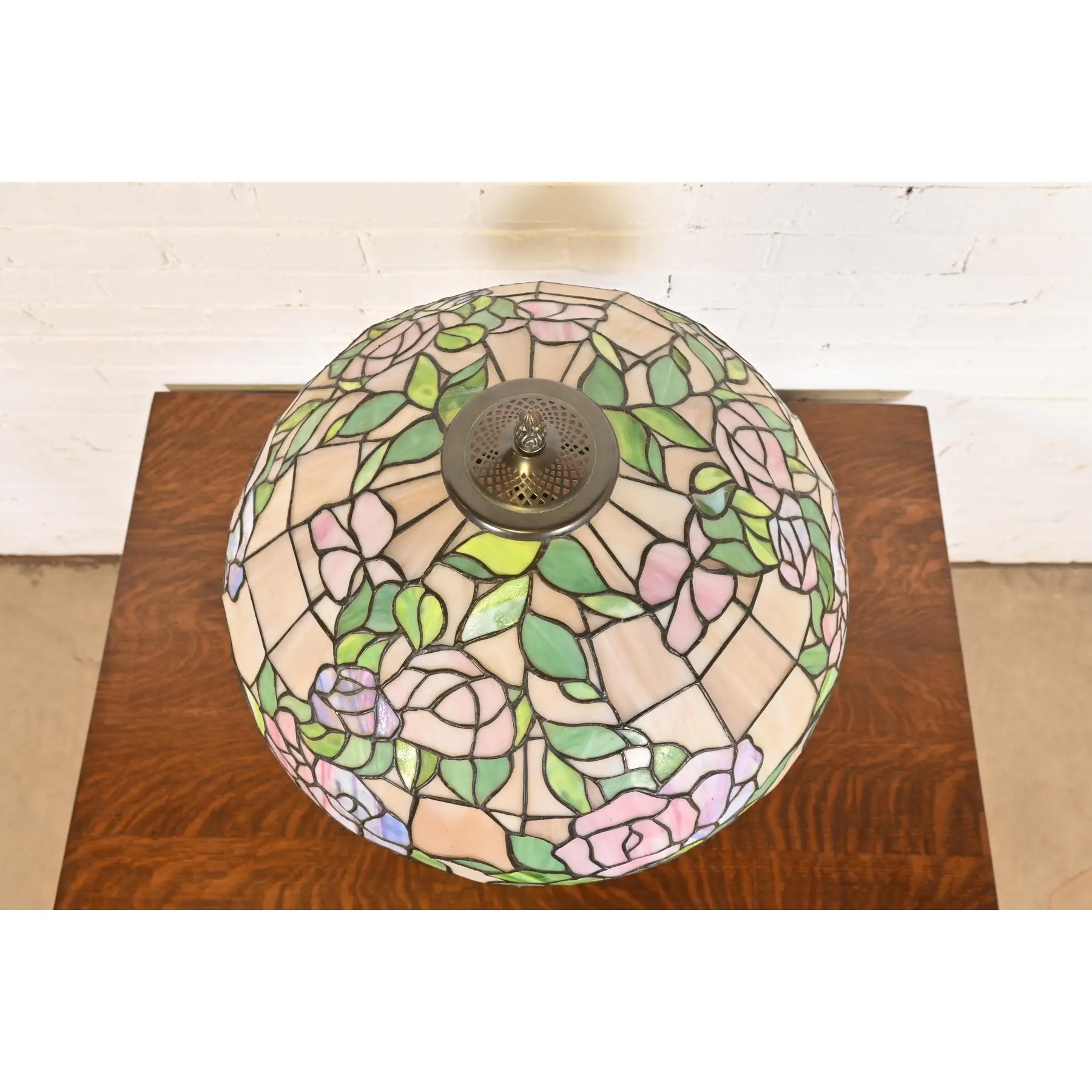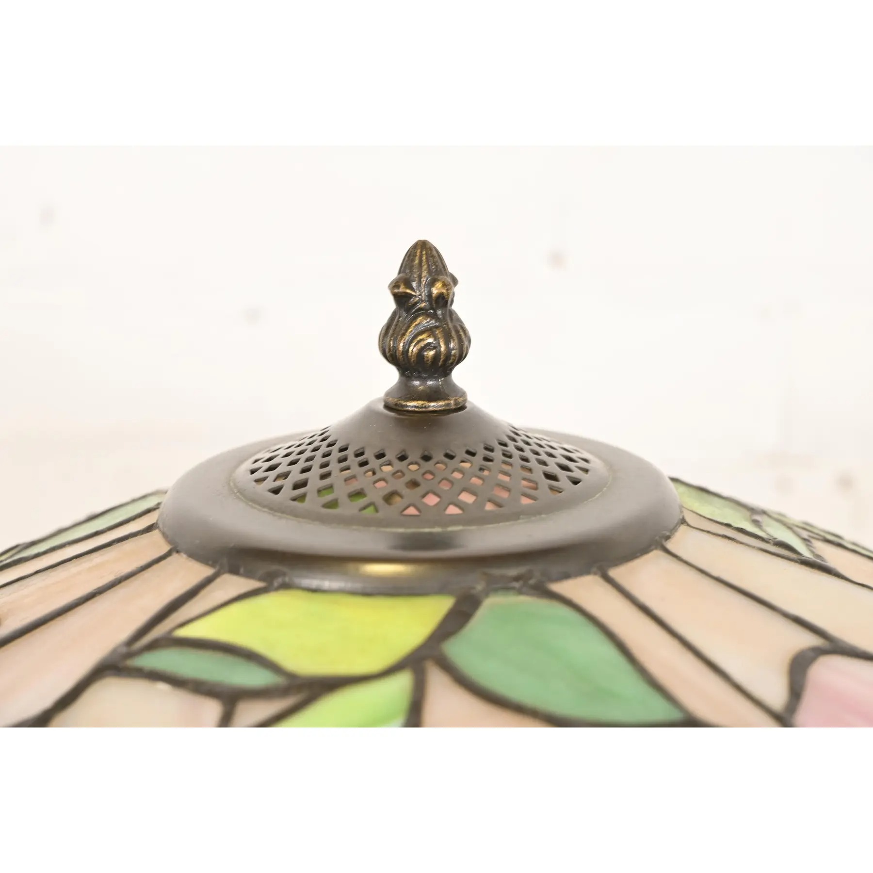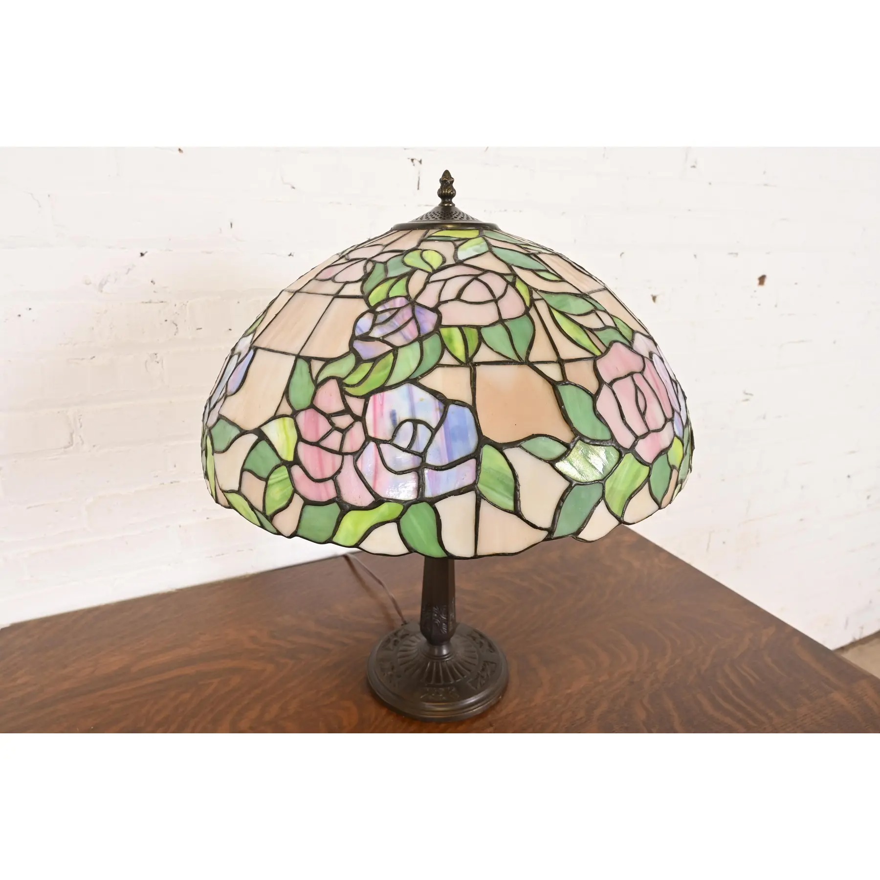 A gorgeous Arts & Crafts style table lamp with pink rose stained glass shade