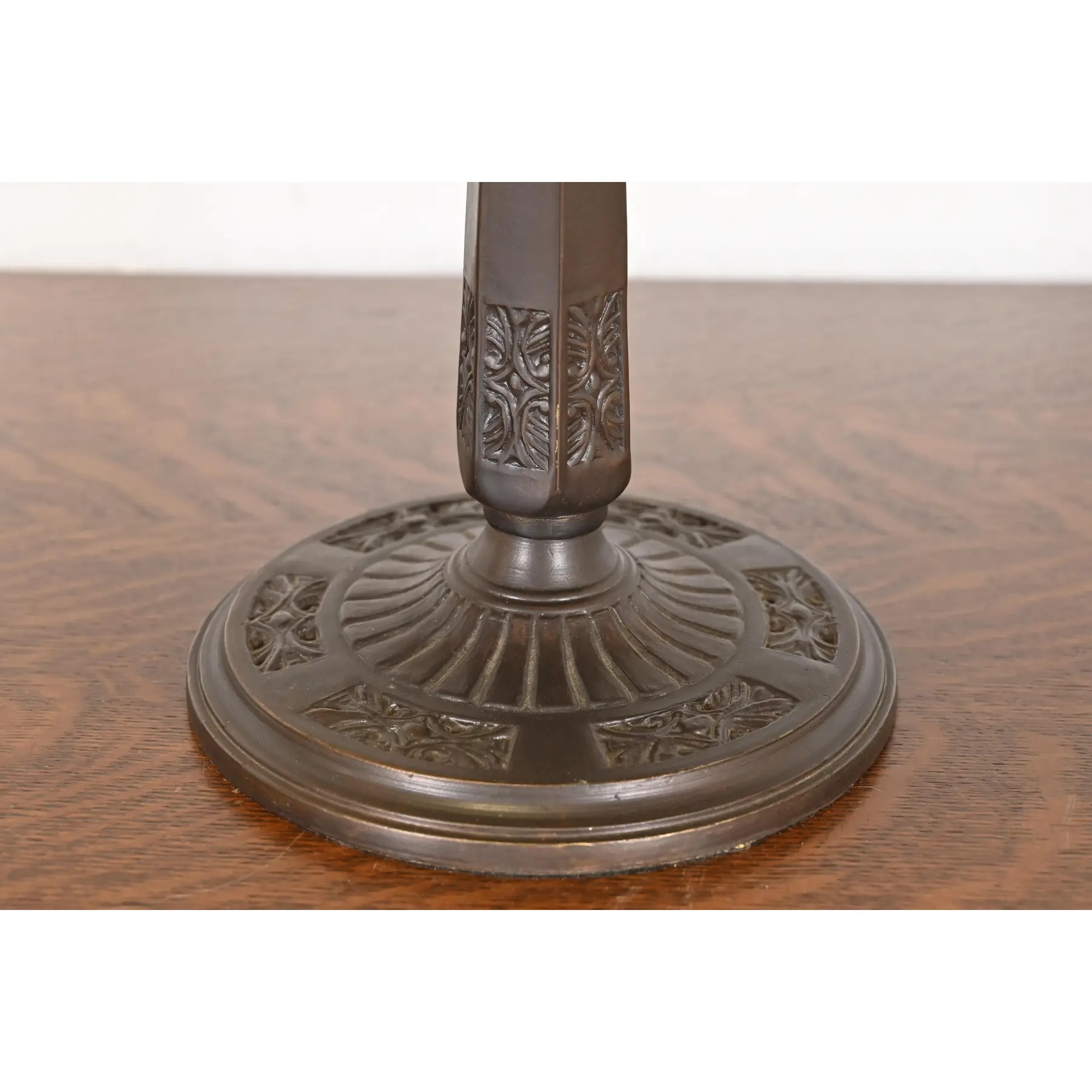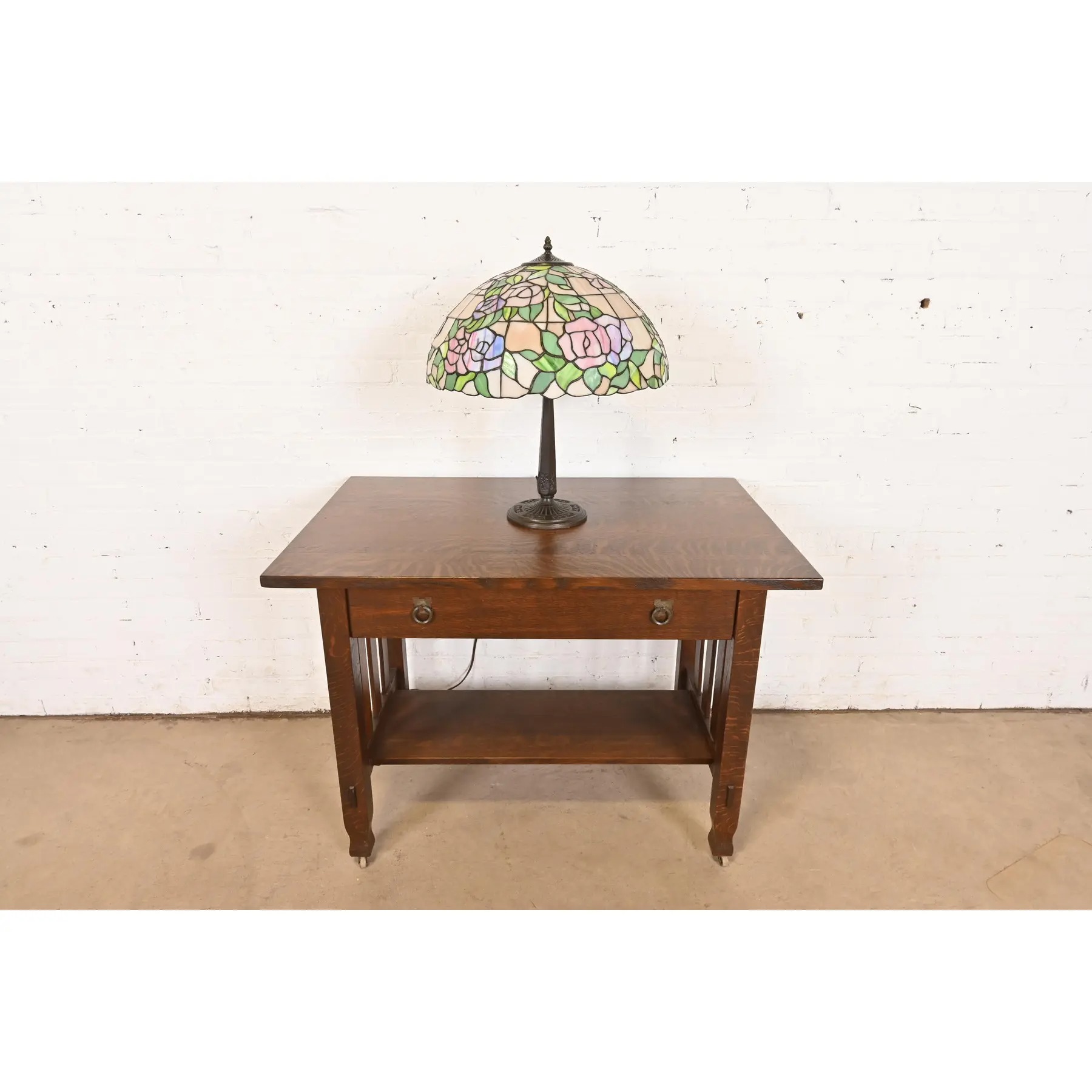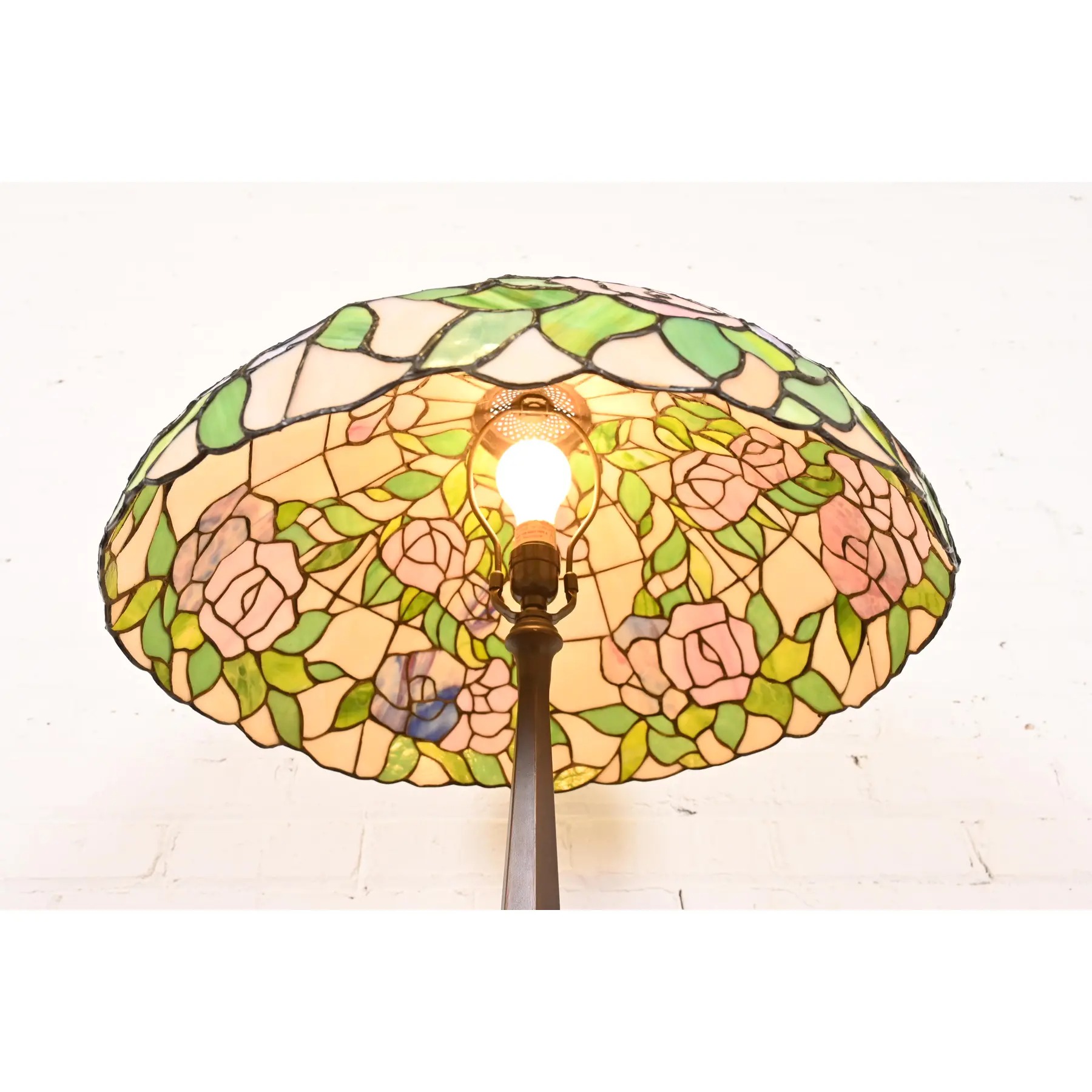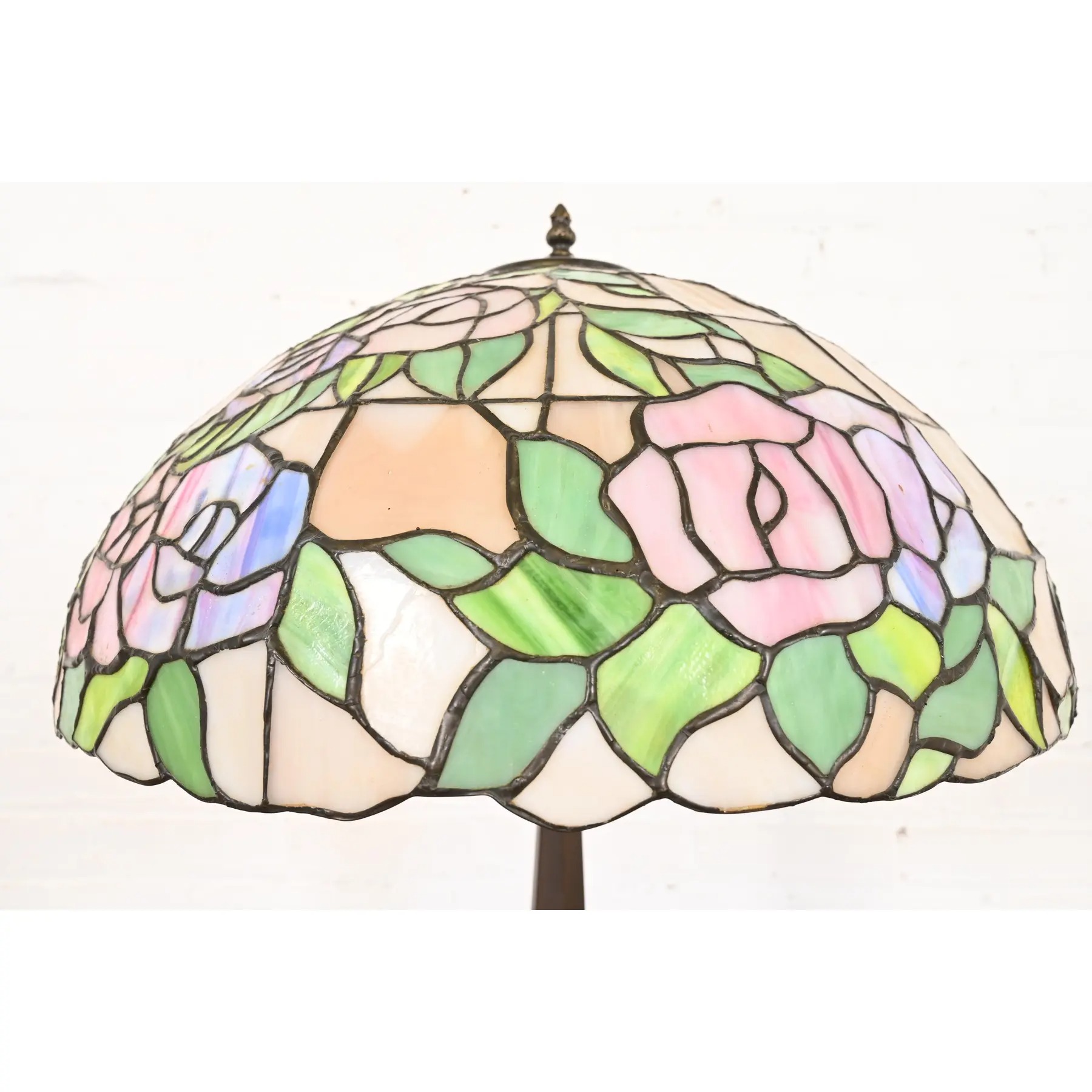 A gorgeous Arts & Crafts style table lamp with pink rose stained glass shade