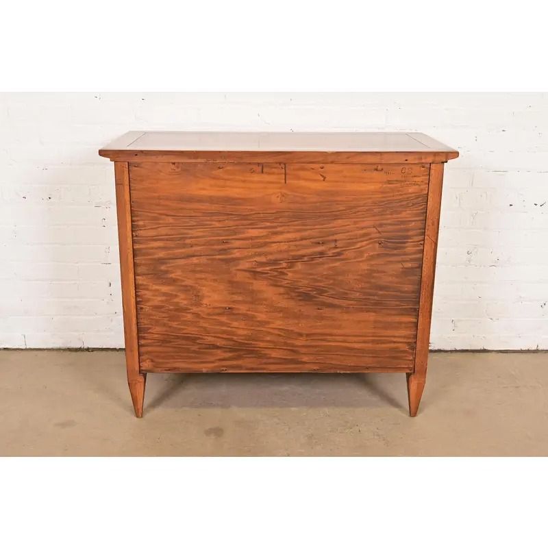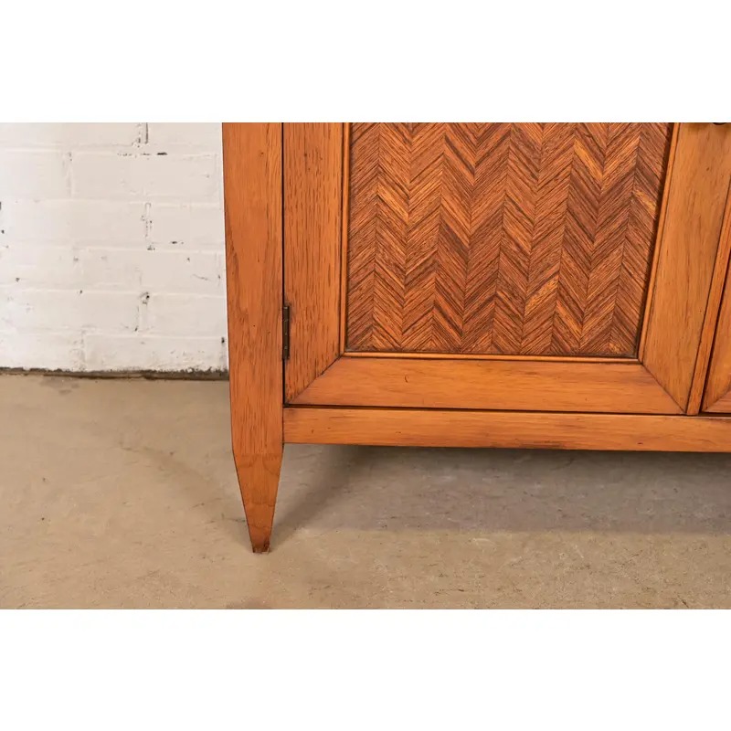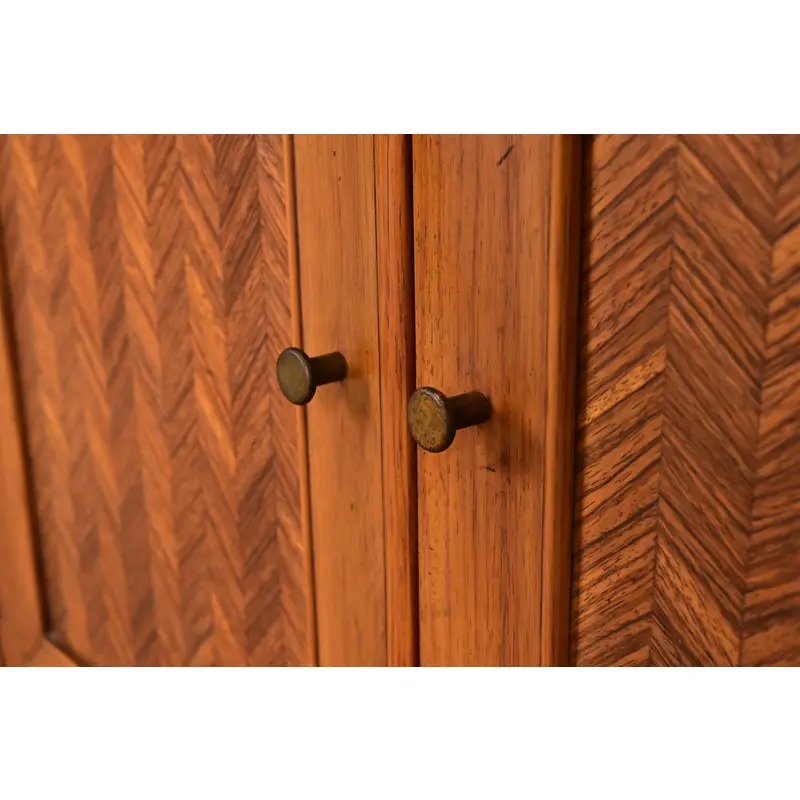 Walnut, with gorgeous inlaid chevron-patterned doors, and original brass hardware.