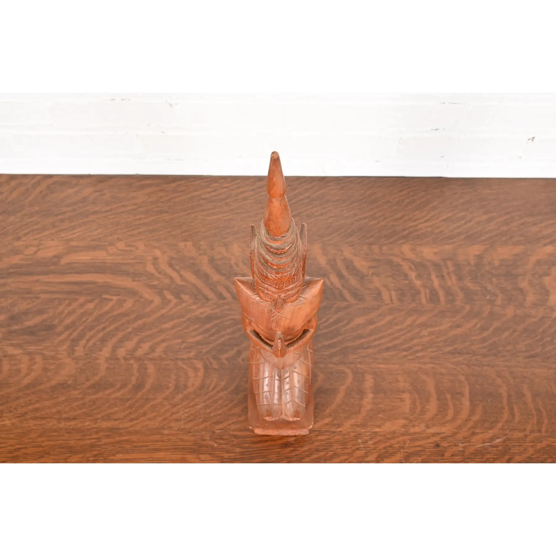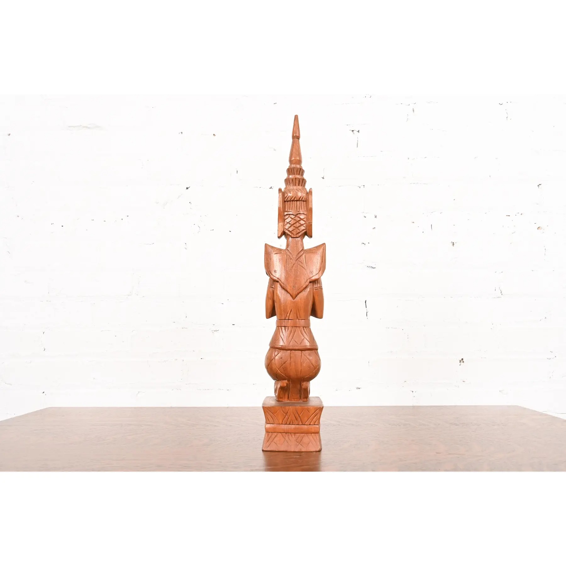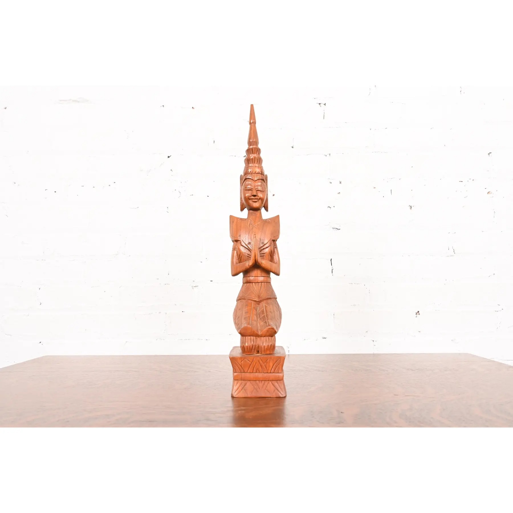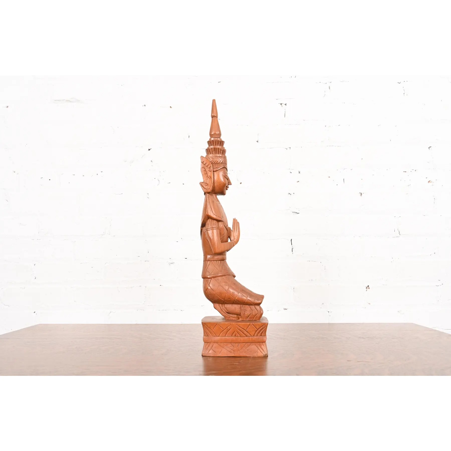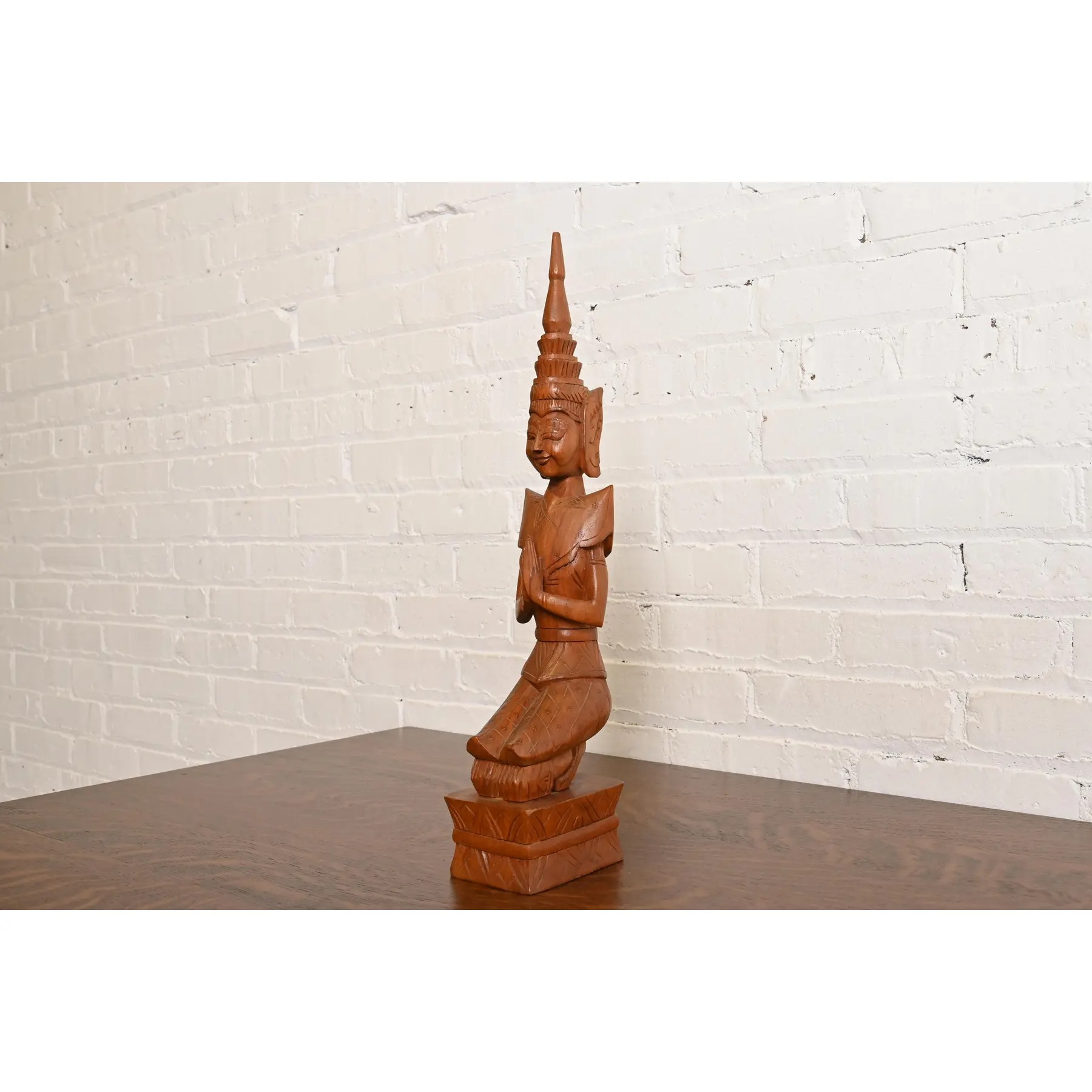 A beautiful hand-carved solid teak Thai Theppanom sculpture or statue depicting a celestial being kneeling in prayer